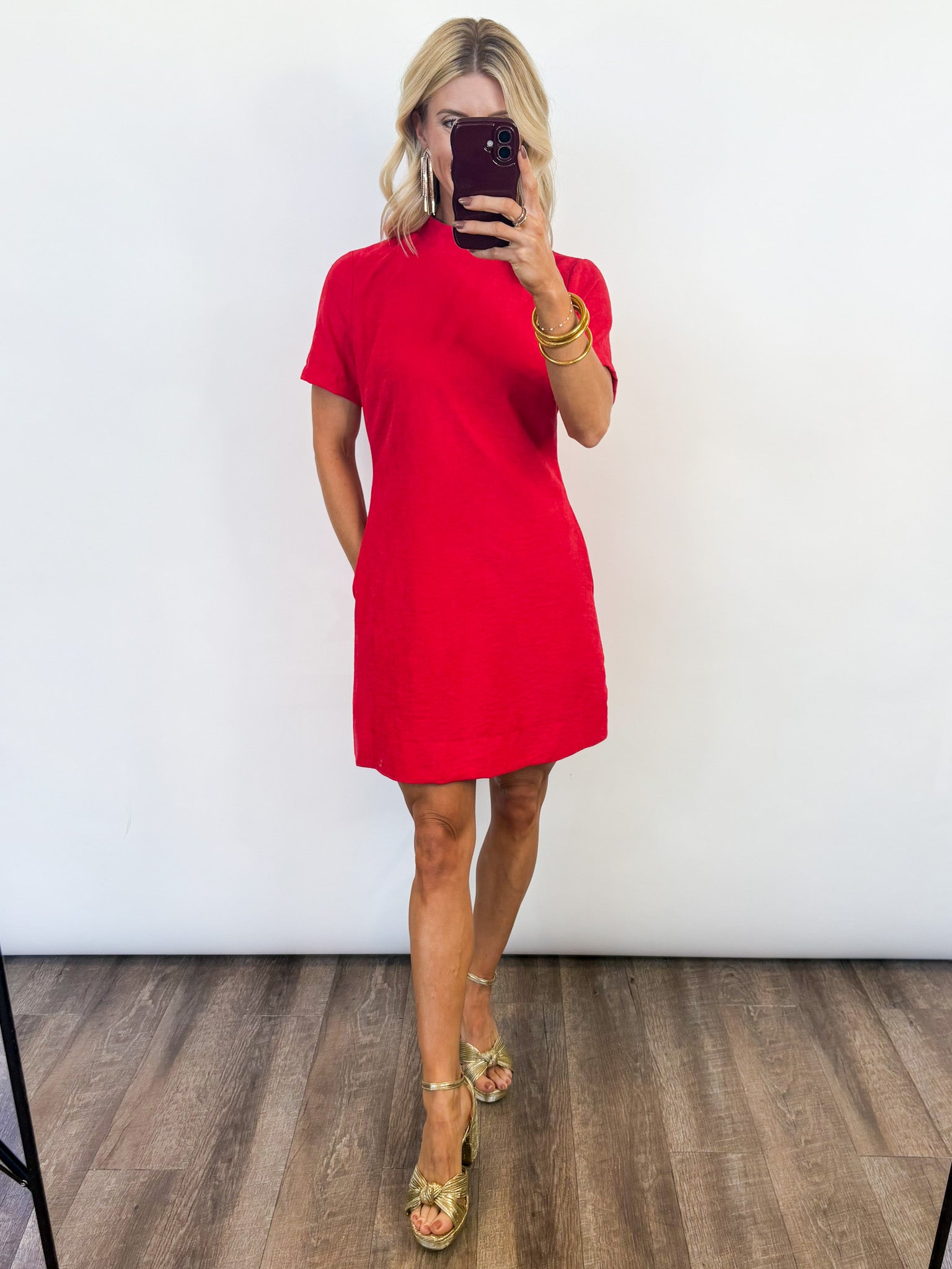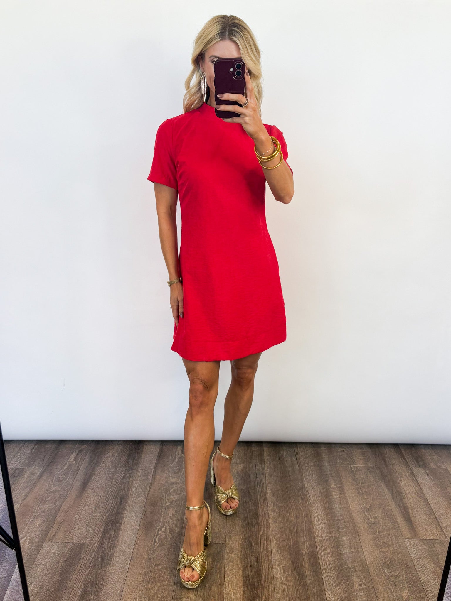 Classic, chic, and perfectly festive — the All Wrapped Up Dress is your holiday season essential. This stunning bright red mini features a clean, tailored silhouette from the front with a mock neckline and short sleeves for a refined, polished look. But the magic is in the back — a dramatic open-back cutout finished with an oversized statement bow that brings instant elegance and celebration energy. Sophisticated from every angle, this dress is made for Christmas gatherings, holiday photos, and festive nights out.