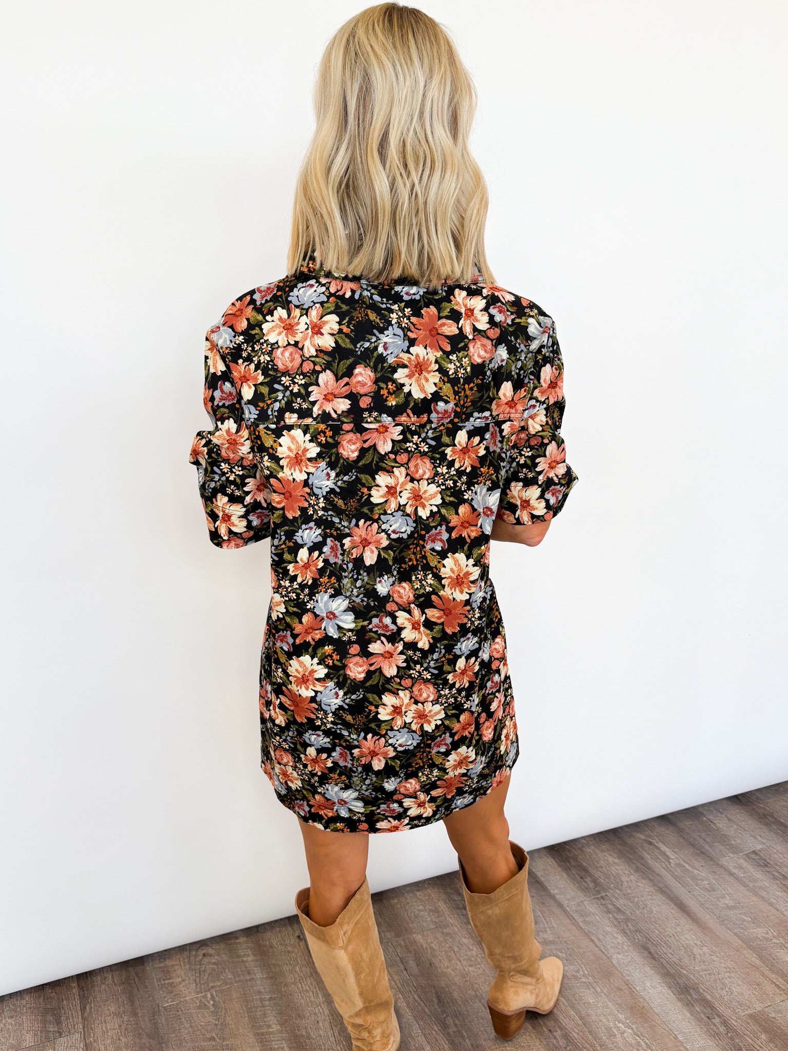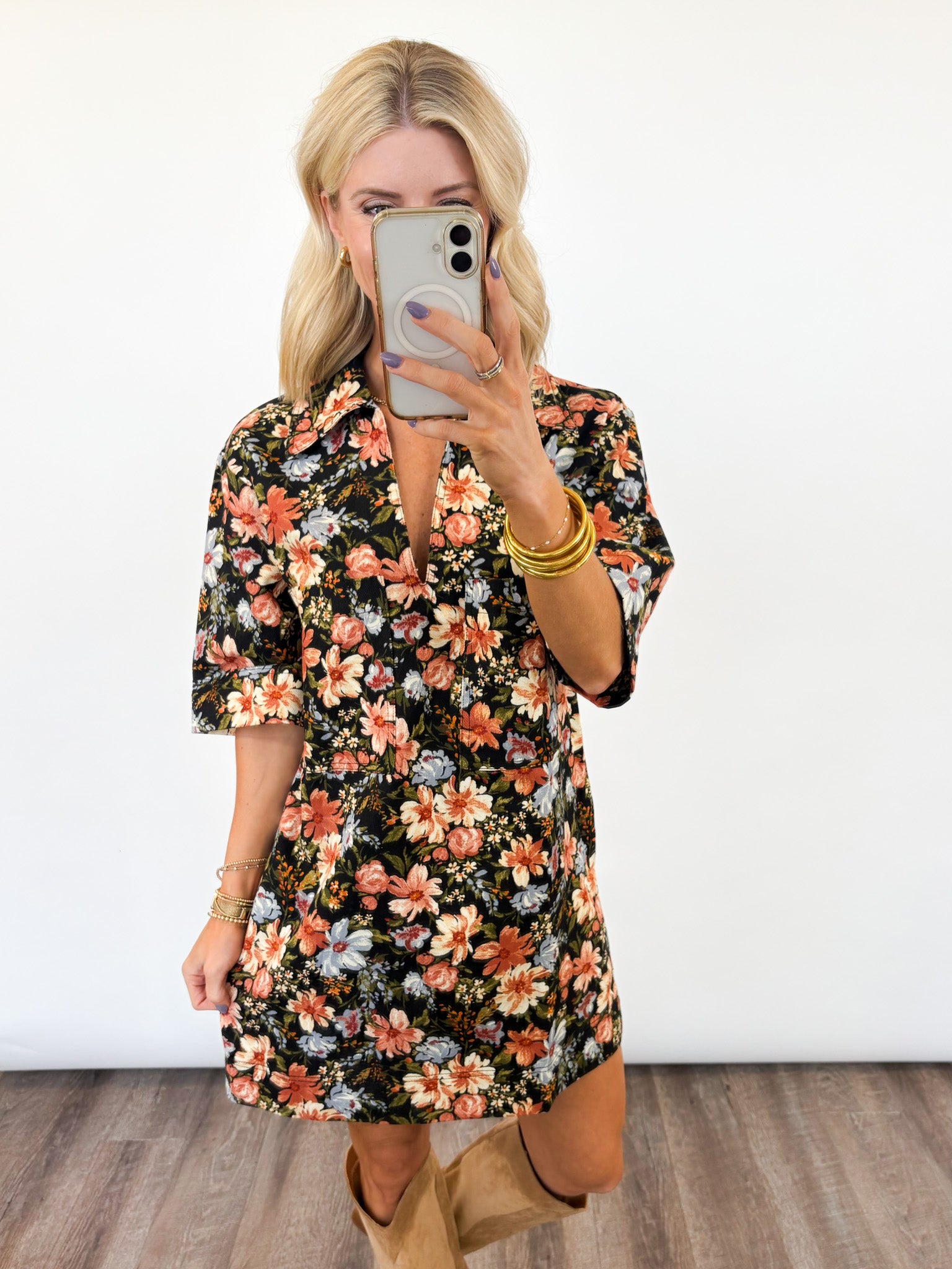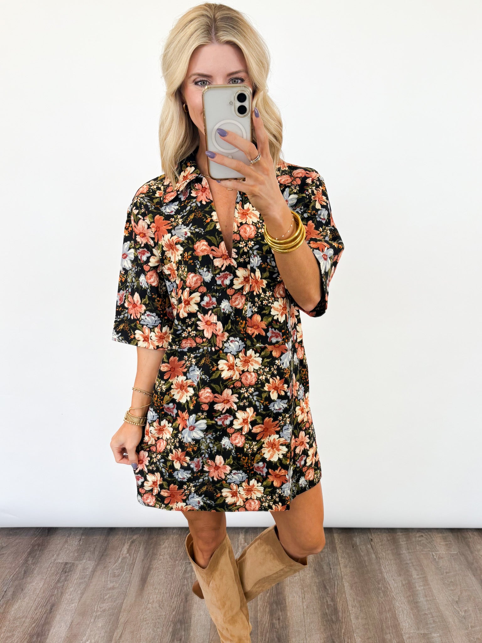 Step into the season with effortless charm in the Autumn Bloom Shift Dress. Bursting with rich fall florals in warm rust, golden mustard, and soft blue against a deep black backdrop, this dress is the perfect balance of cozy and chic. The collared neckline and relaxed silhouette make it easy to wear, while the bold floral print ensures you’ll stand out at any fall gathering. From pumpkin patch strolls to festive fall dinners, this dress is a seasonal staple that pairs perfectly with boots or flats. Add a cozy cardigan for a layered autumn look you’ll reach for again and again. Model is 5'4", size 0/24, 115lbs. and wearing a small.