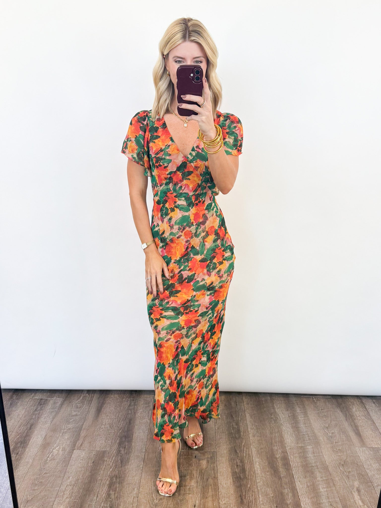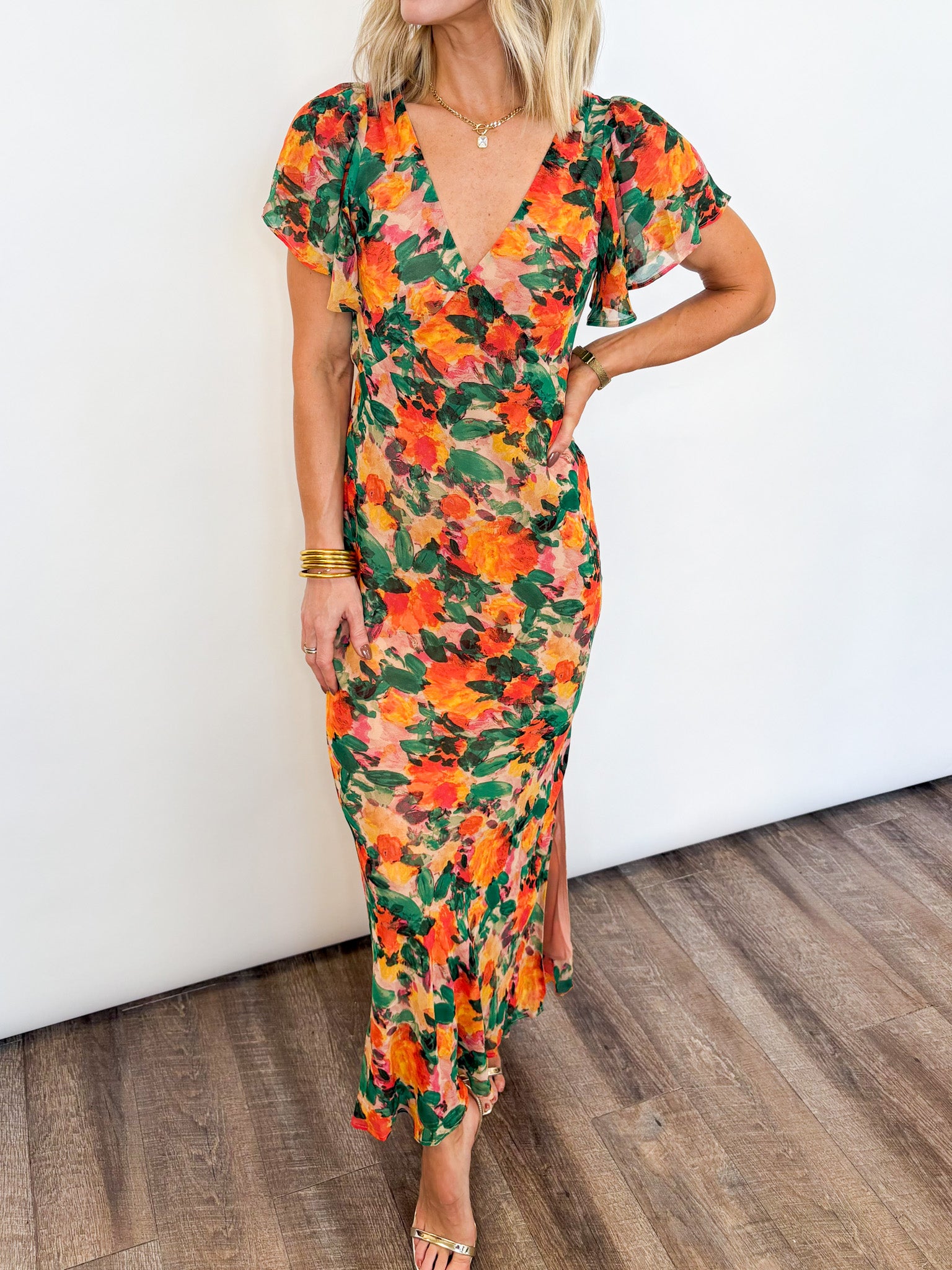Bring vibrant color and effortless elegance to your wardrobe with the Autumn Glow Floral Maxi Dress. Featuring a painterly mix of bold orange, golden yellow, and deep green florals, this maxi is perfect for making a statement while staying chic and feminine this Fall. The flattering V-neckline, flutter sleeves, and floor-skimming silhouette create a graceful shape, while a side slit adds just the right touch of movement and allure.