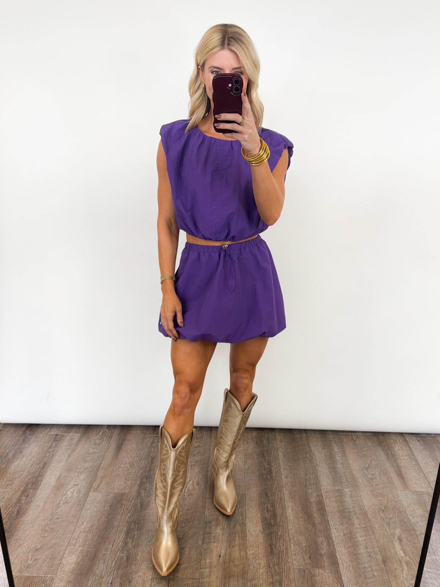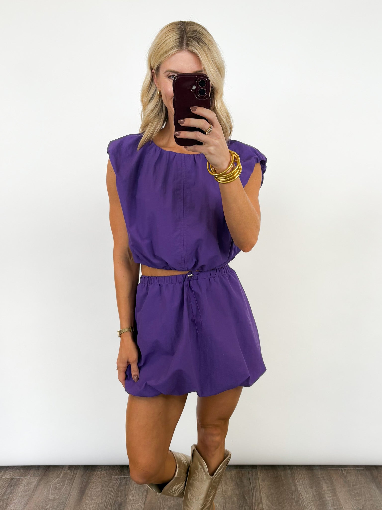 Bring the spirit, the style, and the spotlight to game day with the Bayou Bengals Bubble Set. This bold two-piece features a bubble hem top and matching bubble hem skirt in a vibrant LSU purple that’s made for standing out in the crowd. With its playful shape and flattering fit, this set is the ultimate mix of school pride and fashion-forward edge. The model is a size 0/24, 115lbs, 5'4", and wearing a small.