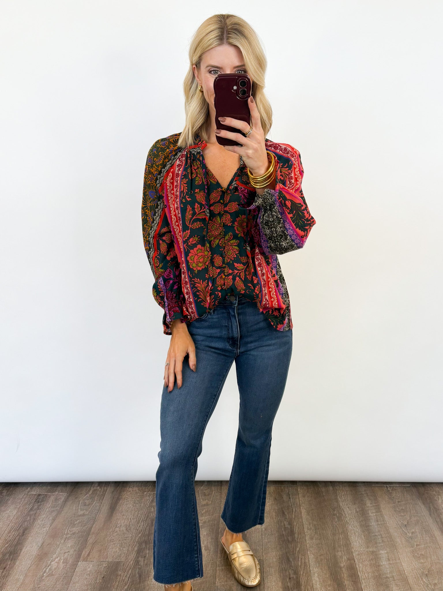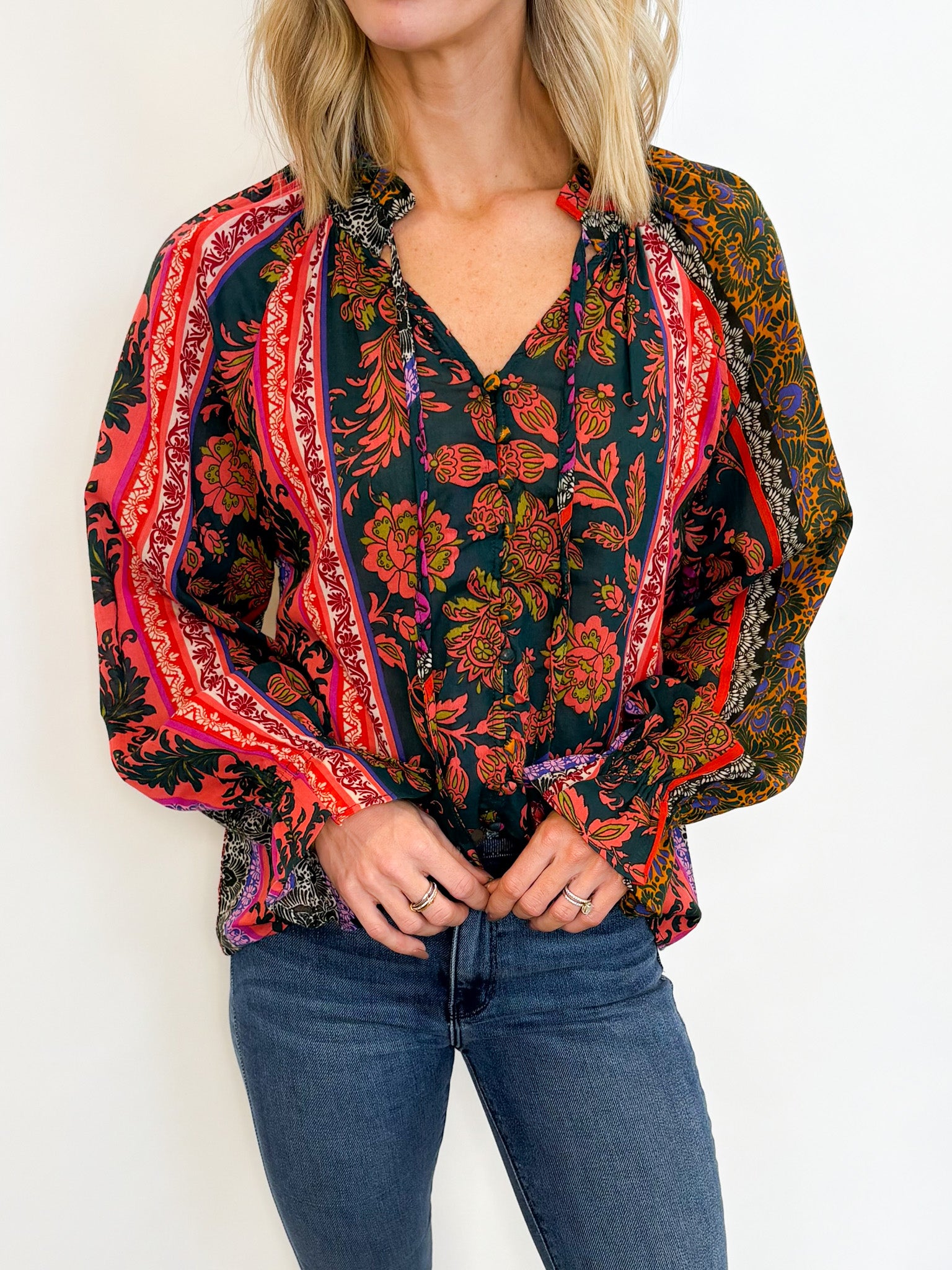 Channel effortless bohemian charm with the Boho Bloom Button-Up Blouse. Designed in a rich mix of jewel tones and vibrant florals, this blouse features a patchwork-inspired print with vertical stripe accents that elongate the silhouette. The lightweight fabric and relaxed fit make it perfect for layering or wearing on its own, while the button-front closure and gathered details add a polished yet free-spirited touch.