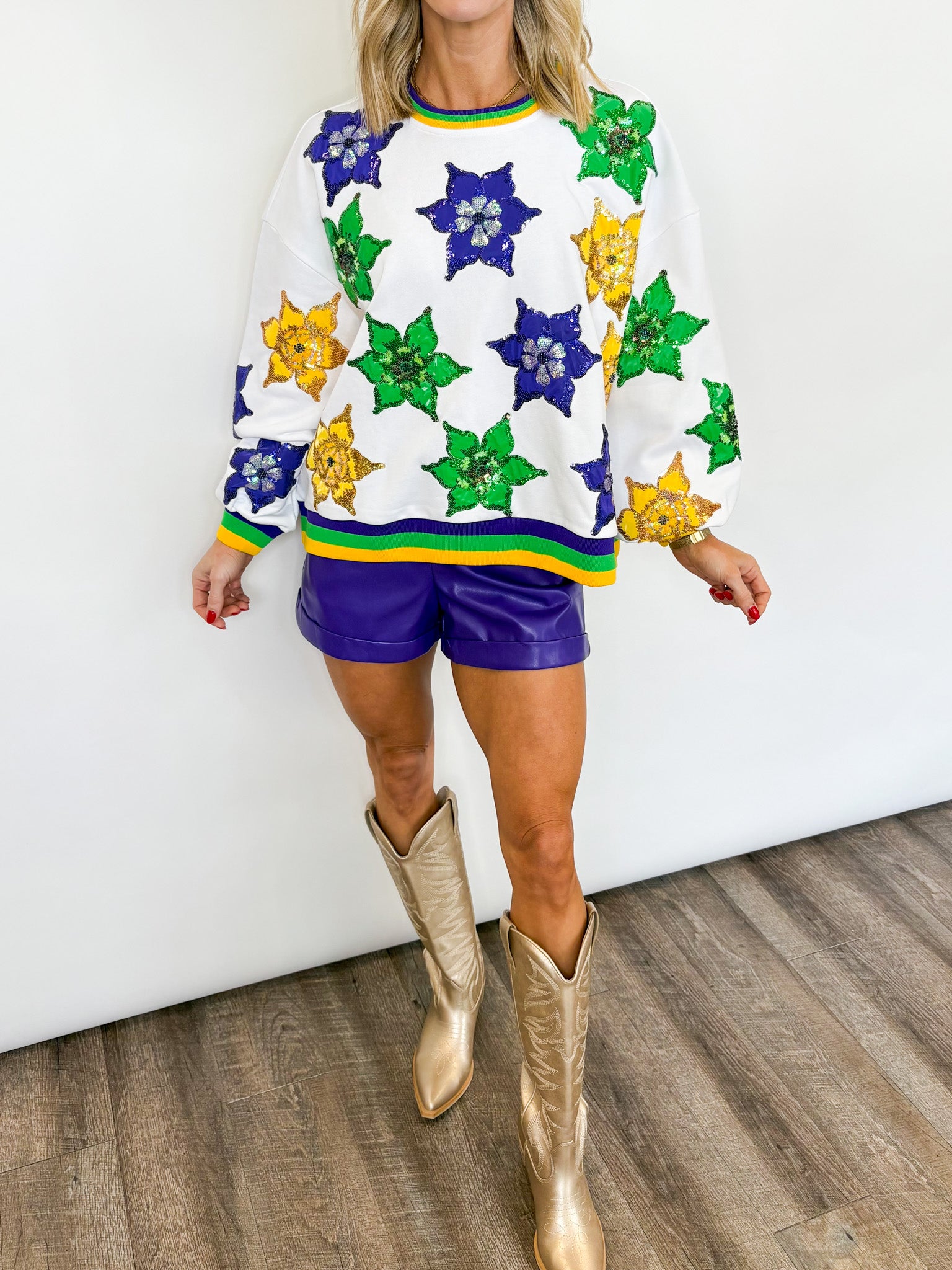 Bring the party wherever you go in this festive Carnival Bloom Sweatshirt—the ultimate Mardi Gras must-have! Covered in bold purple, green, and gold floral sequins on BOTH the front and the back, this cozy statement piece shines from every angle. Whether you’re headed to a parade, a ball, or just living your best Mardi Gras life, this sweatshirt delivers sparkle, comfort, and celebration all in one. Let the good times roll… and sparkle!