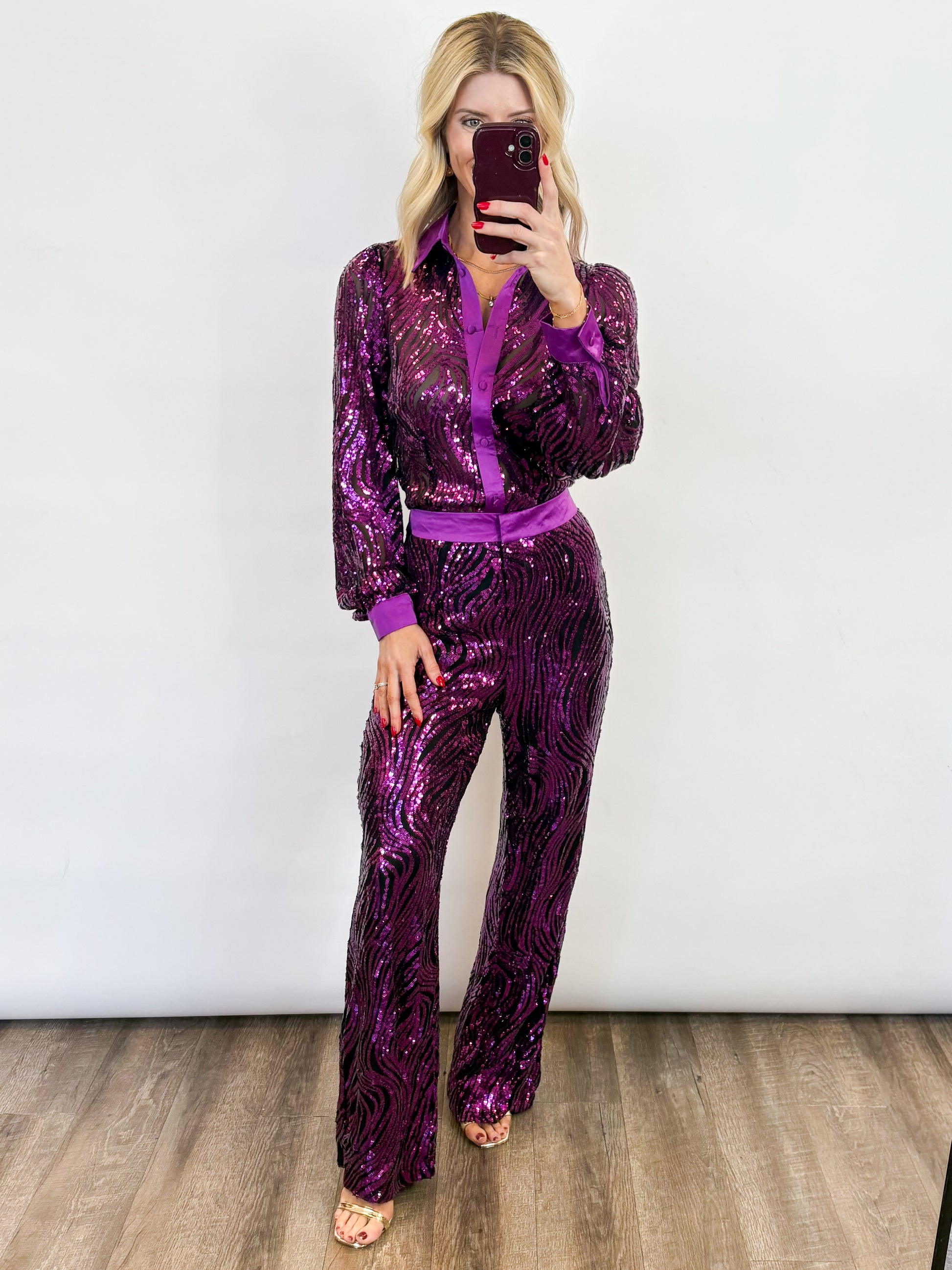 All eyes on YOU this Mardi Gras season. Our Carnival Queen Sequin Set is a show-stopping two-piece made for the bold, glamorous, and celebration-ready girl. Covered in shimmering purple sequins with a chic pattern, this matching top and pant set delivers maximum sparkle with sophisticated Mardi Gras flair. The collared button-front top with satin trim and matching high-waist trousers create a sleek, flattering silhouette that moves beautifully while you dance, celebrate, and shine all night long.