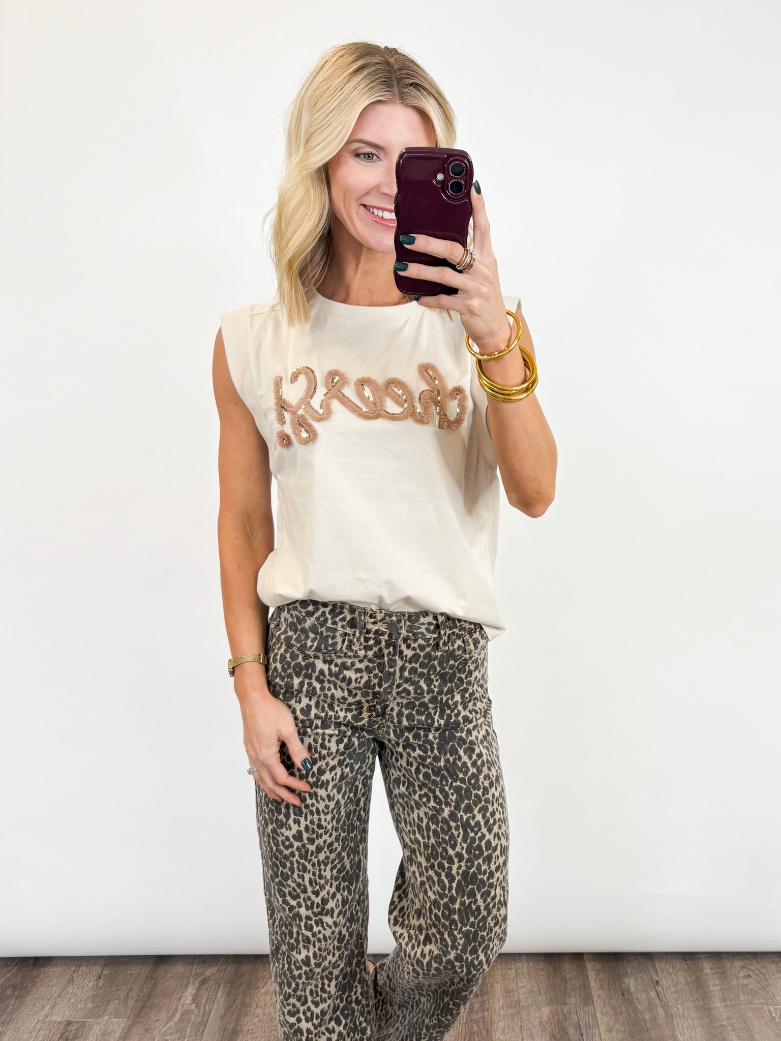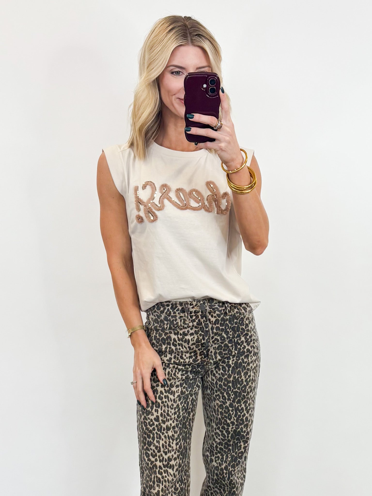 Raise a glass to effortless style with our “Cheers!” Sleeveless Tee—the perfect blend of casual comfort and playful charm. This soft, neutral-toned top features a textured chenille-style “cheers!” applique across the front, giving it a fun, celebratory vibe that works year-round. Whether you’re headed to brunch, hosting a get-together, or just want your outfit to bring a little joy to the day, this tee does it all with ease. The relaxed fit and sleeveless cut make it a breezy, flattering choice that pairs effortlessly with denim, skirts, or your favorite lounge bottoms..