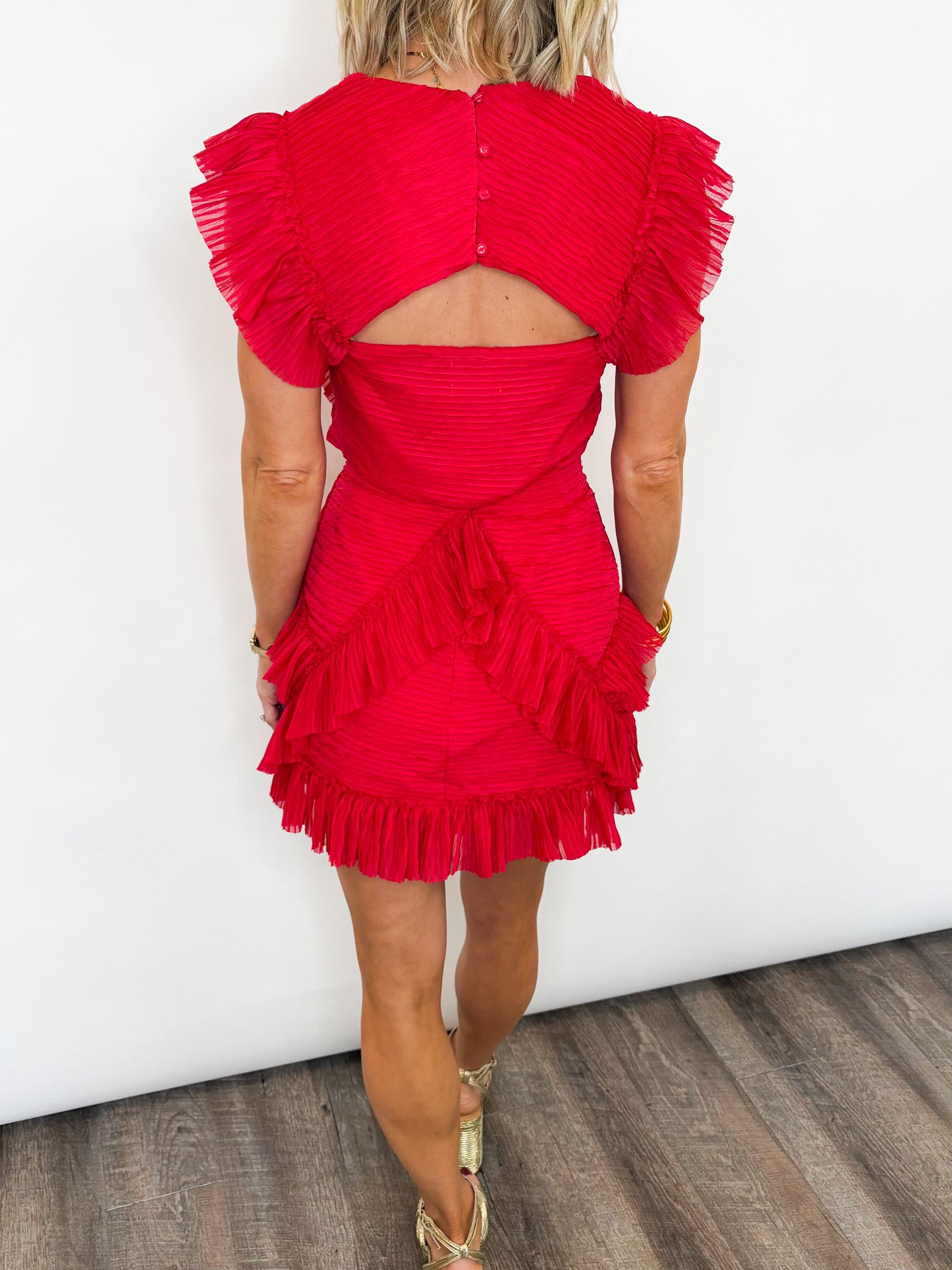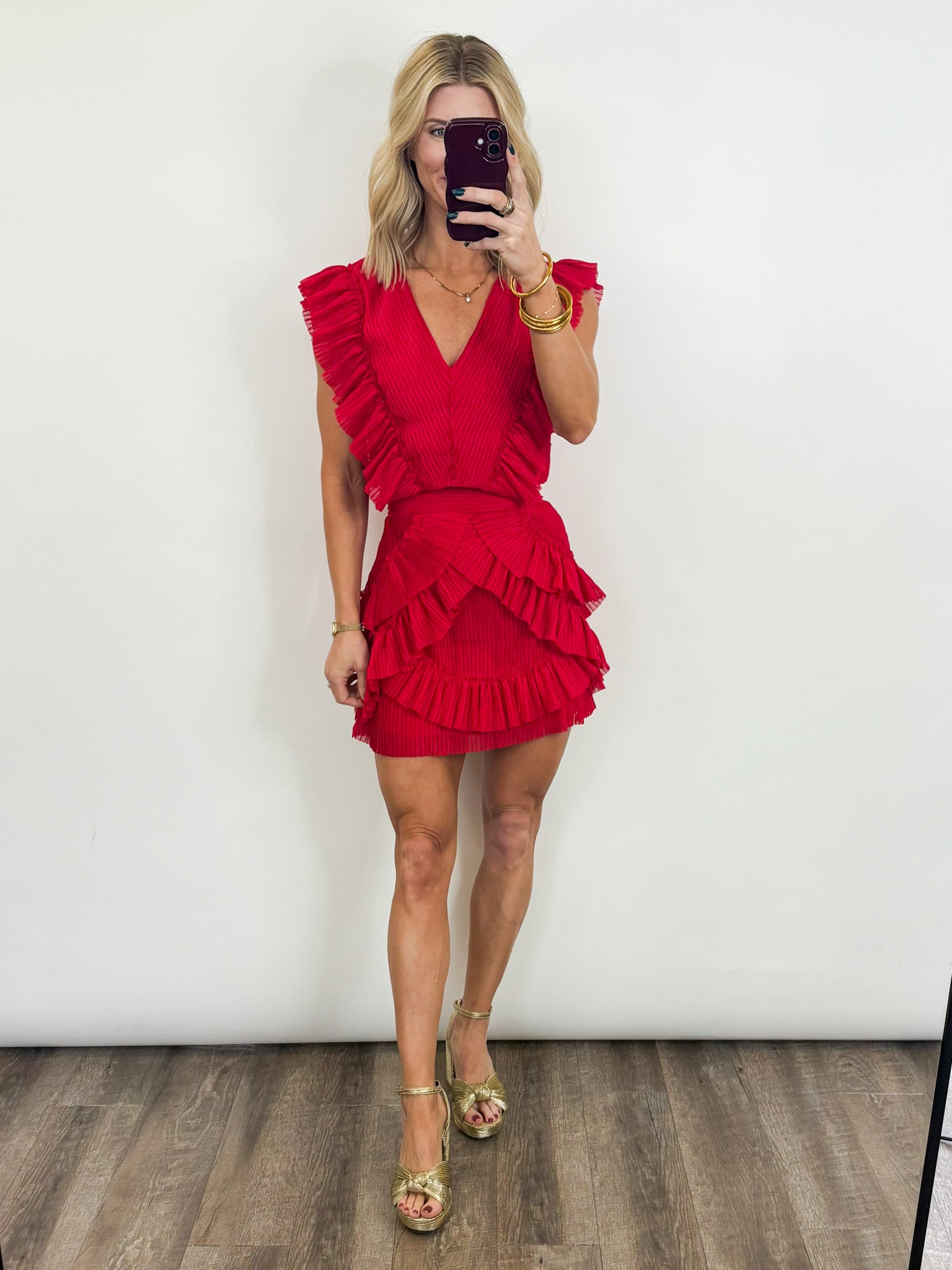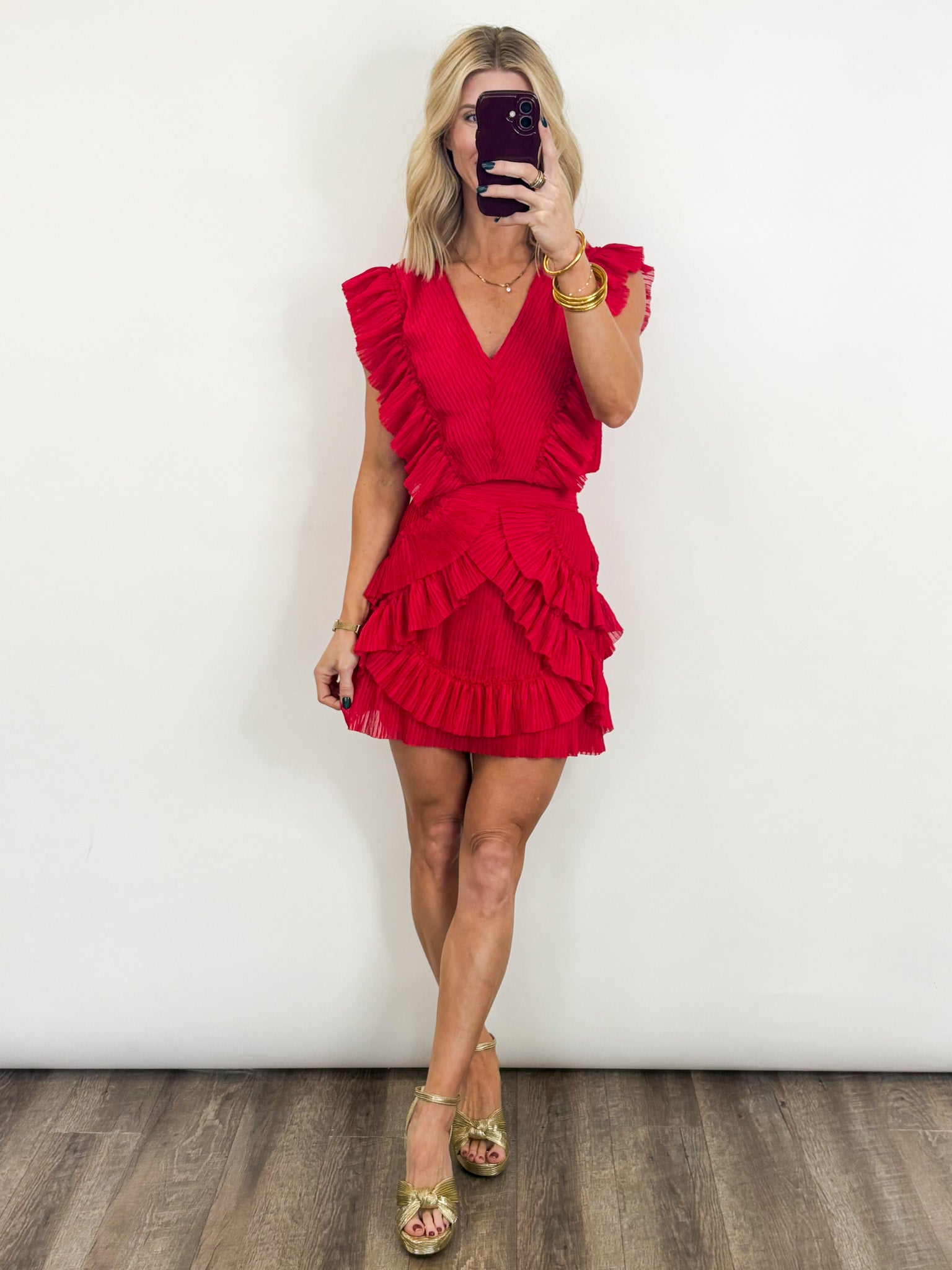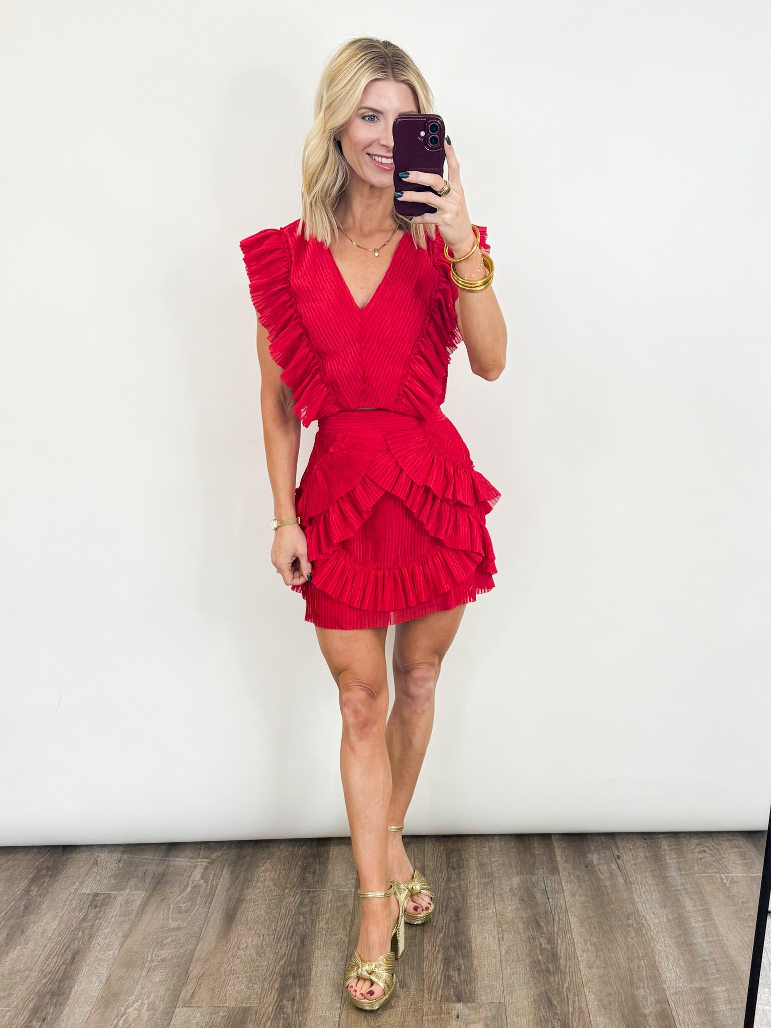 Turn every holiday moment into a show-stopping entrance with this stunning red two-piece set — a festive favorite made for celebrating in style. Designed with layers of flirty ruffles and rich texture, this set brings the perfect mix of glamour, confidence, and holiday magic. The top features a dramatic ruffled neckline and a sculpted silhouette, complete with a unique open-back detail that adds a playful touch to the elegant holiday red. The matching skirt mirrors the design with cascading ruffle tiers that move beautifully with every step — perfect for parties, date nights, and every twinkle-lit occasion in between.