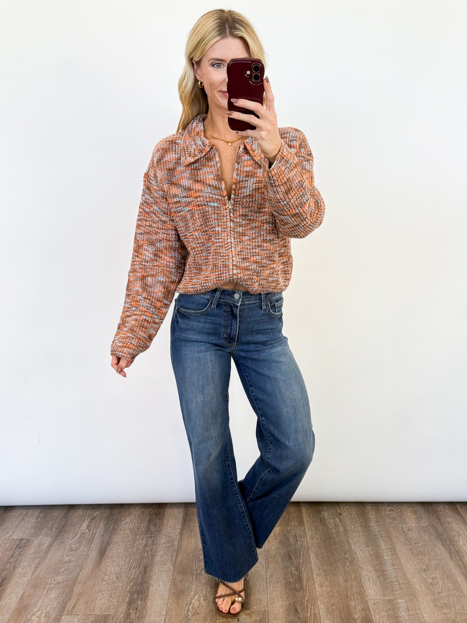 Cozy meets cool-girl fall style in this zip-front knit sweater — featuring a relaxed fit with a casual collar, full zipper closure, and a beautifully marbled mix of warm burnt orange, taupe, and soft grey tones. The lightweight open-knit texture makes it breathable yet snuggly, perfect for transitioning weather and layering all season long. Slightly boxy with an easy drape and long sleeves you can scrunch, it’s the effortless “throw on and still look styled” piece for coffee runs, tailgates, or pumpkin patch days.