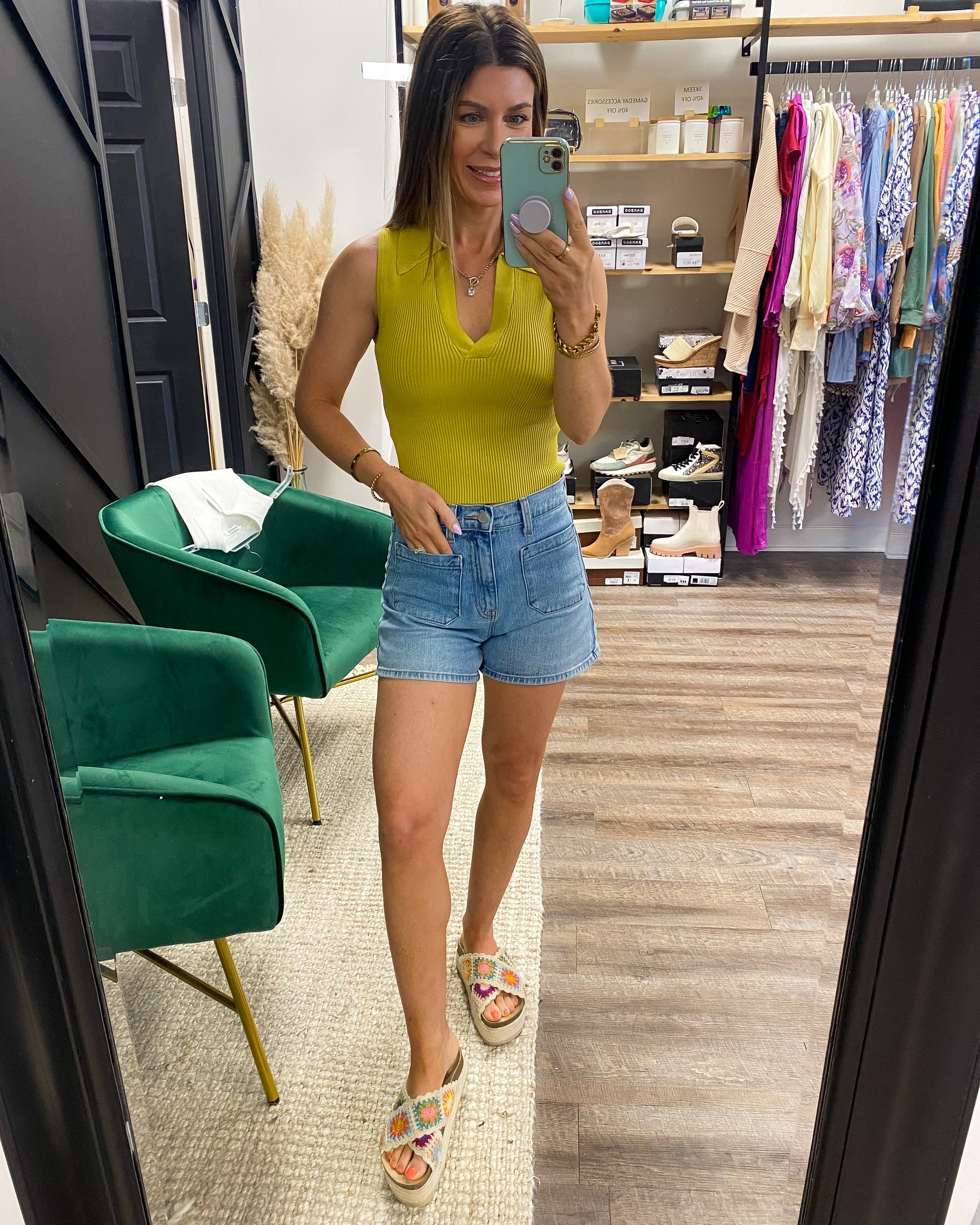We love the preppy vibes this semi cropped, collared top is giving! It's a twist on our basic Summer ribbed tanks that are always a best seller for us. The white looks great with nearly any bottoms, and the green pairs so well with our white paperbag waist shorts for an easy and cute Summer look. Fits true to size..