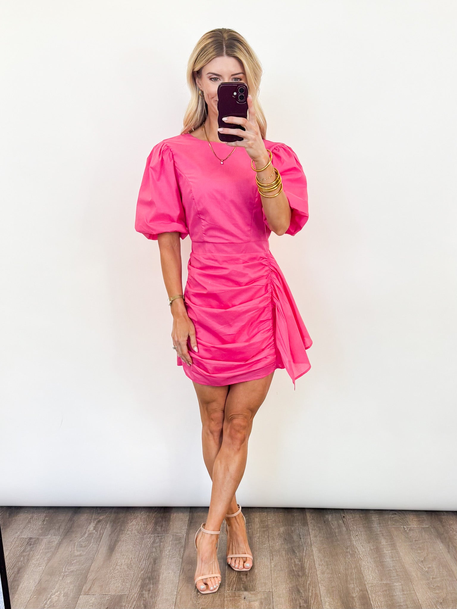 - Bold pink mini dress