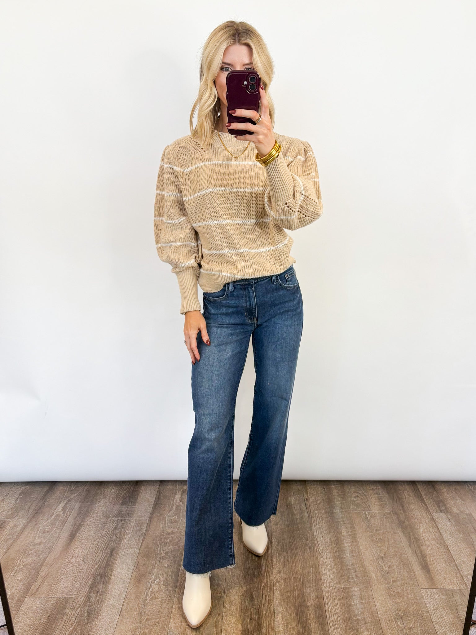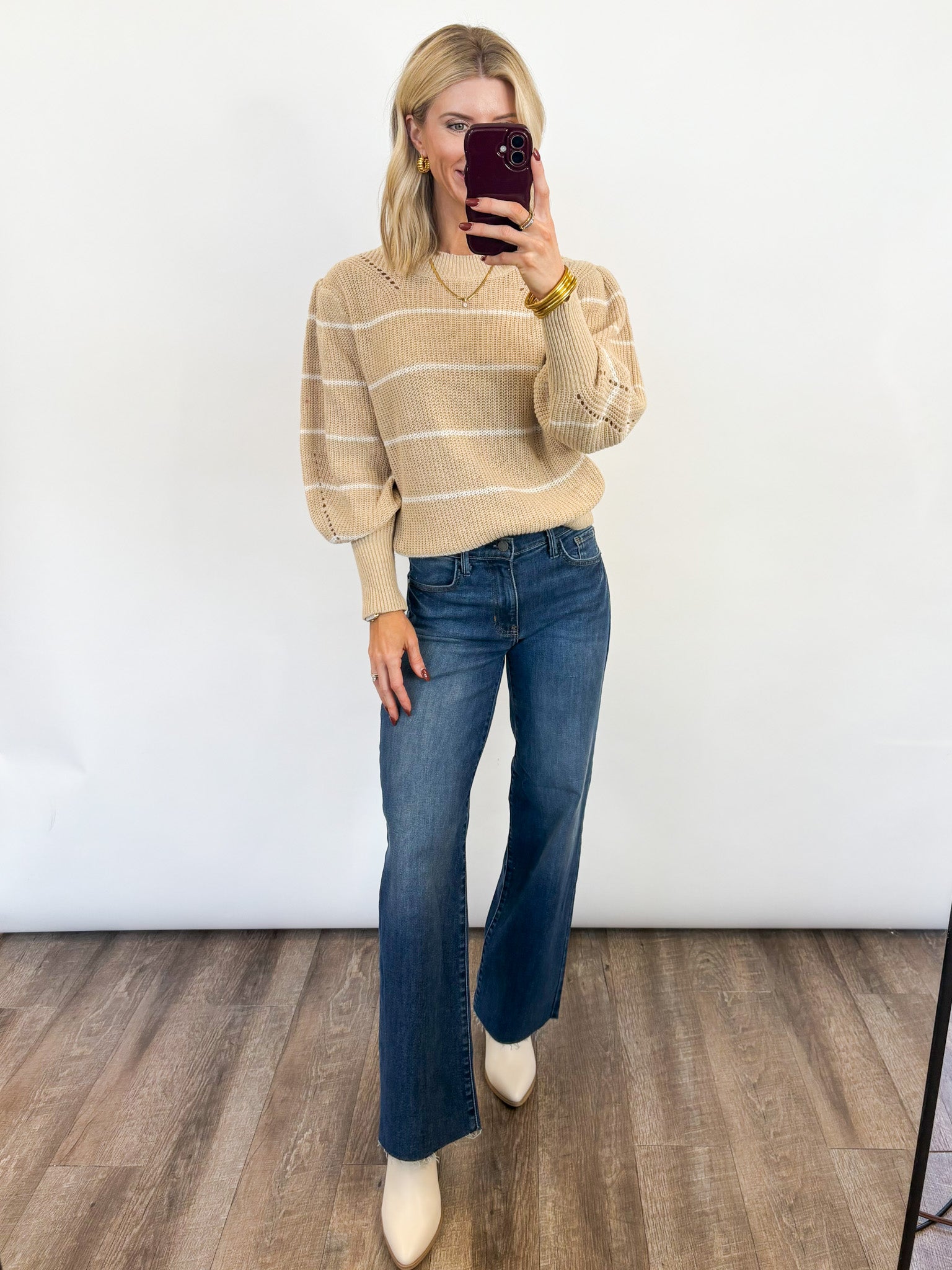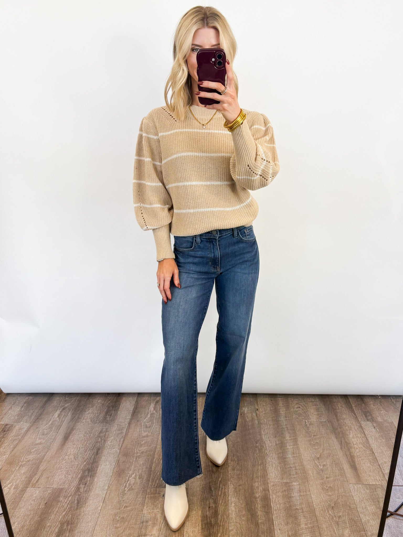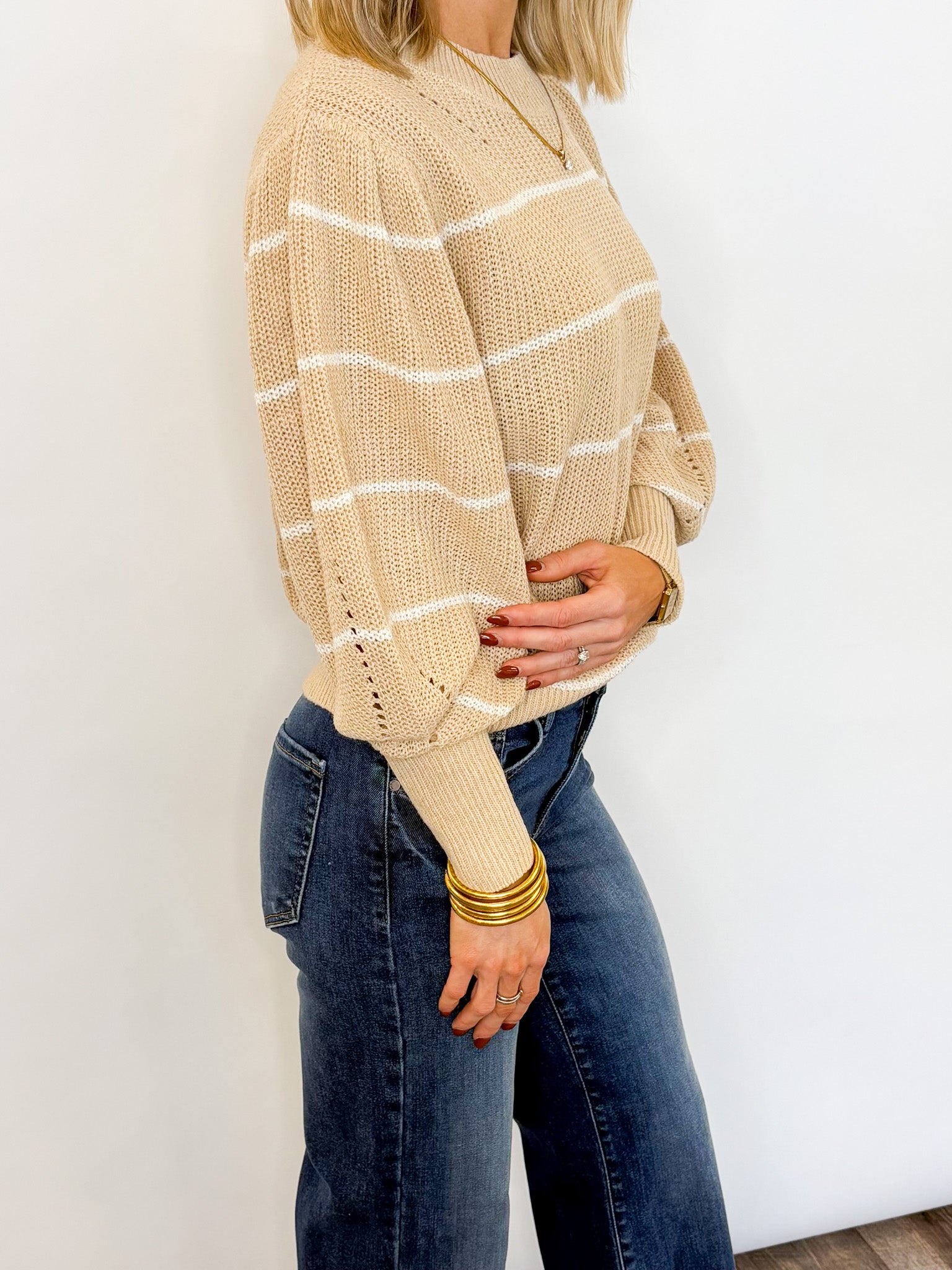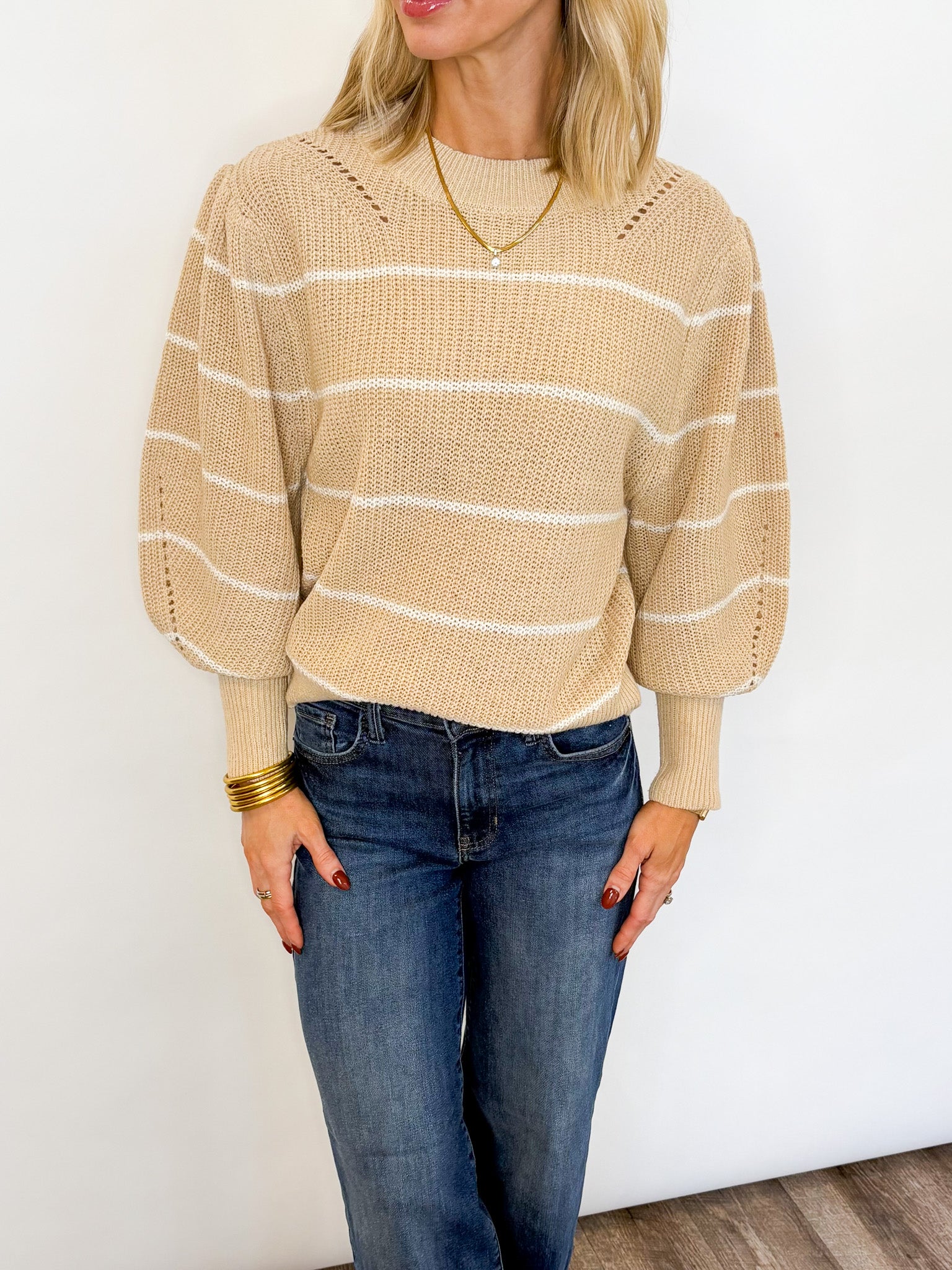 Classic, cozy, and effortlessly chic — the Coastal Stripes Sweater is the perfect neutral knit for every season. Featuring soft beige tones with subtle white stripes, this relaxed pullover brings an easygoing feel to your everyday wardrobe.