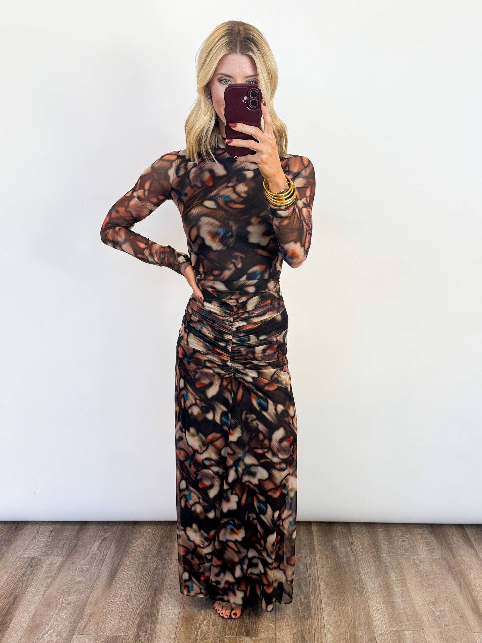 Make a daring entrance in the Enchanted Ember Dress — where bold meets elegant in the most captivating way. This body-skimming silhouette features a moody abstract print with warm brown, black, and subtle teal tones that create a dreamy, almost ethereal effect. The sheer mesh overlay pairs with a lined body for comfort, while side ruching enhances your curves and cascades into a dramatic draped detail for added movement and flair. A high neckline and long sleeves balance the sultry shape, making it perfect for date nights, cocktail hours, or any event where you want all eyes on you.
