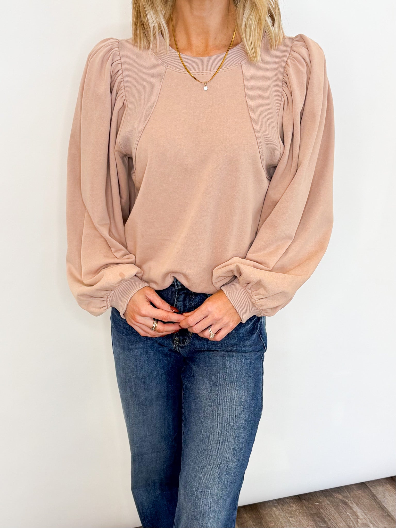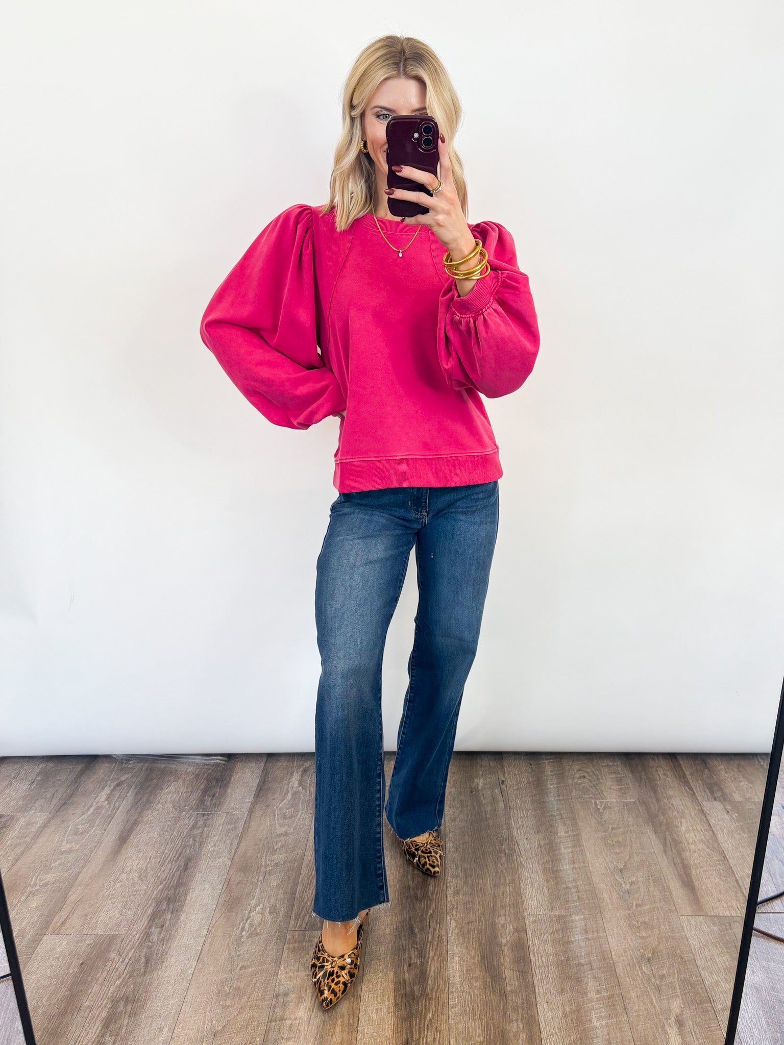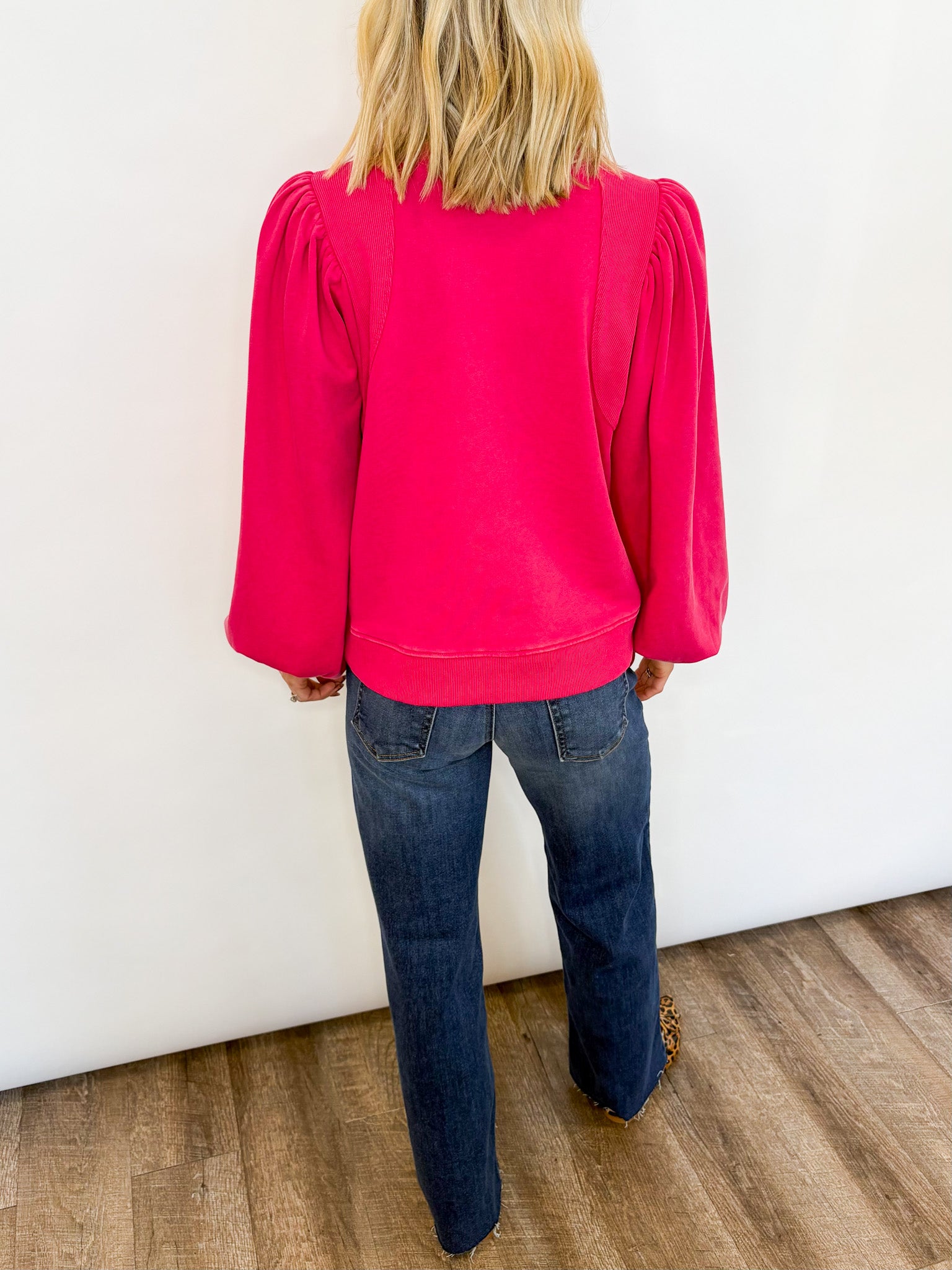 Cozy meets cute in this effortlessly chic puff-sleeve sweatshirt. Designed with soft, plush fabric and voluminous balloon sleeves, it adds a feminine twist to your everyday casual look. The relaxed fit keeps things comfortable, while the gathered shoulder detail elevates the entire silhouette—perfect for days when you want comfort without sacrificing style.