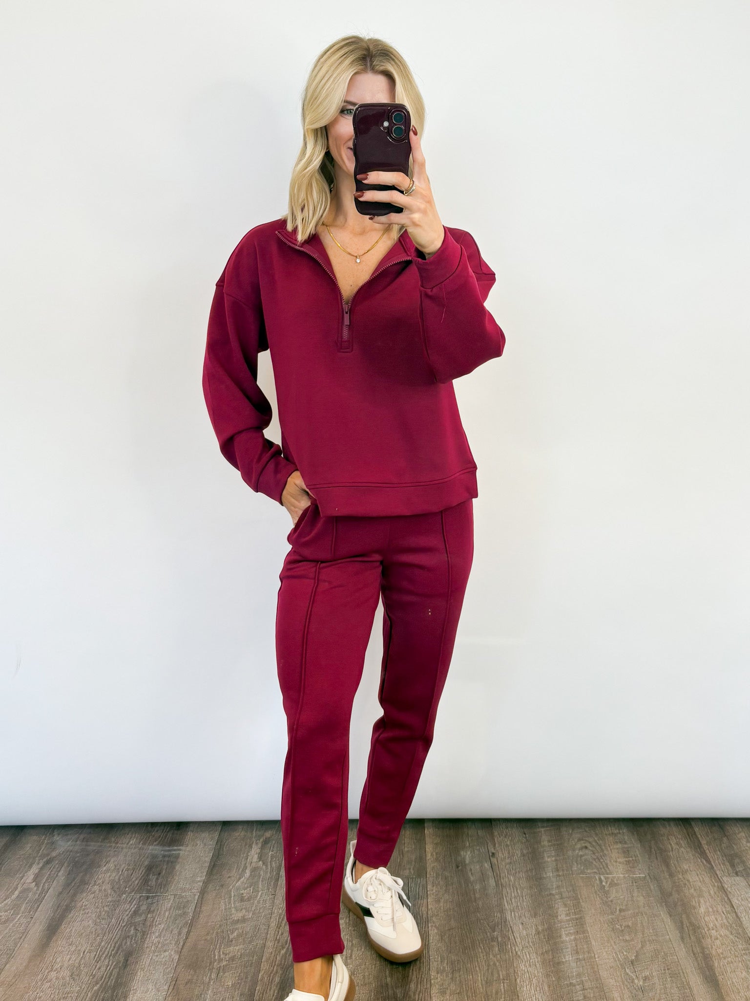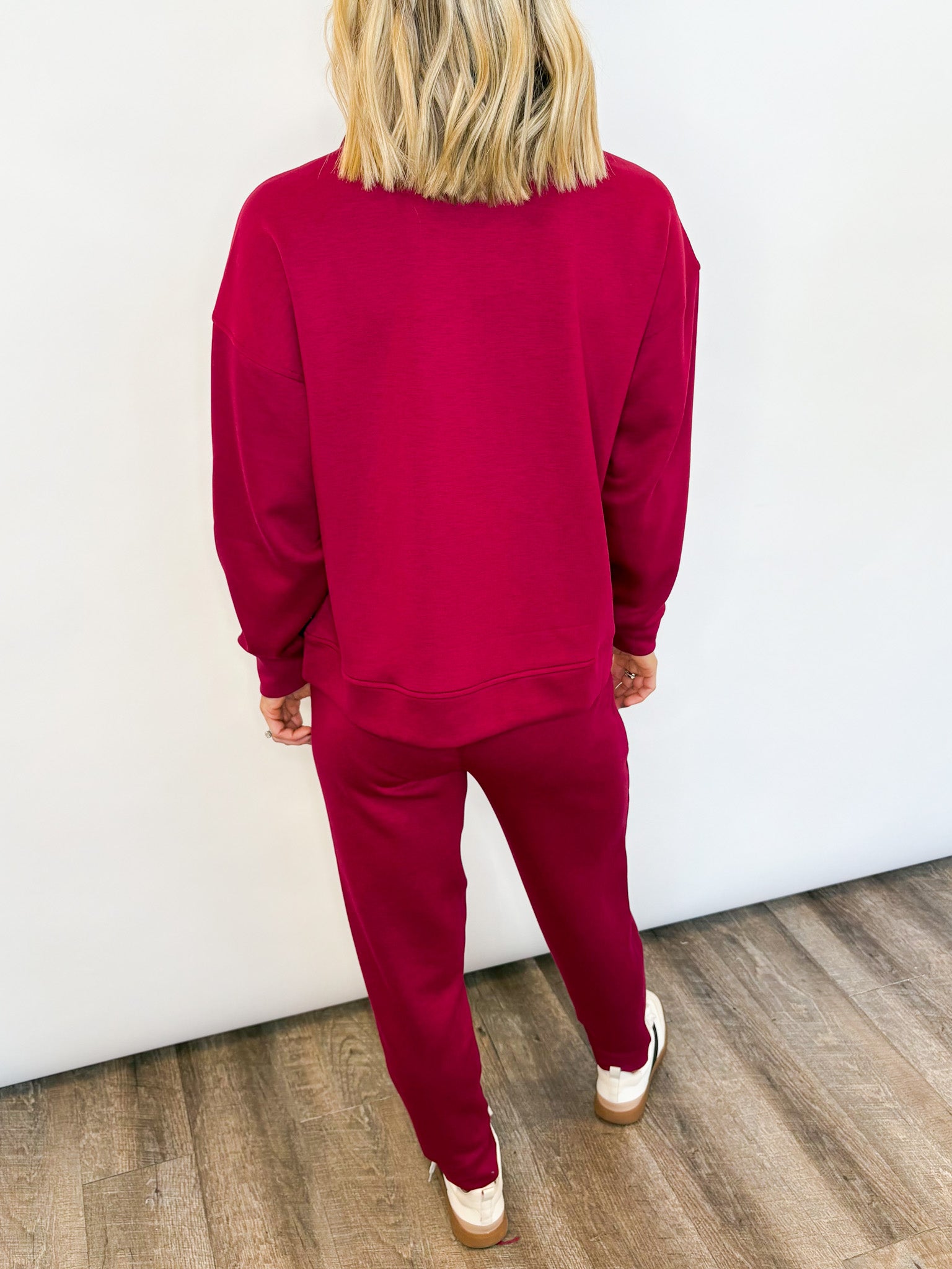 Meet your new favorite matching set—the perfect blend of cozy comfort and everyday style. This ultra-soft lounge set features a relaxed half-zip sweatshirt paired with tapered jogger-style pants, giving you an effortlessly put-together look with zero effort required.