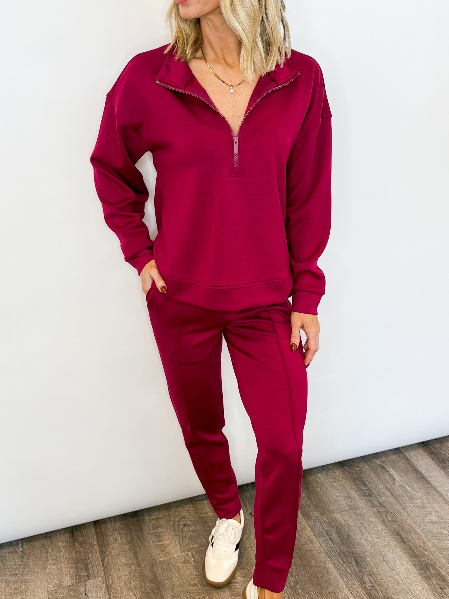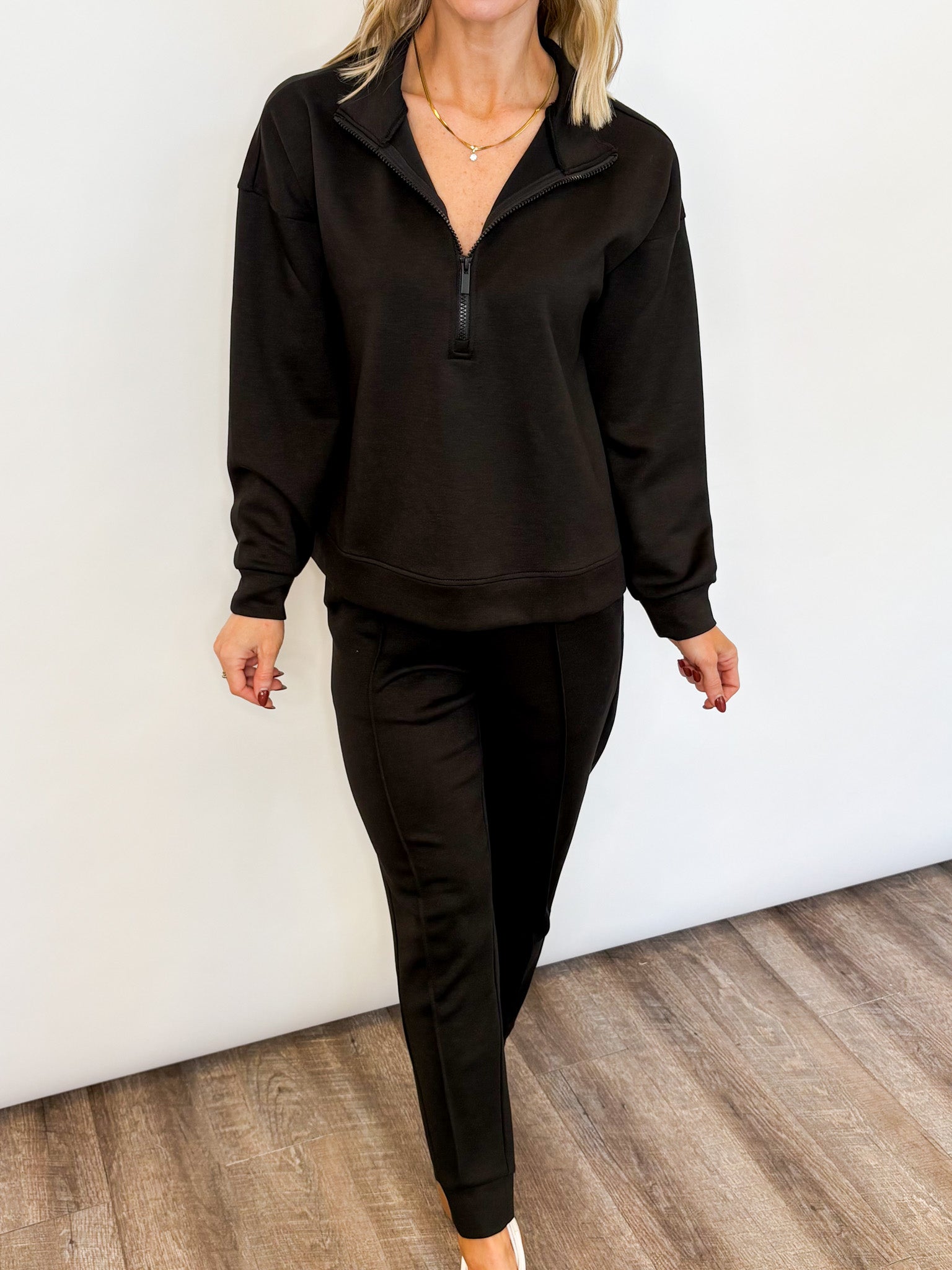 The sweatshirt offers a laid-back fit with dropped shoulders and a functional zip neckline, making it easy to style zipped up or slightly open. The matching joggers include an elastic waistband, cuffed hems, and flattering seam details for that “cute but comfy” vibe you’ll reach for again and again.