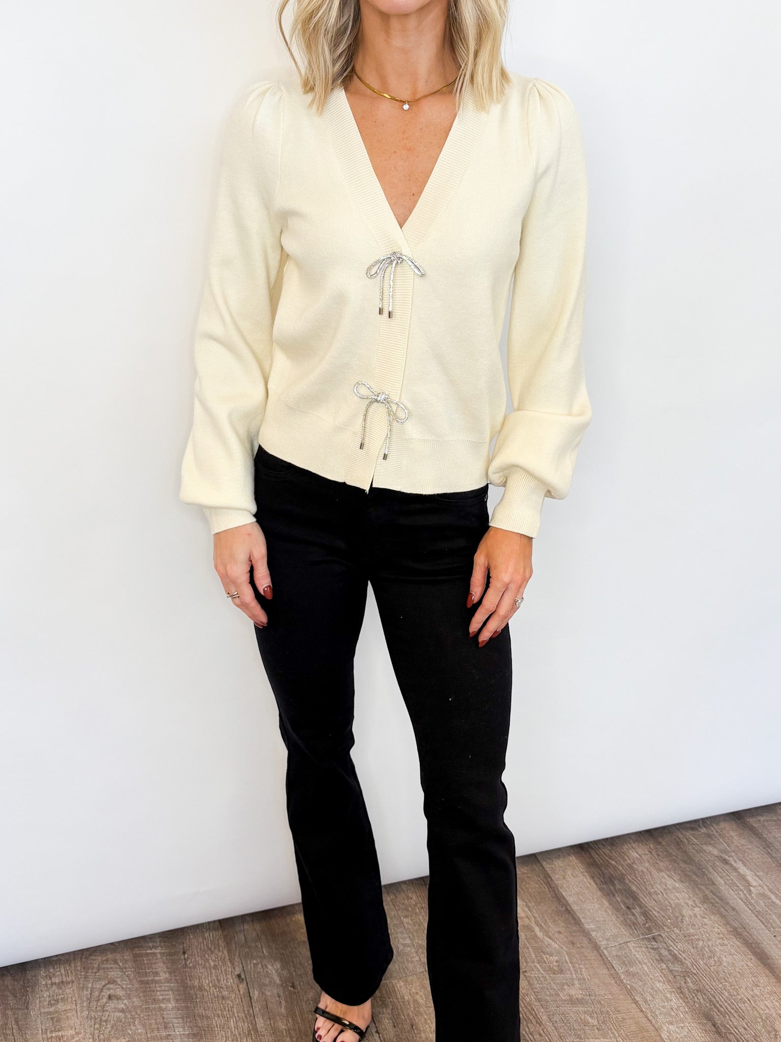 Sweet, soft, and effortlessly feminine — our Frosted Ribbon Cardigan brings a touch of elegance to everyday layering. This cozy knit sweater features a flattering V-neckline, subtle puff sleeves, and dainty rhinestone metallic ribbon tie closures that add just the right amount of shimmer. The creamy neutral tone makes it an easy match for everything from denim to dressy skirts, while the cropped fit keeps it fresh and modern.