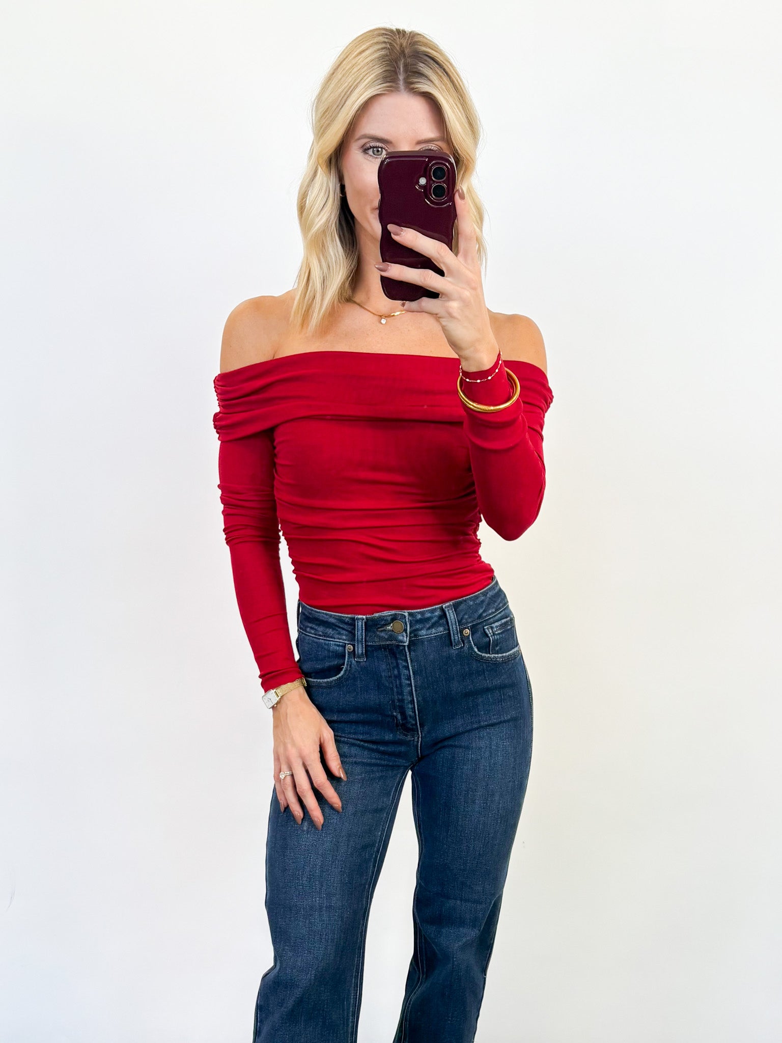 - Bold holiday red for a festive, chic look
