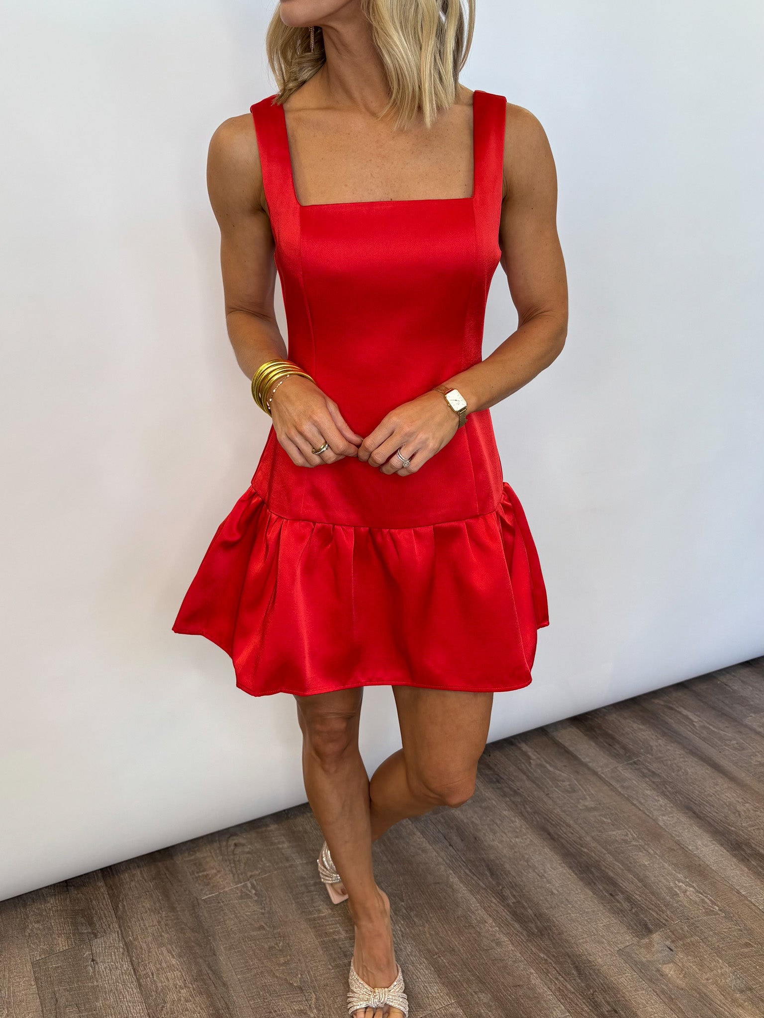 Turn heads this holiday season in the Merry Satin Mini Dress — the definition of festive elegance. This luxe, vibrant red satin pops beautifully in photos and in person, while the flattering square neckline and structured bodice delivers a sophisticated, tailored fit. The flirty ruffle hem adds just the right touch of playful movement, making it perfect for Christmas parties, holiday dinners, New Year’s celebrations, or that special night out. Effortlessly stunning with gold jewelry and a sparkly heel.