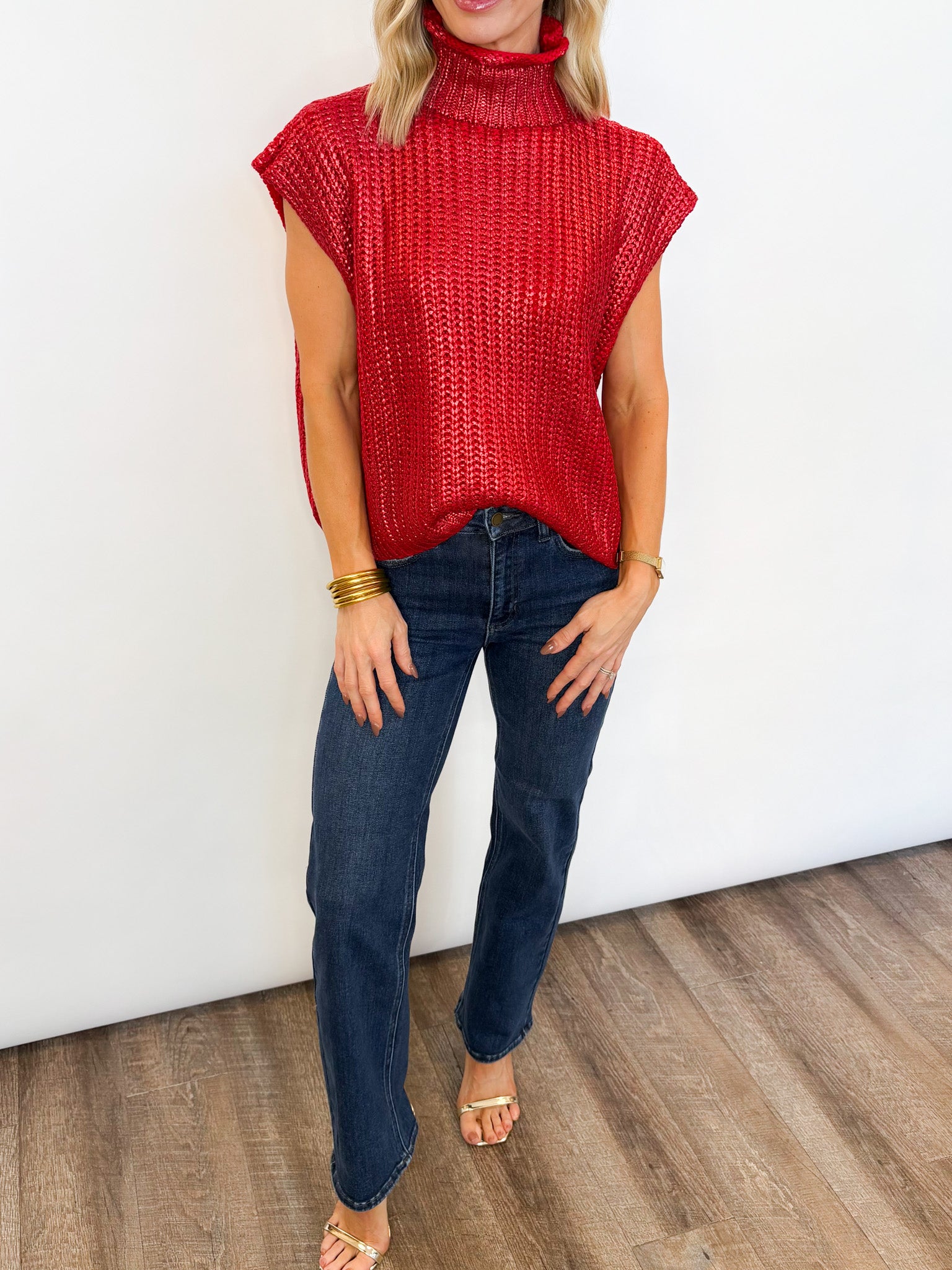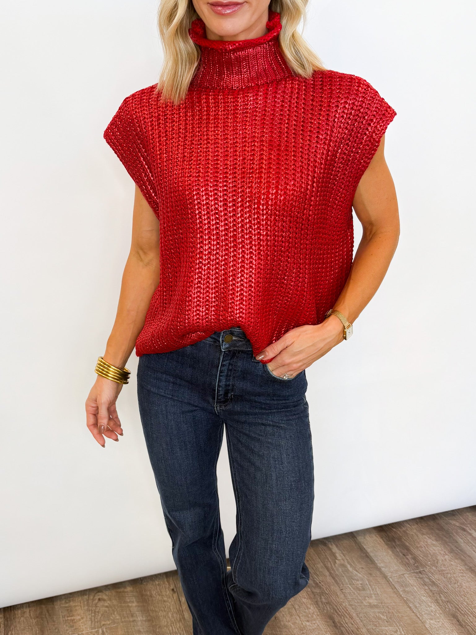 Shine bright this season with the Holly Jolly Sweater. Crafted with a chunky knit design and finished with a subtle foil coating, this piece catches the light in the most effortless way. The sleeveless silhouette and mock neckline give it a modern edge, making it the perfect layering piece for both casual days and festive nights.