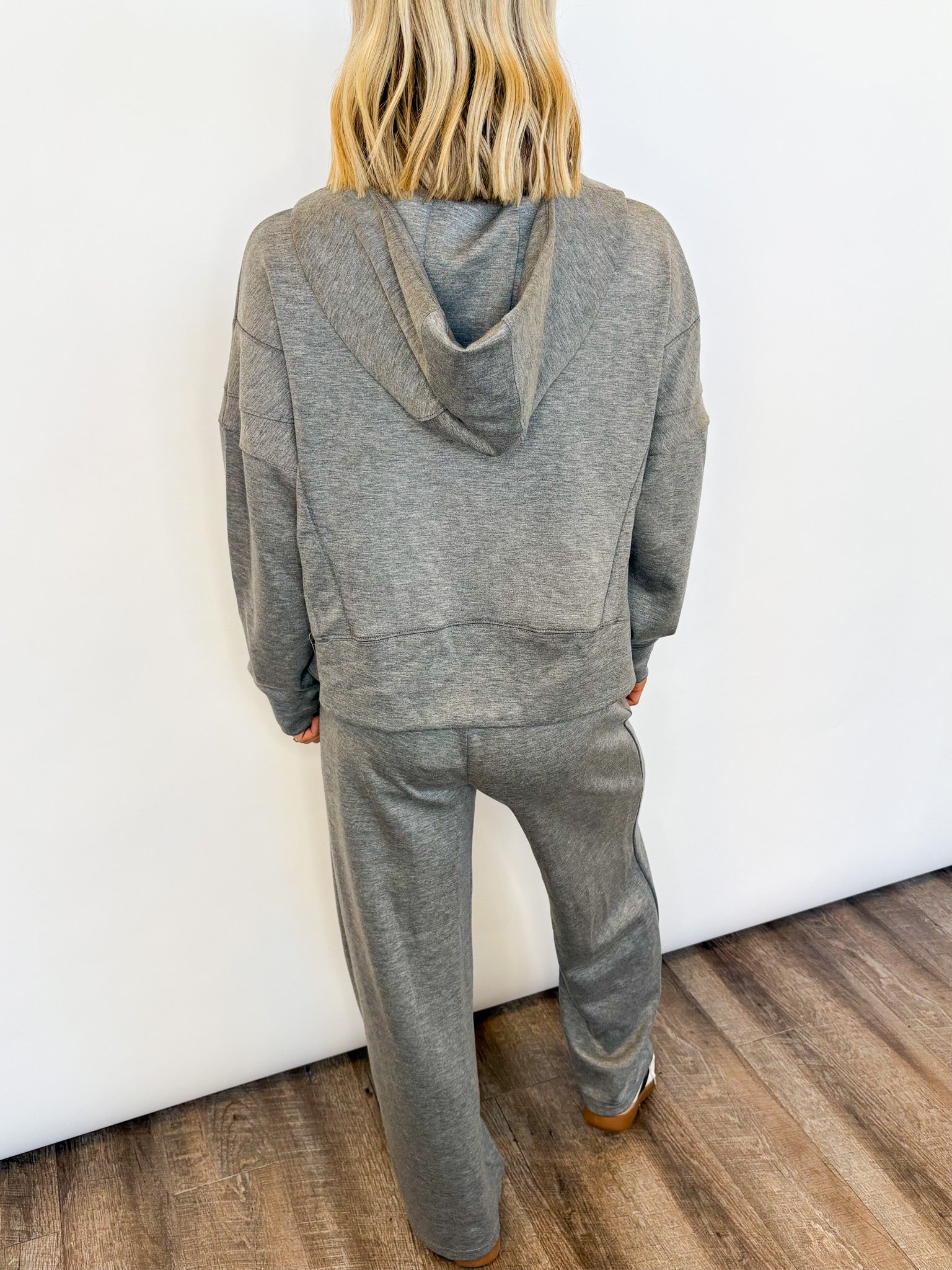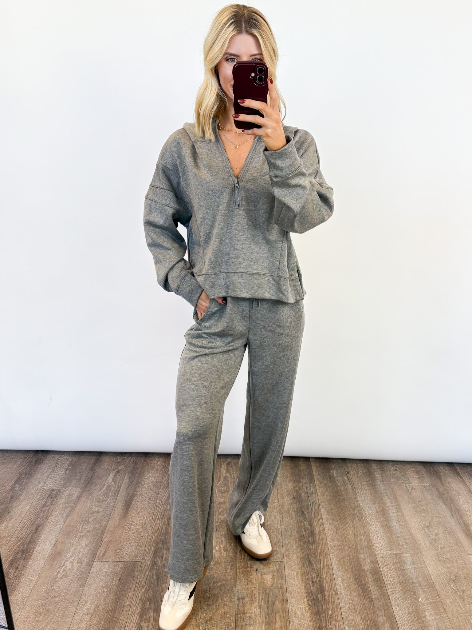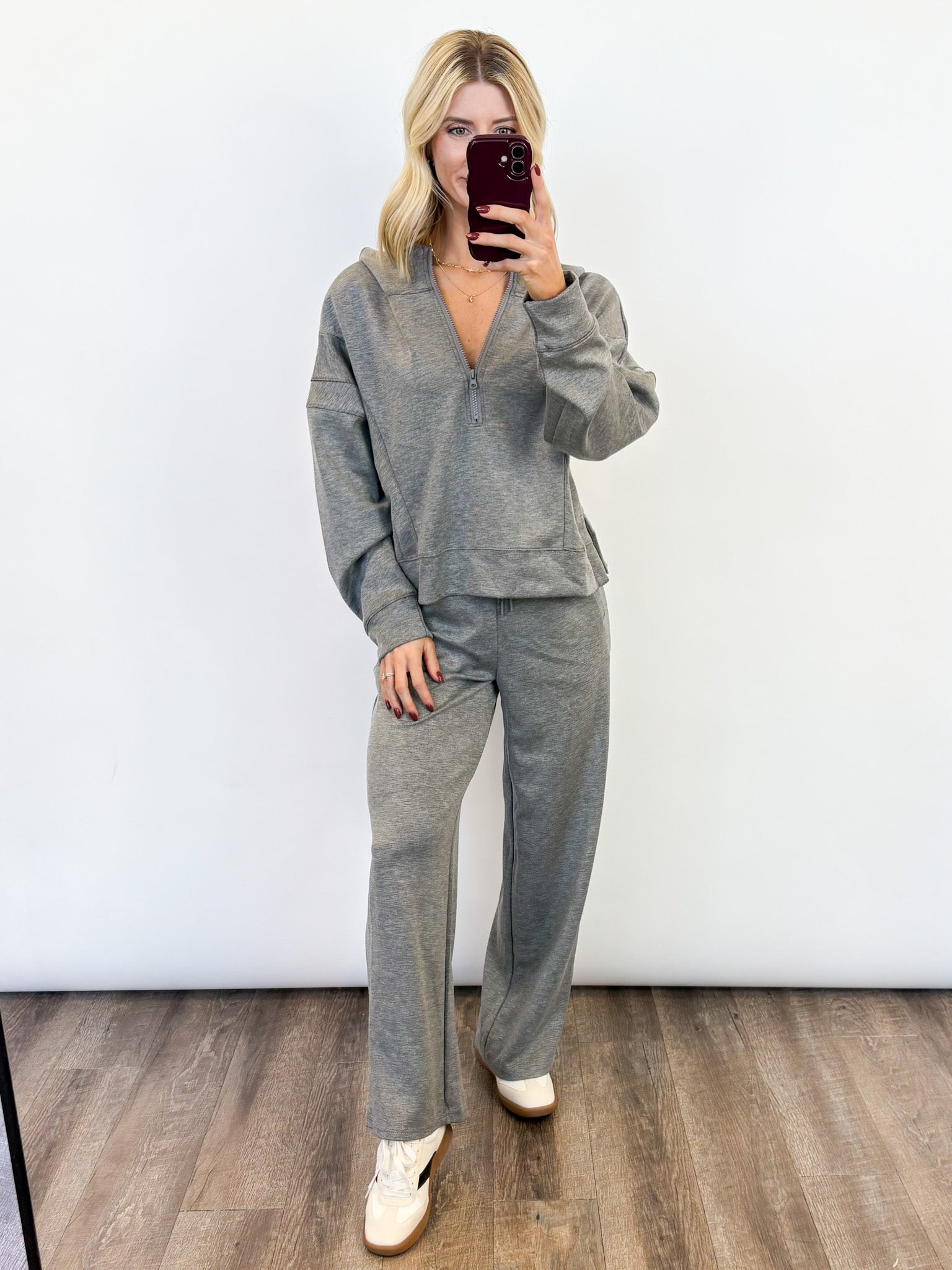 Get ready to breeze through your day in this new set available in three colors! With stylish seams along the front of the sweatshirt and a half length zipper, the top is cool and comfortable enough to wear everyday and the drawstring waist pants provide the perfect fit.