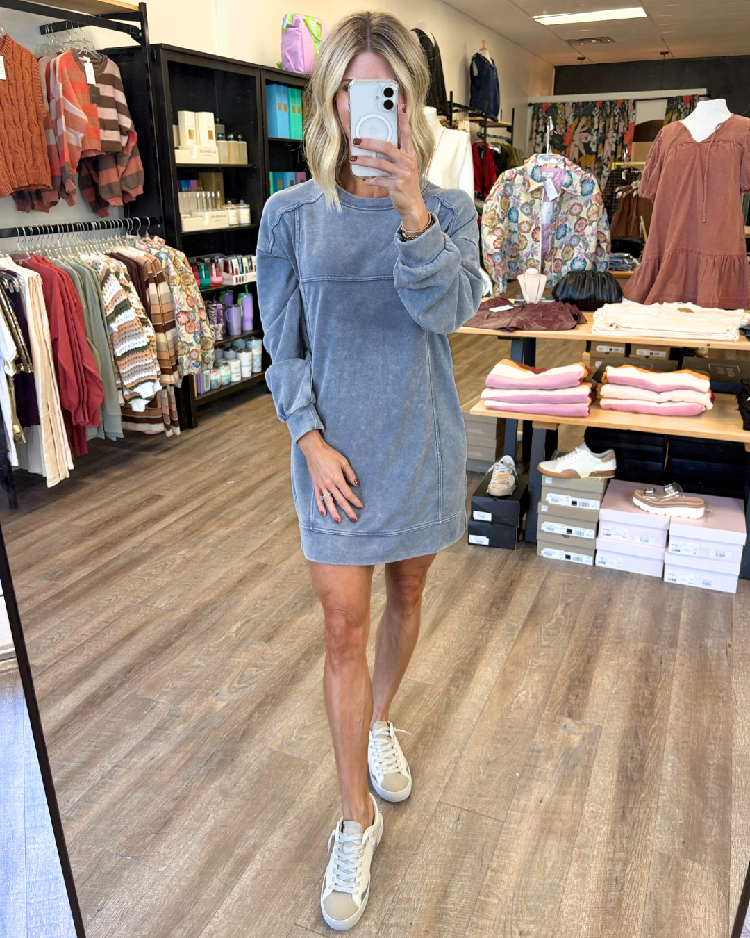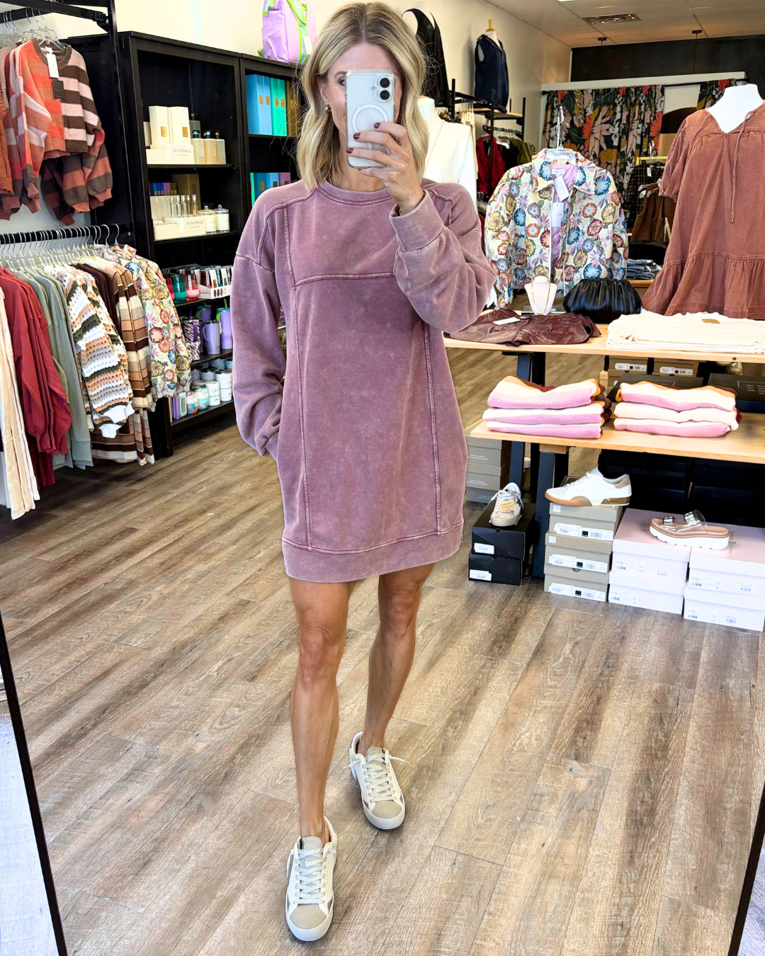 Introducing our Keep Going Dress in 2 amazing colors for Fall! Featuring an acid washed fabric in a wine and denim color, this terry lined dress combines style and comfort for those days you never stop but still need to look put together..