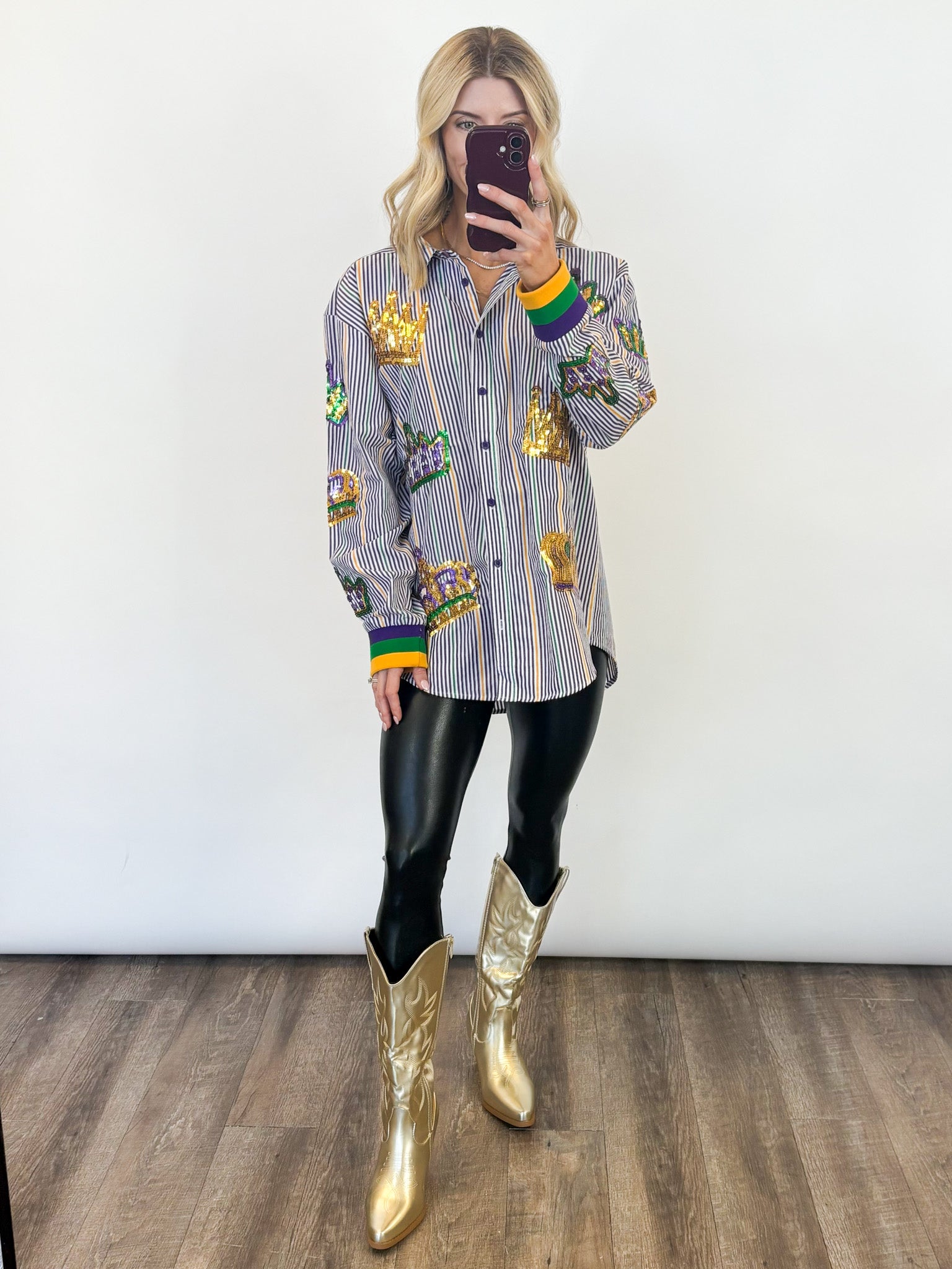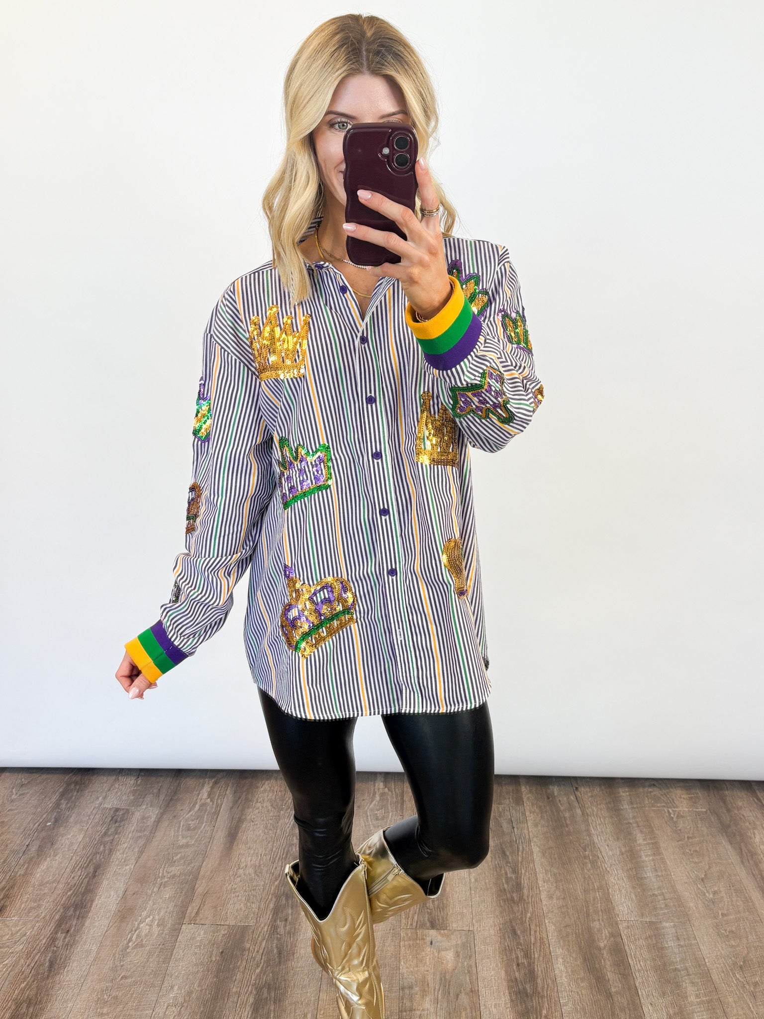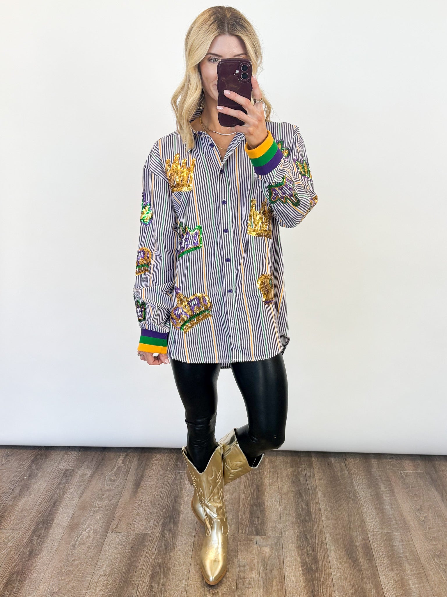Make a royal statement this Mardi Gras season with our Mardi Gras Crown Tunic — a festive showstopper designed for parade days, party nights, and everything in between. This classic striped button-down gets a bold carnival upgrade with dazzling sequin crown appliqués in vibrant purple, green, and gold scattered throughout for the perfect touch of sparkle. Designed with a relaxed, tunic-length fit, this piece is effortlessly chic and endlessly versatile. Wear it loose with leggings or denim, front-tucked for a casual vibe, or buttoned up and styled with statement accessories for a true Mardi Gras moment.