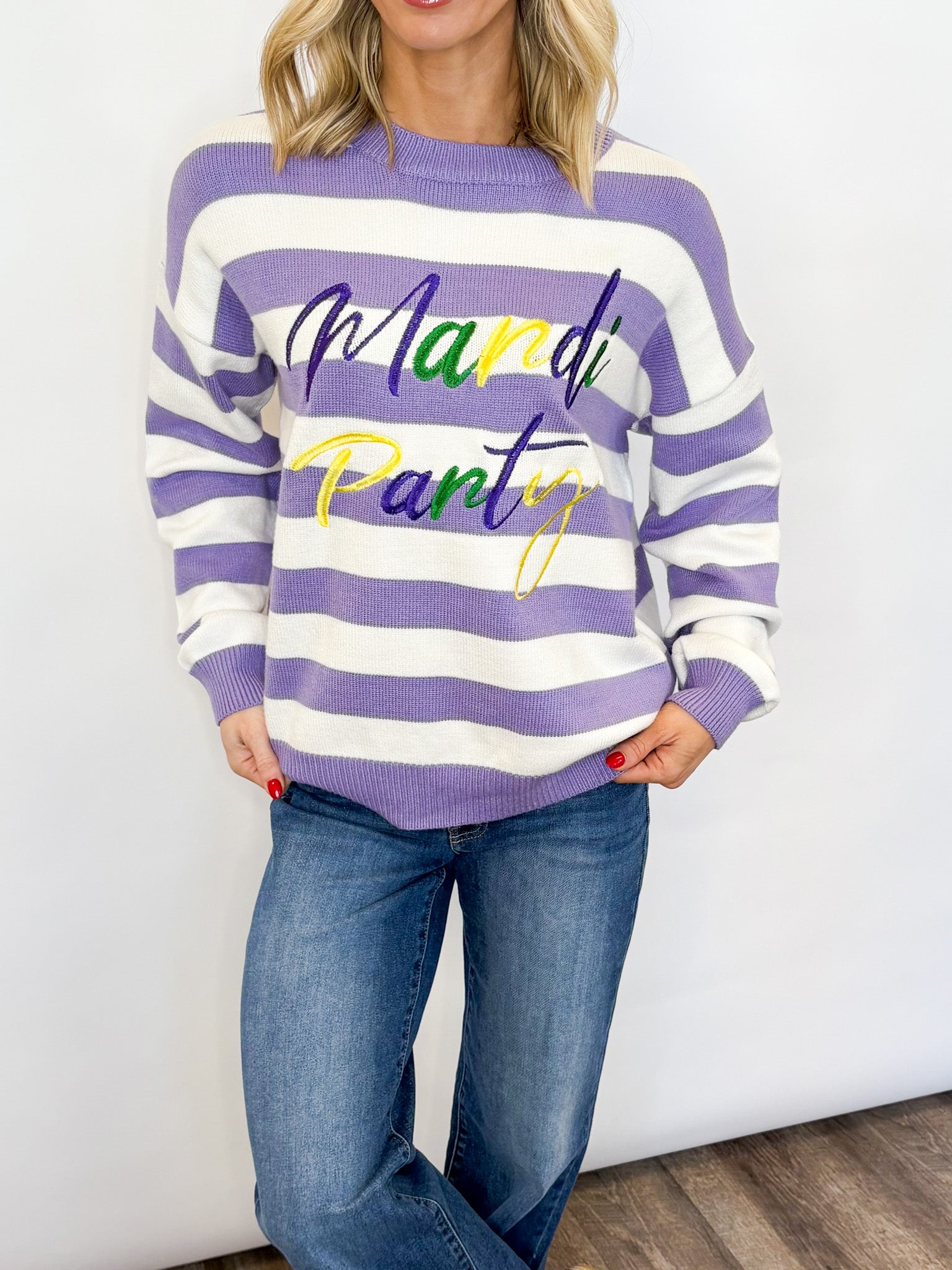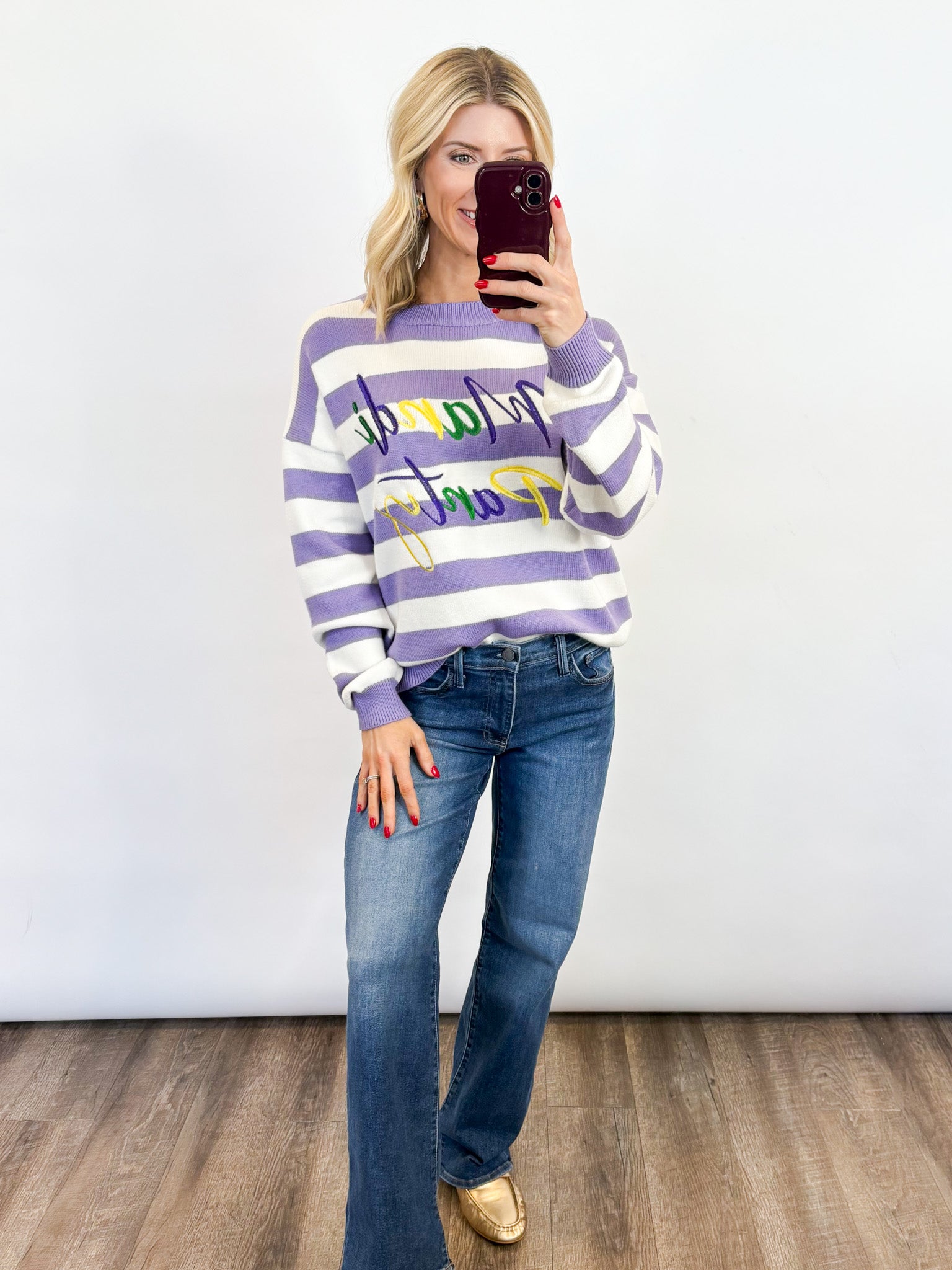 It’s always a party in this sweater! Our Mardi Party Stripe Sweater is made for the girl who loves to celebrate in style. With bold lavender and white stripes, festive “Mardi Party” embroidery in classic purple, green, and gold, and the cutest relaxed fit, this sweater brings playful Carnival charm with a comfy, cozy fit. Perfect for parade days, brunch with the krewe, balcony hangs, or dancing the night away!