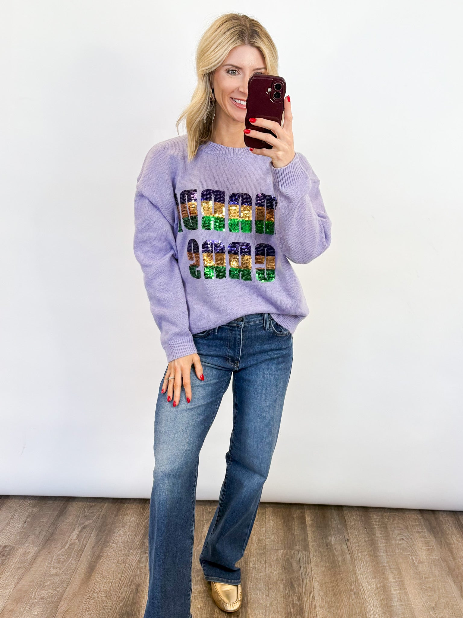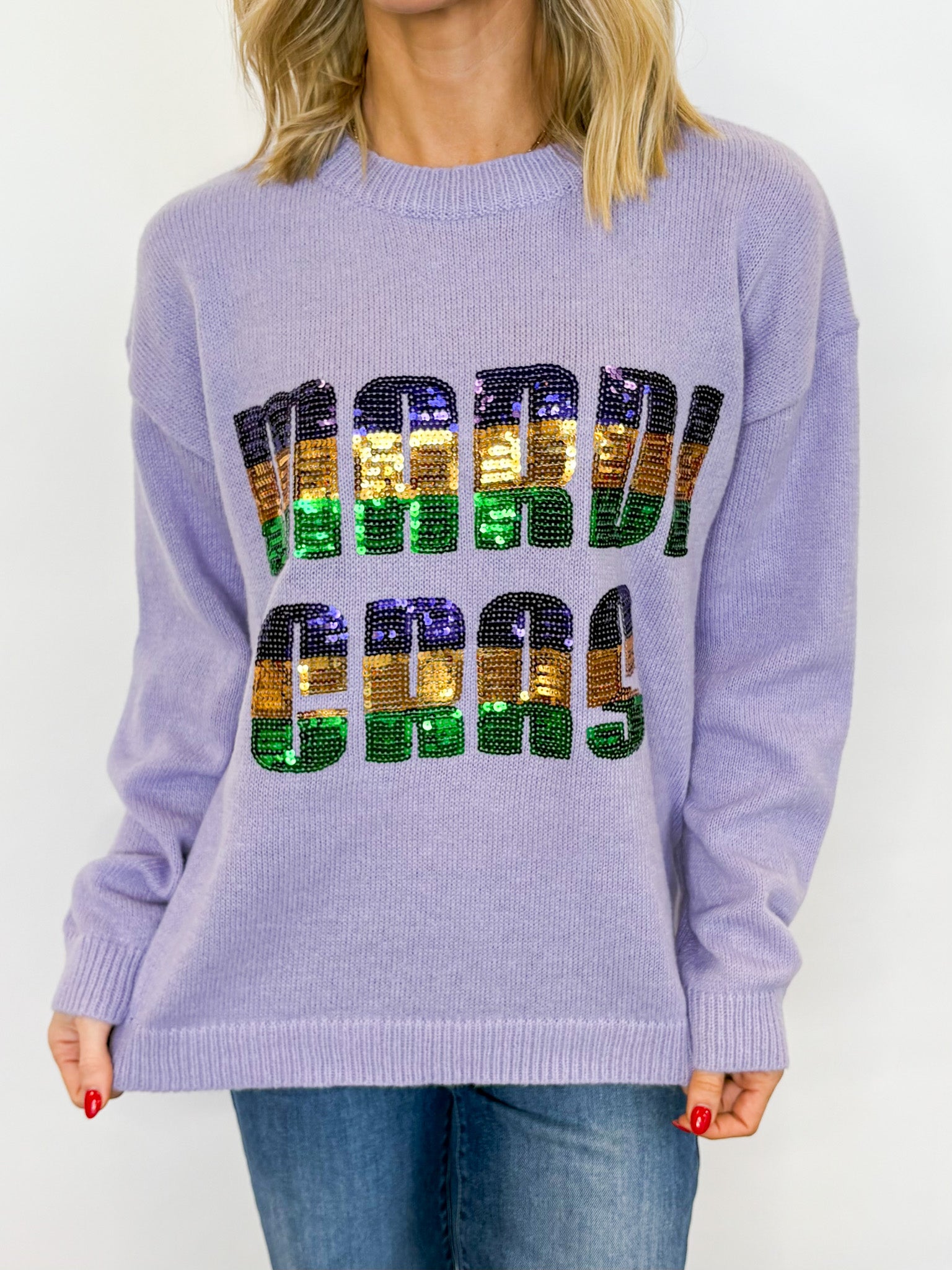 Add some sparkle to the season! Our Mardi Gras Sequin Knit Sweater is the ultimate statement piece for parade days, parties, and every Carnival celebration in between. Featuring bold sequined “MARDI GRAS” lettering in classic purple, green, and gold against a soft lavender knit, this sweater delivers cozy comfort with luxe festive flair. The relaxed fit makes it easy to wear all day while still turning heads wherever you geaux.