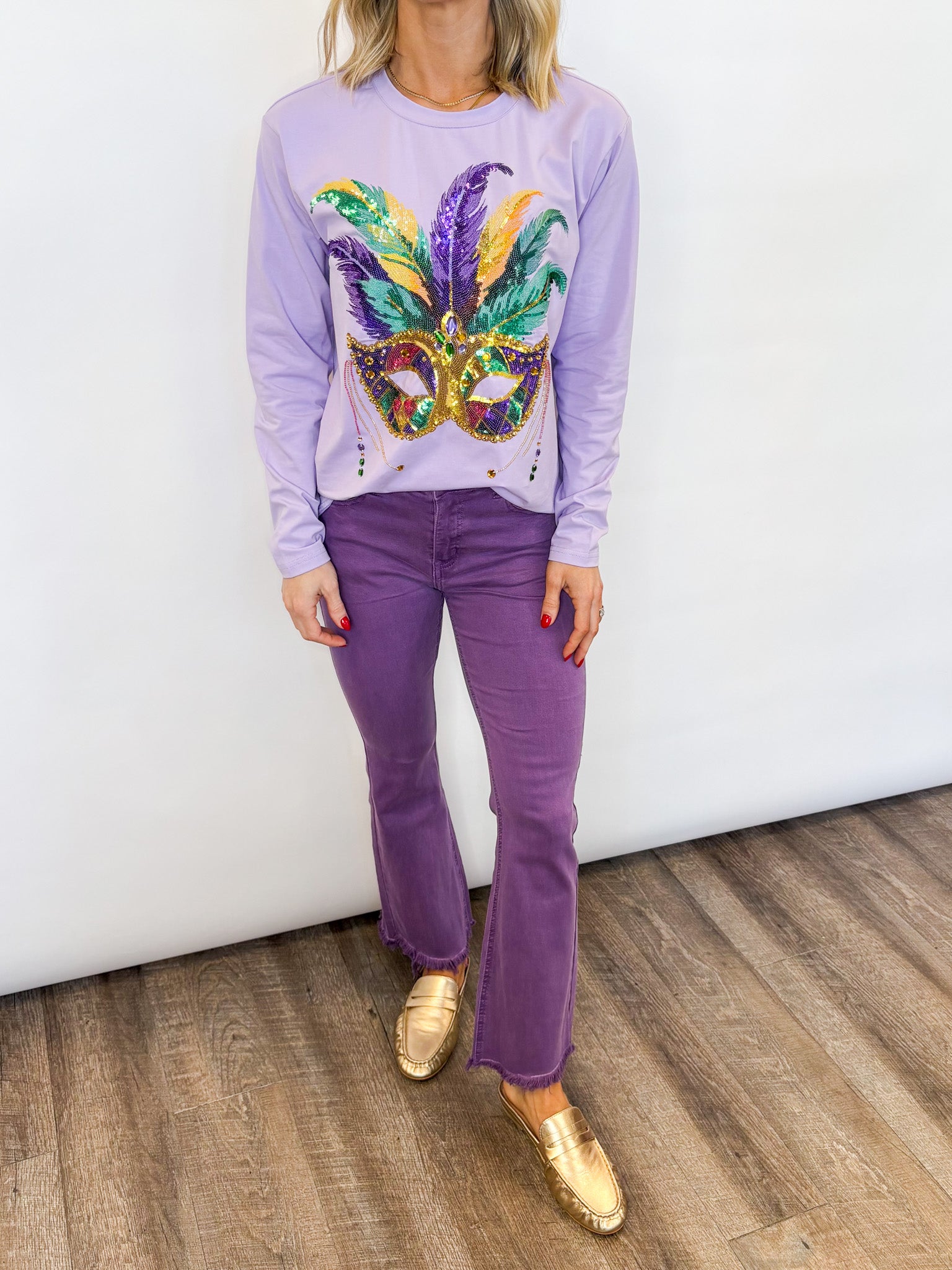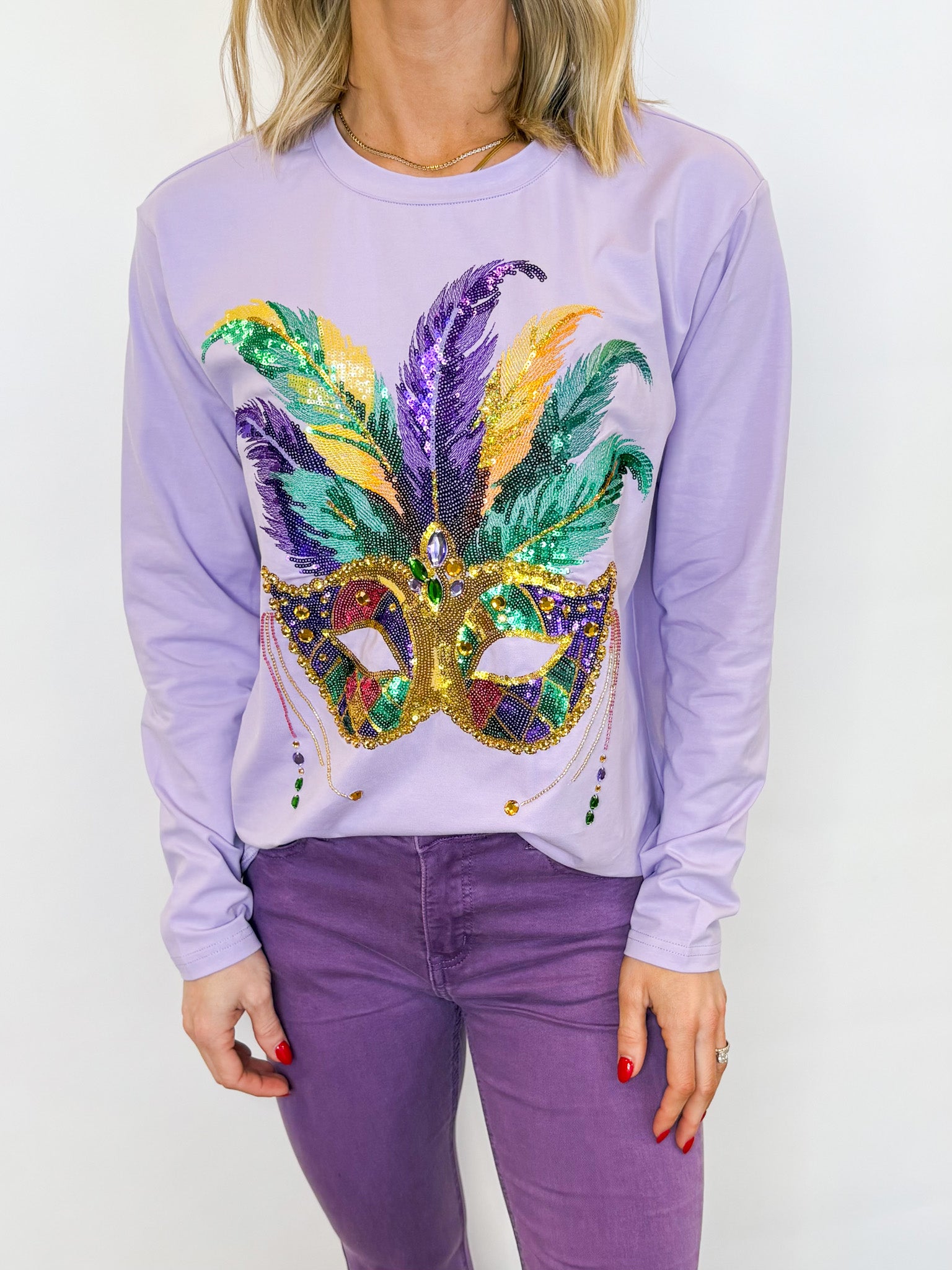 Make a BIG statement this Mardi Gras Season in our Masquerade Long Sleeve T-Shirt! The mask design is so detailed with beading, embroidery, sequins, and rhinestones and the length is perfect with a front tuck and jeans or worn out with leggings. The fabric has a nice stretch to it to make sure you can throw your hands up to catch the best throws while dancing on the parade route!