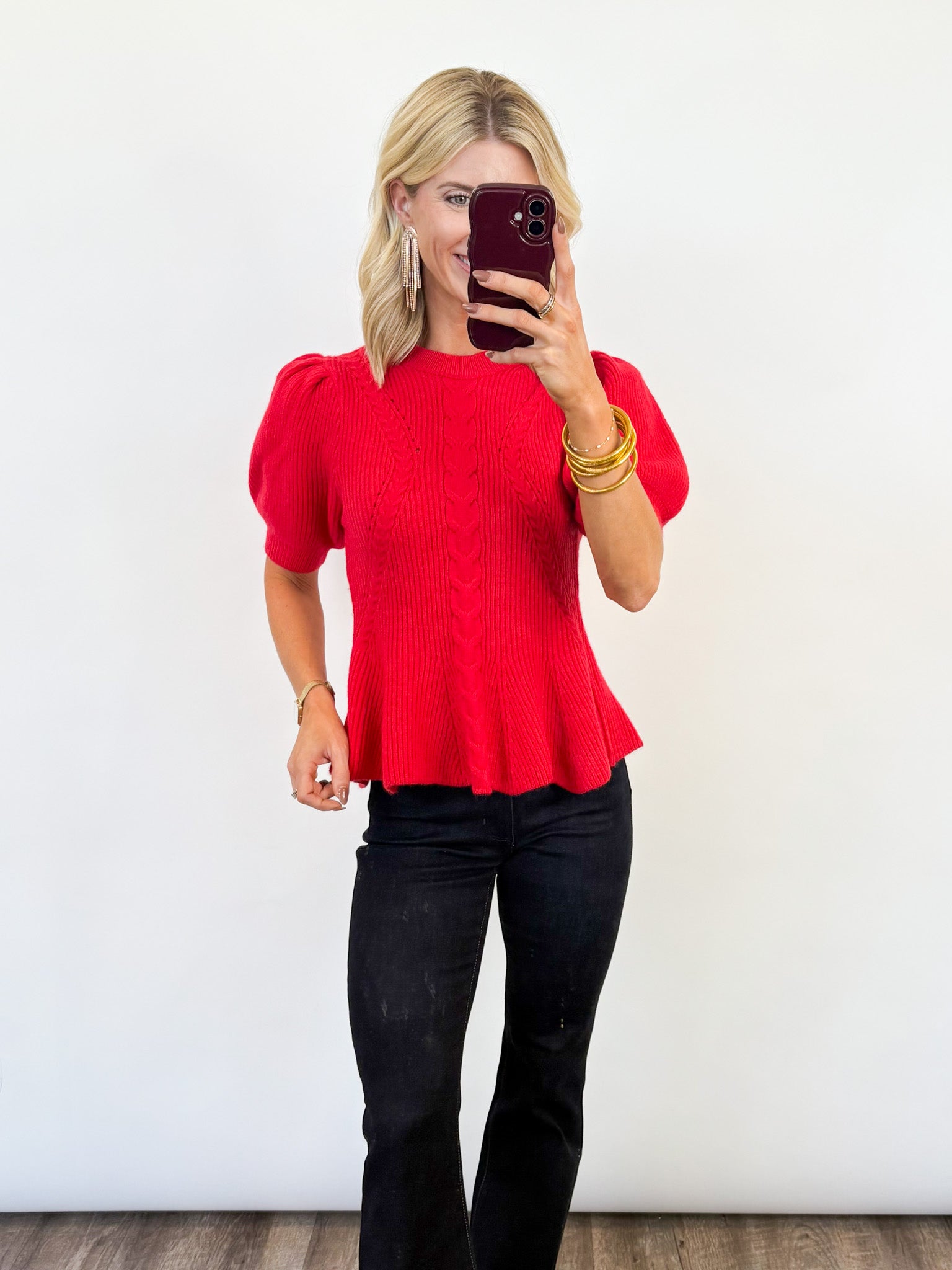 Cozy meets chic in the Merry Moments Sweater. This bright red sweater is your new go-to for festive gatherings and cheerful nights out. Featuring soft cable-knit detailing, puff sleeves, and a subtly flared hem, it delivers a flattering silhouette that’s equal parts classic and playful. The mid-weight knit keeps you warm without feeling bulky—perfect for pairing with coated denim, mini skirts, or holiday trousers.