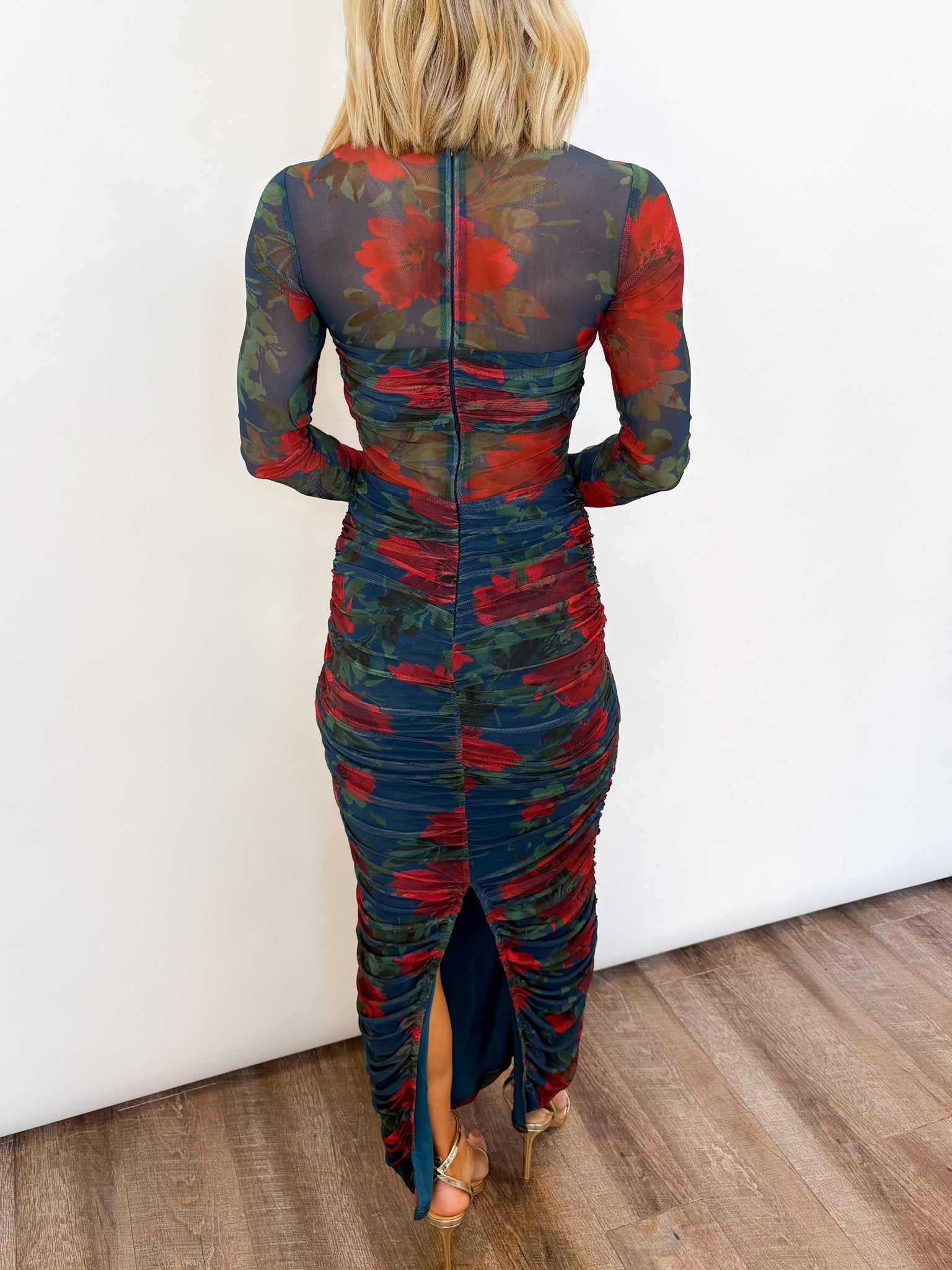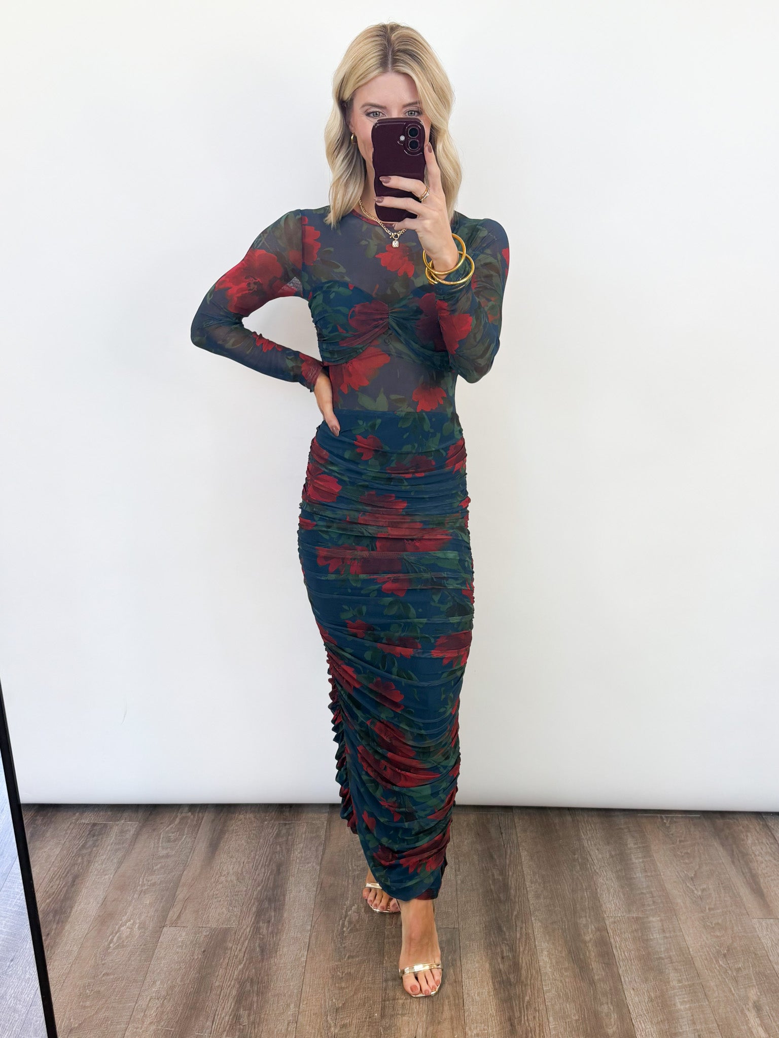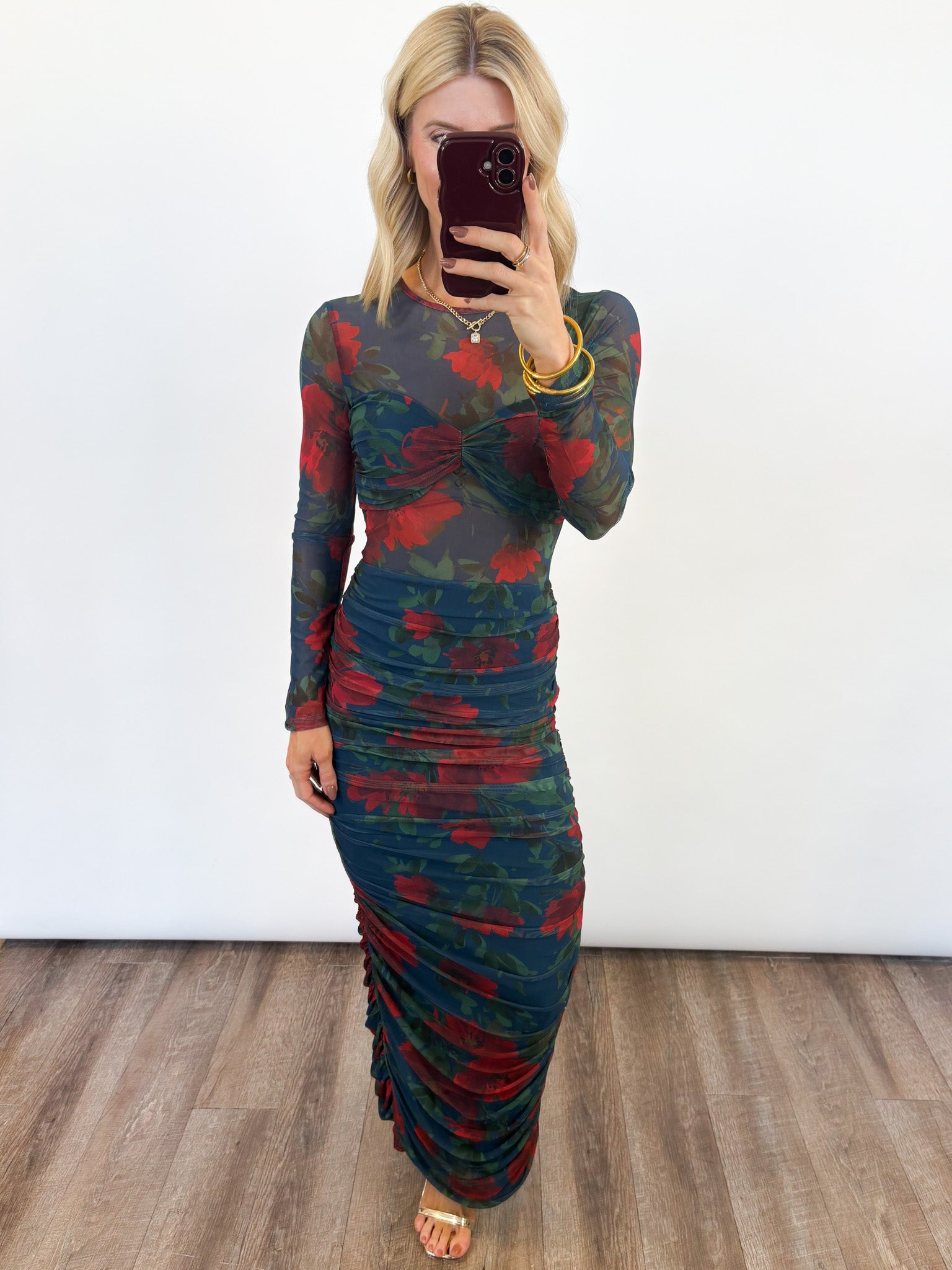 Make an unforgettable entrance in the Midnight Bloom Mesh Maxi Dress. This striking piece is crafted from a sheer mesh fabric with a bold red floral print set against a deep teal backdrop. The ruched bodice with twist-front detail enhances the bust, while the dramatic draping down the skirt creates a flattering, body-skimming silhouette. With its long sleeves and figure-hugging fit, this dress blends elegance with just the right amount of daring.