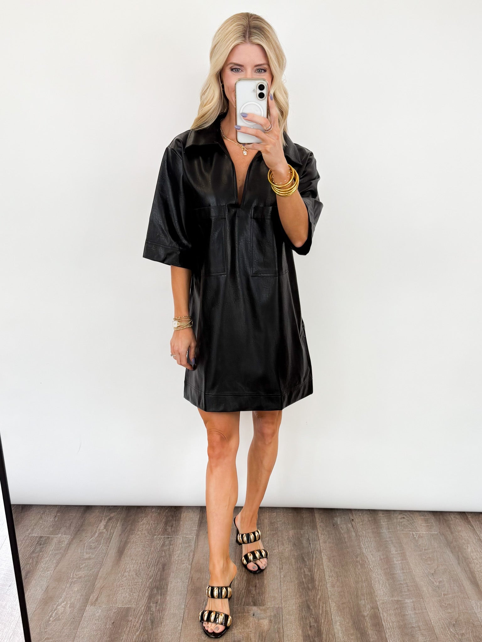 Turn heads with the bold sophistication of the Midnight Edge Faux Leather Dress. Designed with a structured collar, deep V-neckline, and front pockets, this dress balances edgy attitude with timeless style. The sleek faux leather finish gives it a modern, elevated look—perfect for nights out, special events, or when you simply want to stand out. Model is a size 0/24, 115lbs, 5'4" and wearing a small.