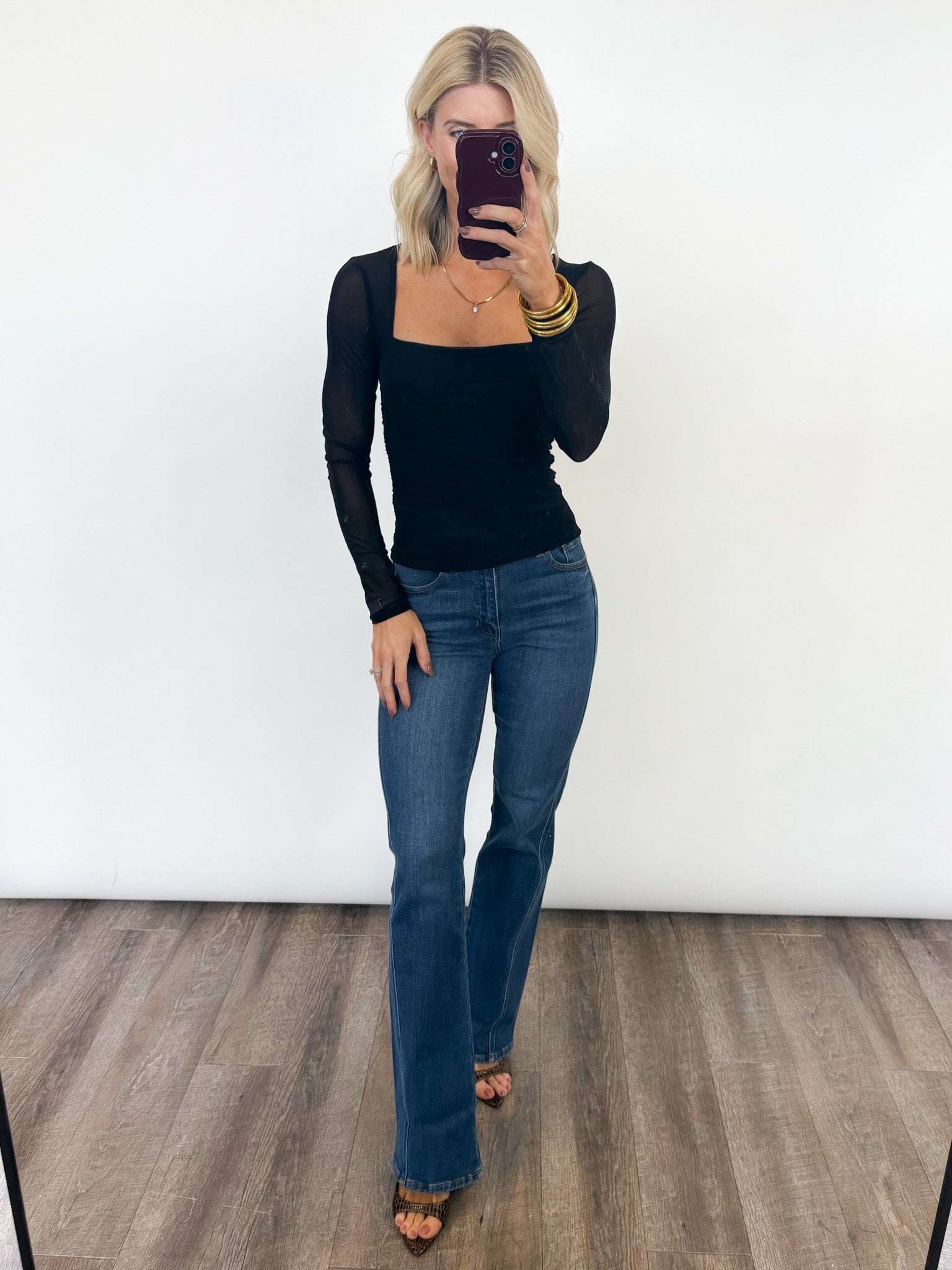 Edgy, chic, and just the right amount of daring — the Midnight Mesh Ruched Top is designed to turn heads. With its sheer mesh sleeves and ruched bodice, this piece brings a modern, flattering fit while adding a touch of allure to your look.