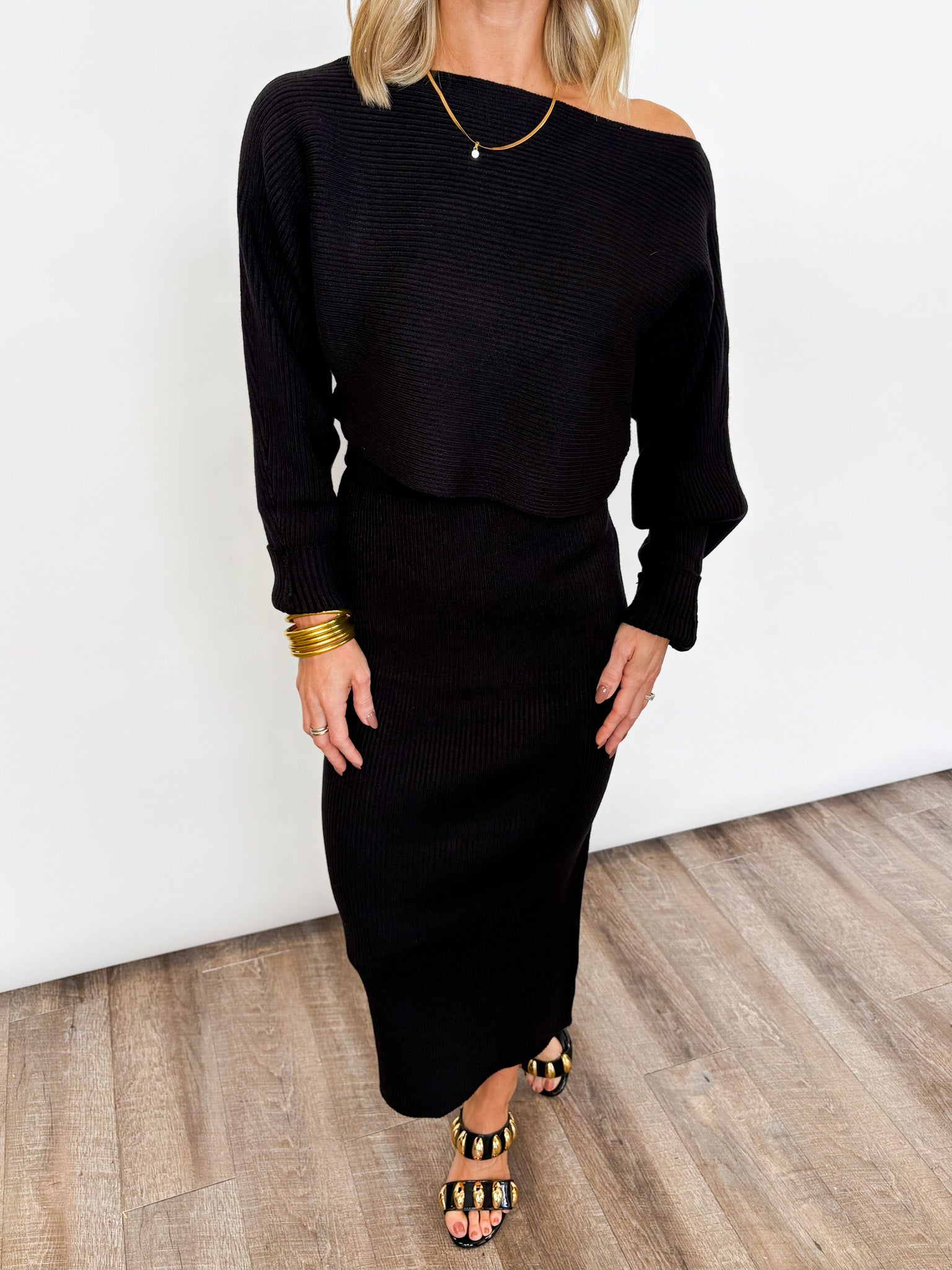 Chic, sleek, and effortlessly elevated—the Midnight Muse Off-Shoulder Knit Set is your new go-to for modern sophistication. This two-piece look features a ribbed off-the-shoulder long-sleeve crop top paired with a coordinating high-waisted knit midi skirt. The stretchy ribbed fabric creates a flattering, body-contouring fit while offering comfort and ease of movement. Perfect for a night out, date night, or styled separately for endless versatility.