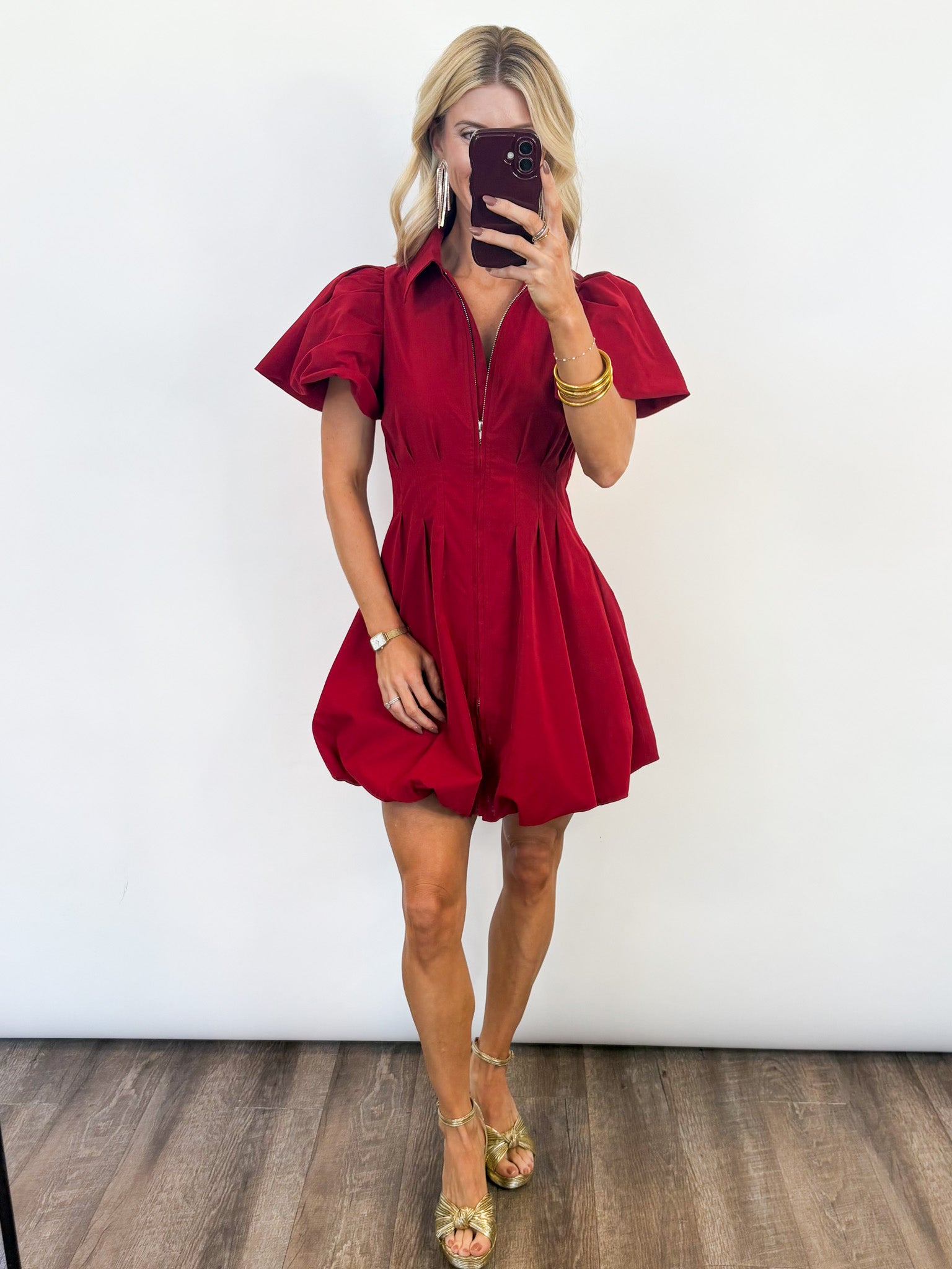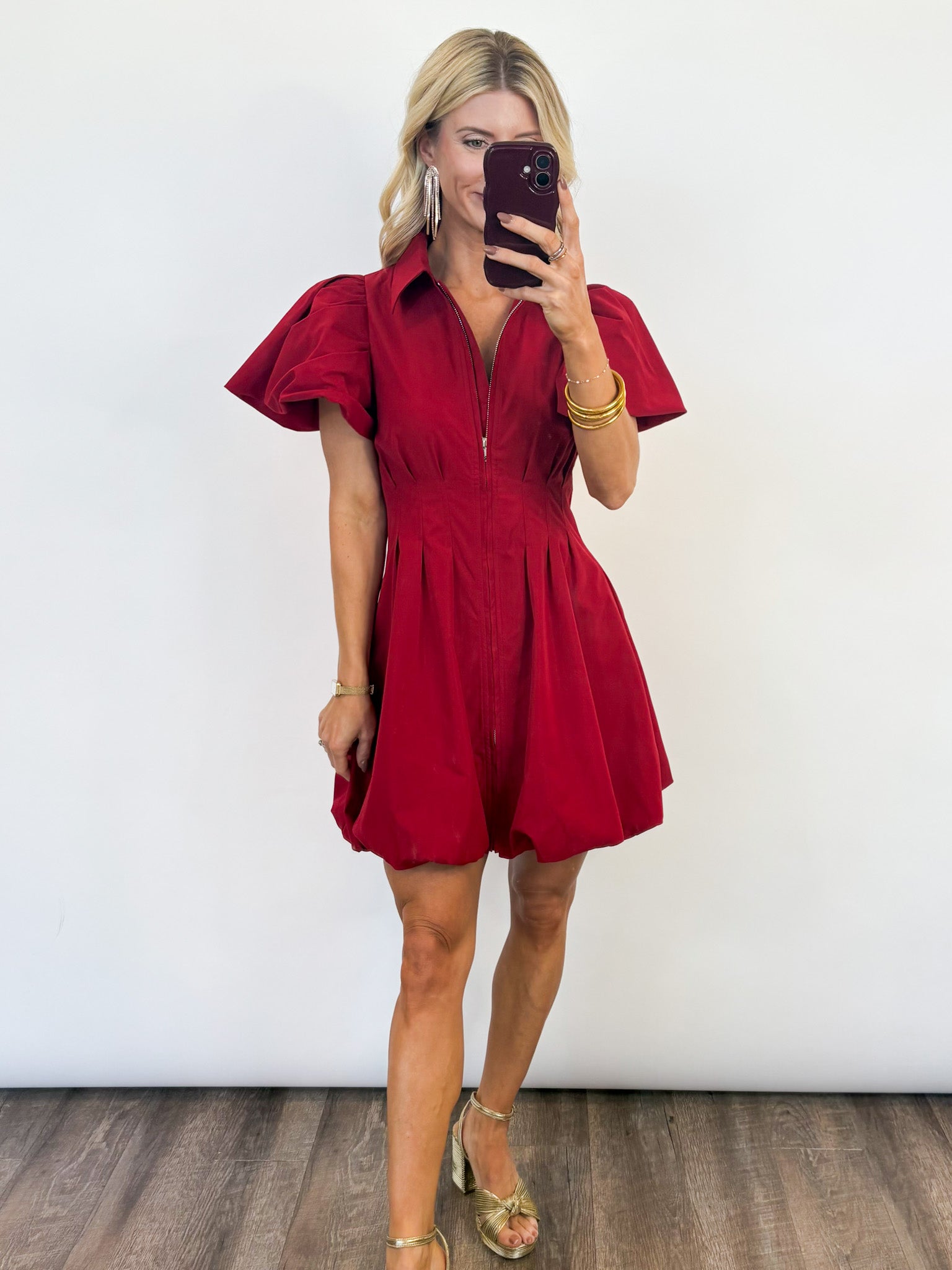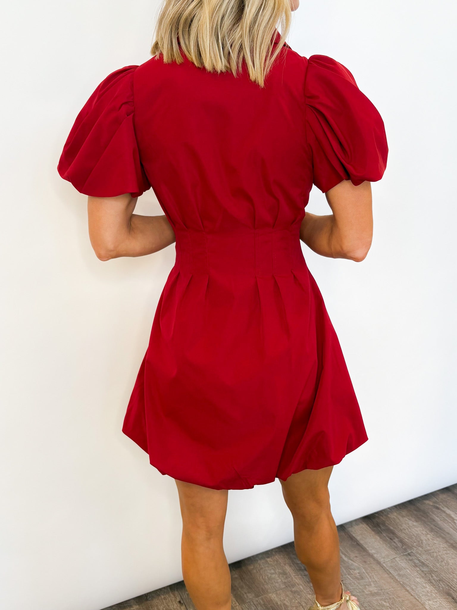Turn up the holiday magic in the Mistletoe Dress — your statement piece for festive celebrations, dinners, and every dazzling moment in between. This vibrant red mini dress features a collared neckline, structured short puff sleeves, and a front zipper that adds a modern edge. The subtle bubble hem gives it a playful silhouette that flatters and moves beautifully with you all night long.