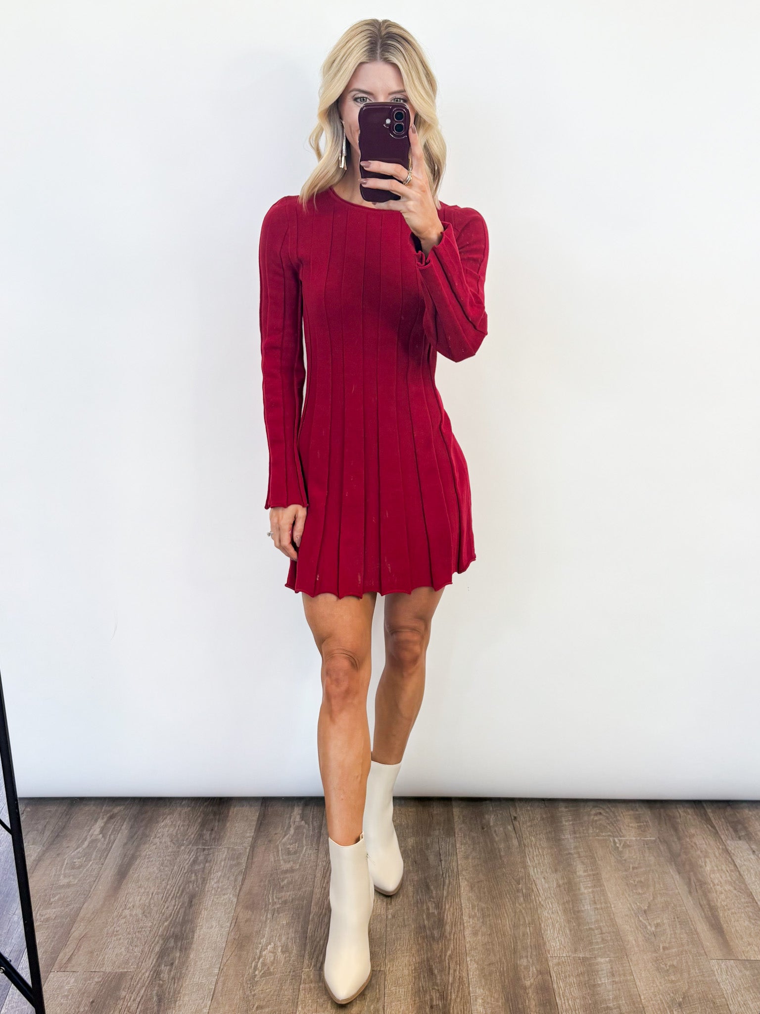 Make a bold statement with this chic ribbed knit dress, designed to flatter while keeping you comfortable. Featuring long sleeves, a classic crew neckline, and vertical ribbing that elongates the silhouette, this dress combines timeless elegance with cozy texture. The subtle flare at the hem adds a playful, feminine touch that transitions seamlessly from day to night. The rich red hue is perfect for all of your holiday events from Christmas photos, cookies with Santa, Teddy Bear Tea, and Christmas church!