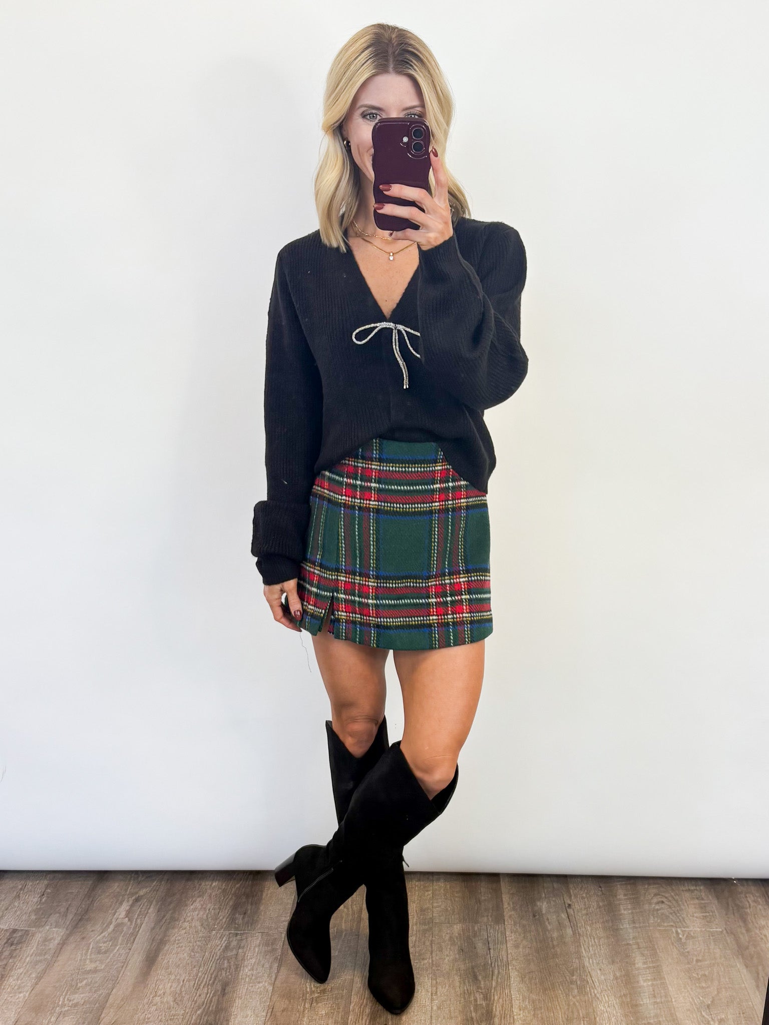 Tis the season for festive fashion! Our Mistletoe Plaid Skort brings classic holiday charm with a playful twist. Featuring a deep green base with traditional red, blue, and white tartan plaid, this skort perfectly blends the look of a mini skirt with the comfort and coverage of built-in shorts—ideal for holiday parties, photos, and all-day celebrating. A small front slit adds just the right touch of flirty detail, while the soft, cozy fabric keeps you feeling merry and bright all season long.
