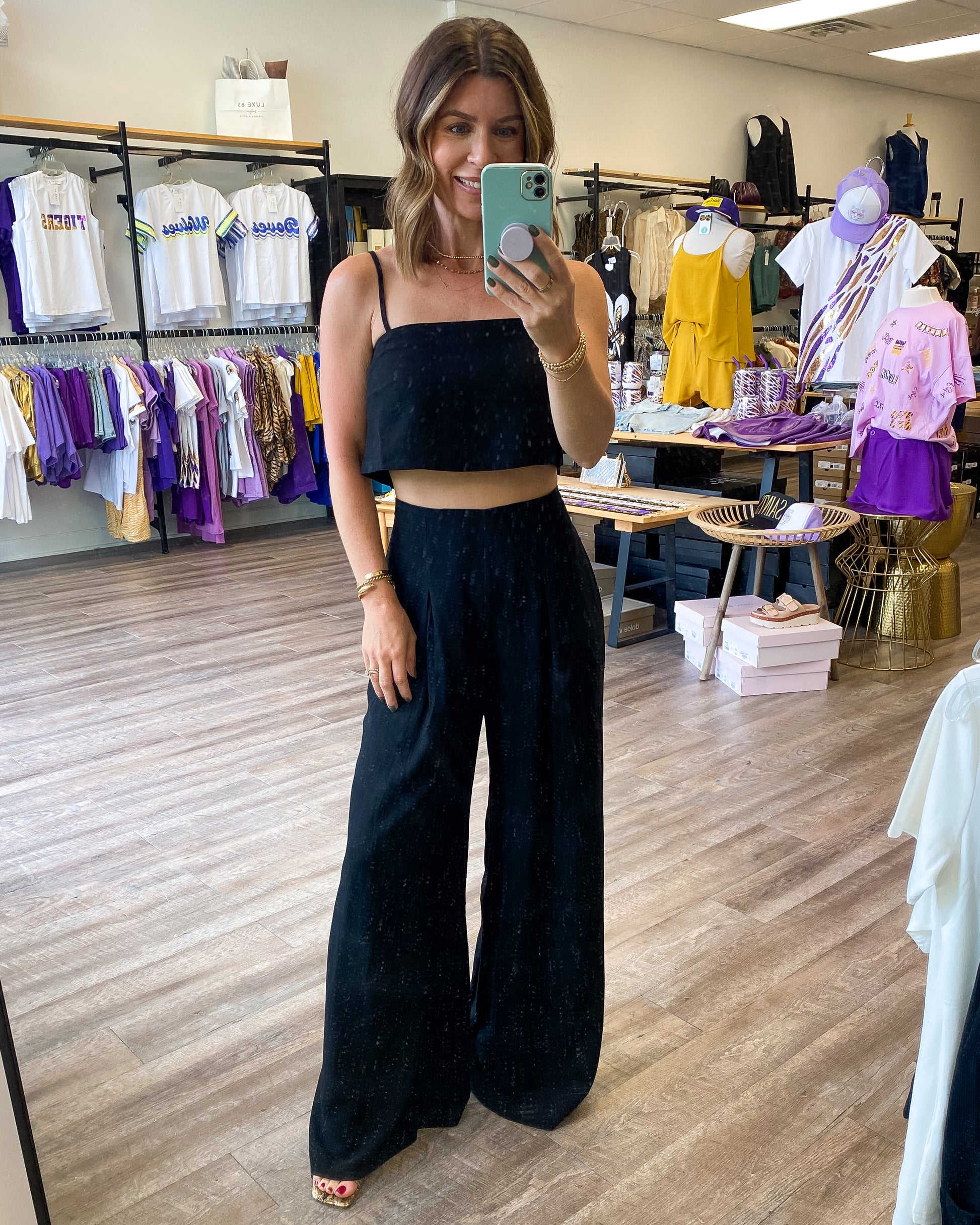 A stunning set is what every girl needs in her closet! This two piece, black set features a crop top with adjustable straps and back buttons. The pants have a pleated front with pockets and a back zipper. Our Nora Black Set will look great on your for girls night out! Fit is true to size.