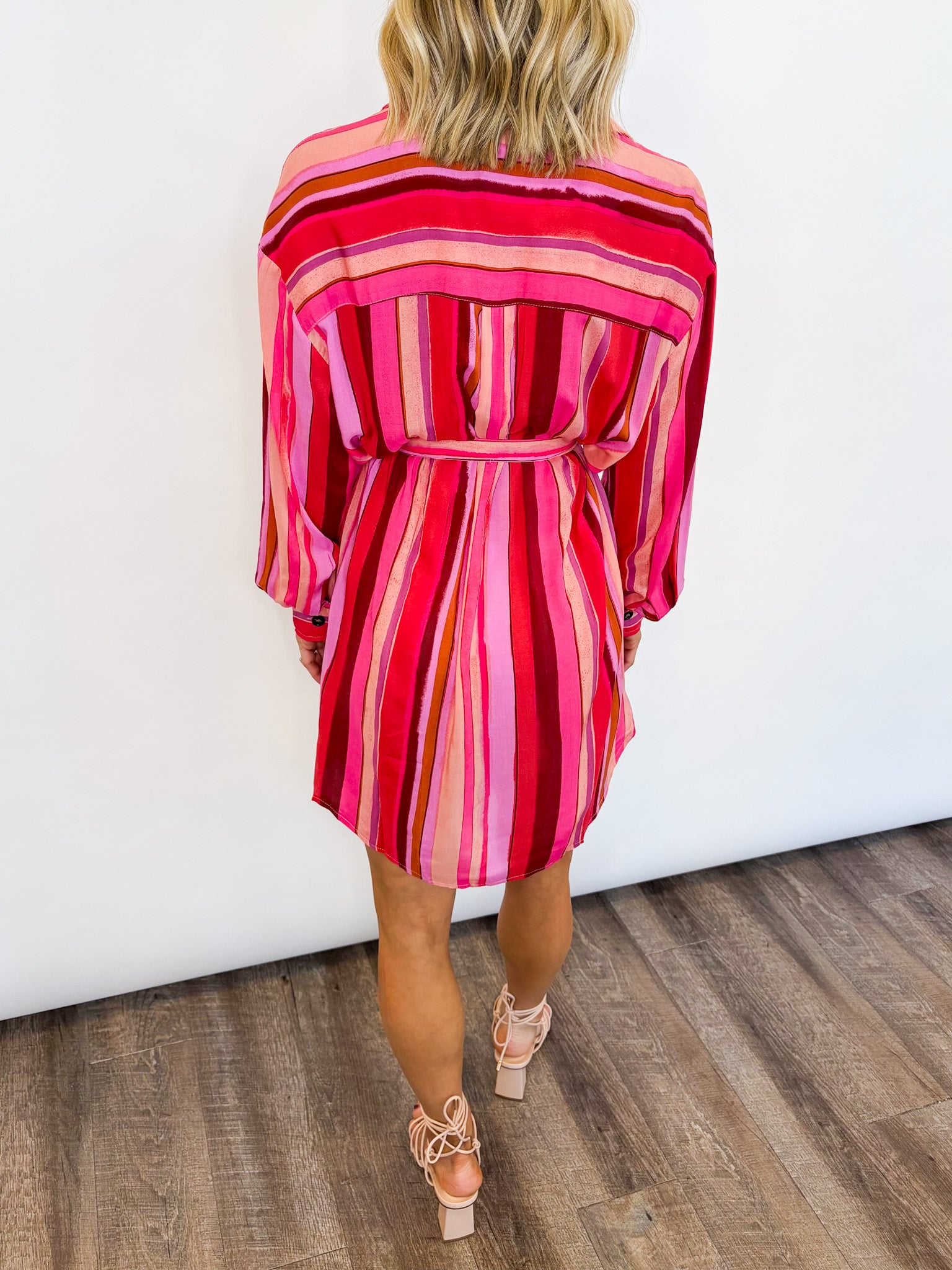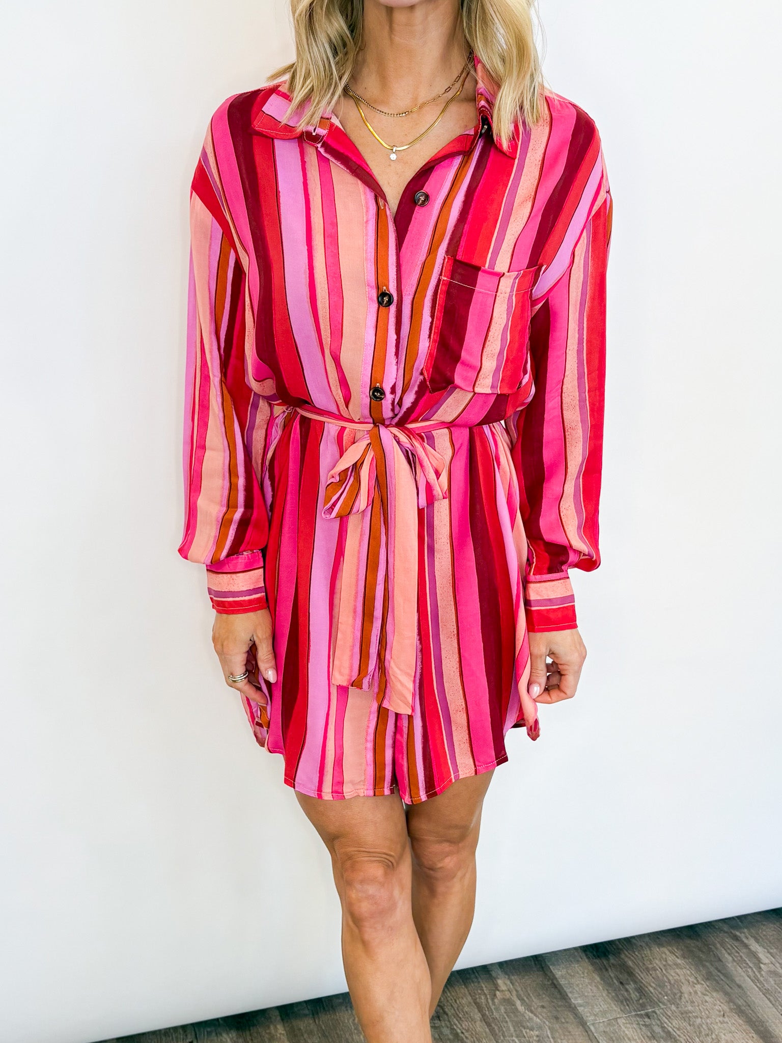 Bright, bold, and effortlessly chic, this striped shirt dress is made to stand out. Crafted from lightweight 100% rayon, it drapes beautifully for a soft, breezy feel you’ll love all day long. Featuring a classic button-front design, long sleeves, and a removable tie waist, this dress offers a flattering, customizable fit. The vibrant pink and red stripe pattern adds a fun pop of color, making it perfect for everything from days at the office to daytime outings to casual dinners.