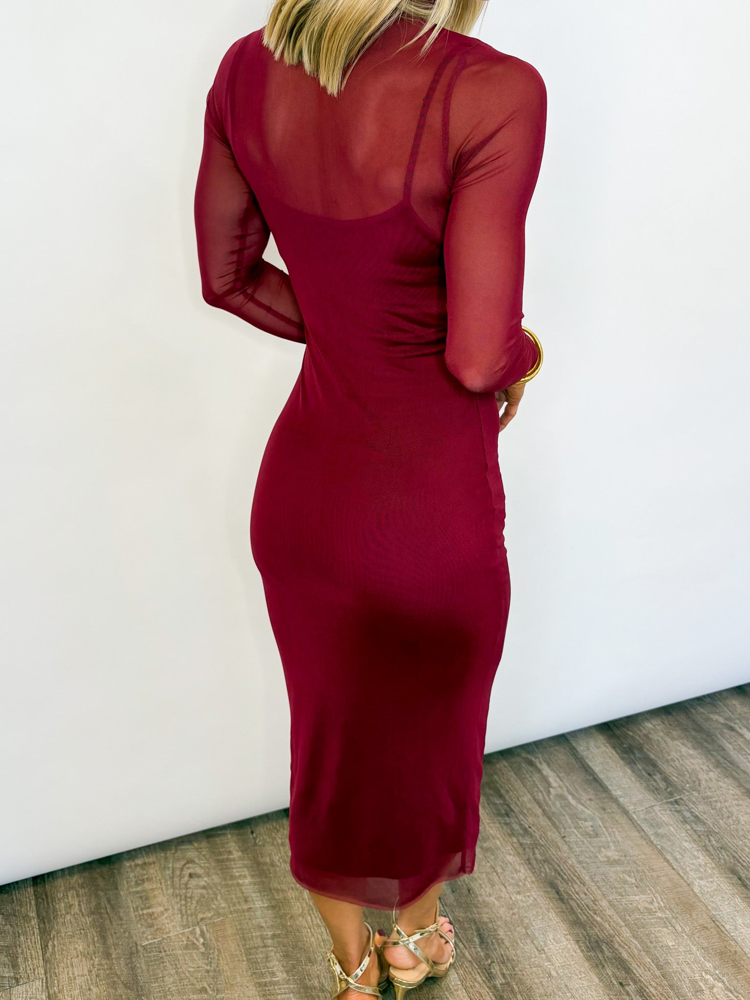 Step into the season of sparkle and sophistication with the Shannon Dress in Wine. This stunning midi dress captures the magic of the holidays with its rich, deep hue and effortlessly elegant silhouette. Designed with a sleek turtleneck, fitted long sleeves, and a figure-hugging stretch mesh overlay, it’s the perfect blend of classy and captivating. Whether you’re heading to a holiday soirée, a winter wedding, or ringing in the New Year, this dress guarantees a moment to remember. Style it with metallic heels and statement earrings for a festive finish that shines under the lights.