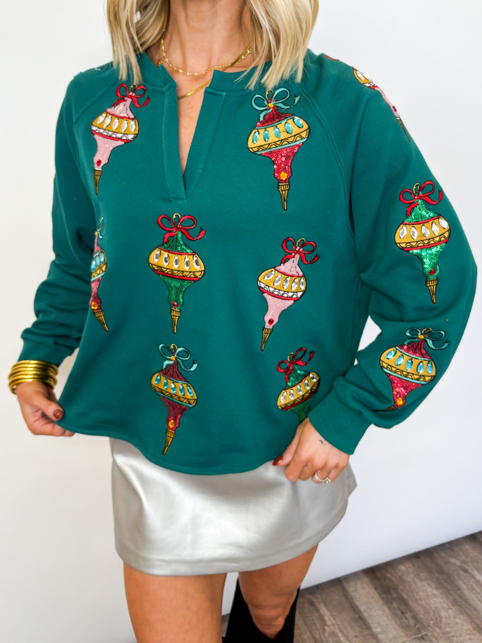 Get into the holiday spirit in the most stylish way with our Sleigh Bells Sweatshirt! This cozy dark teal pullover is decked out with dazzling sequin and rhinestone ornament designs that catch the light beautifully—perfect for holiday parties, cookie baking nights, or festive photos with the fam.