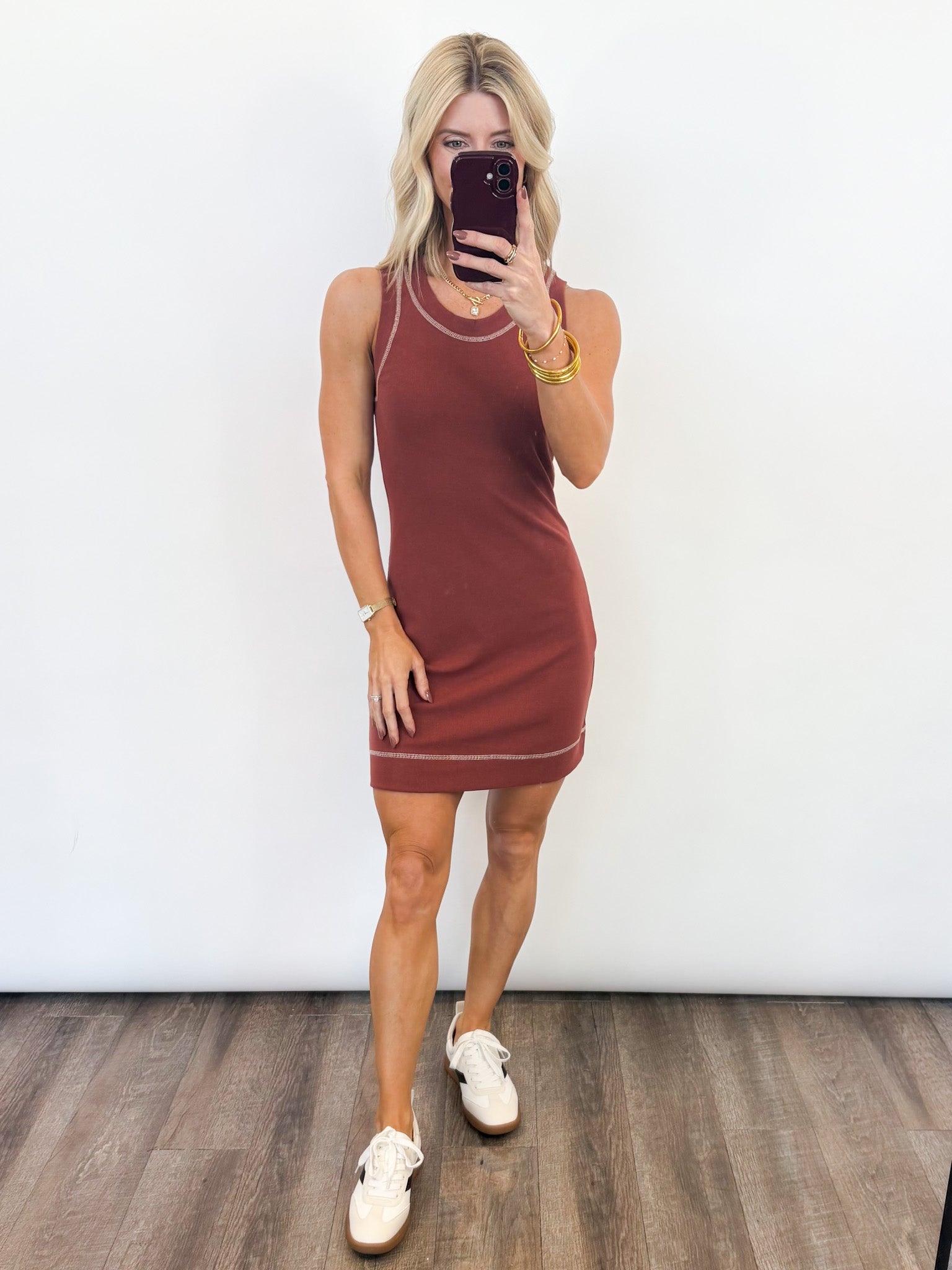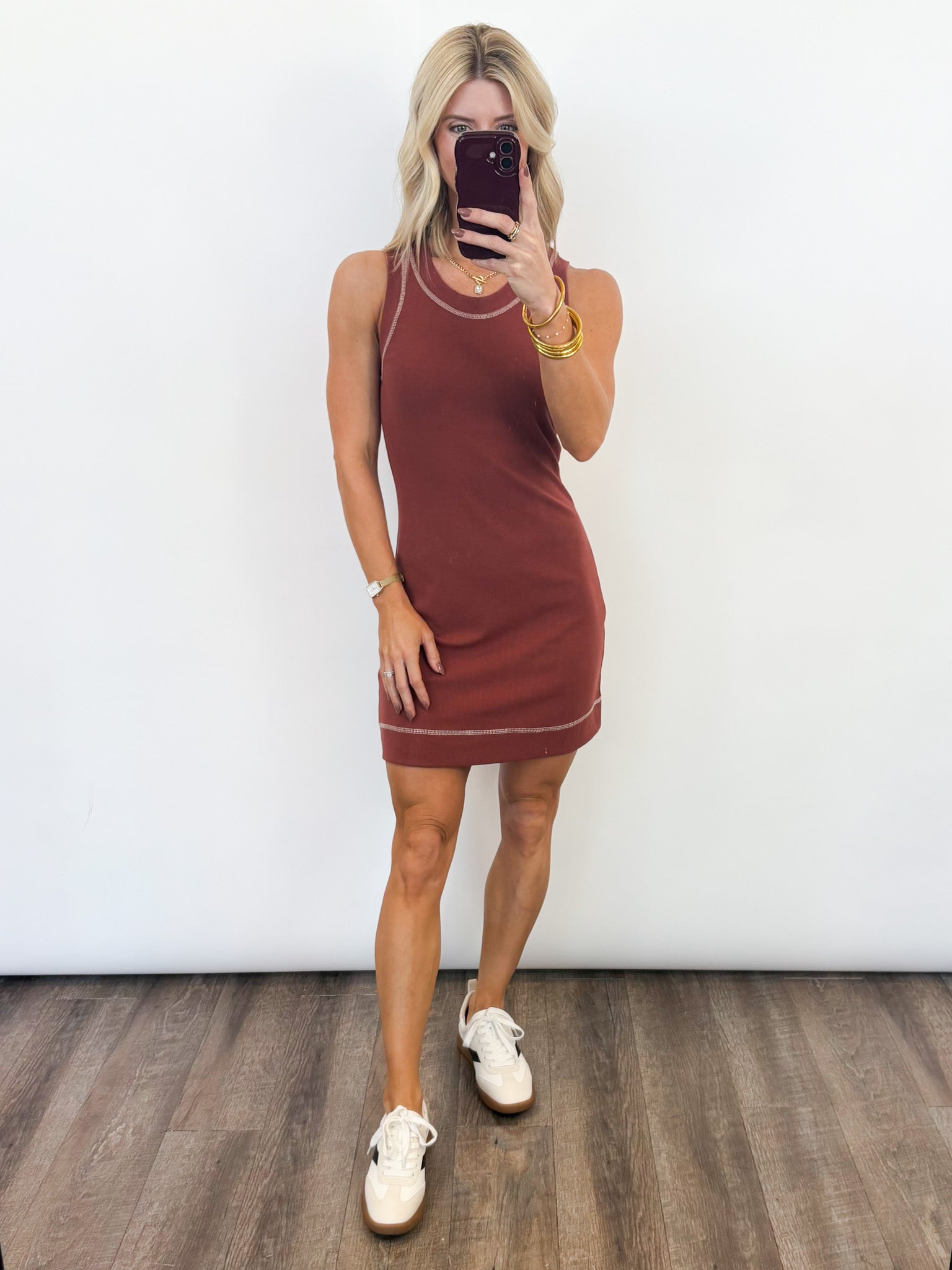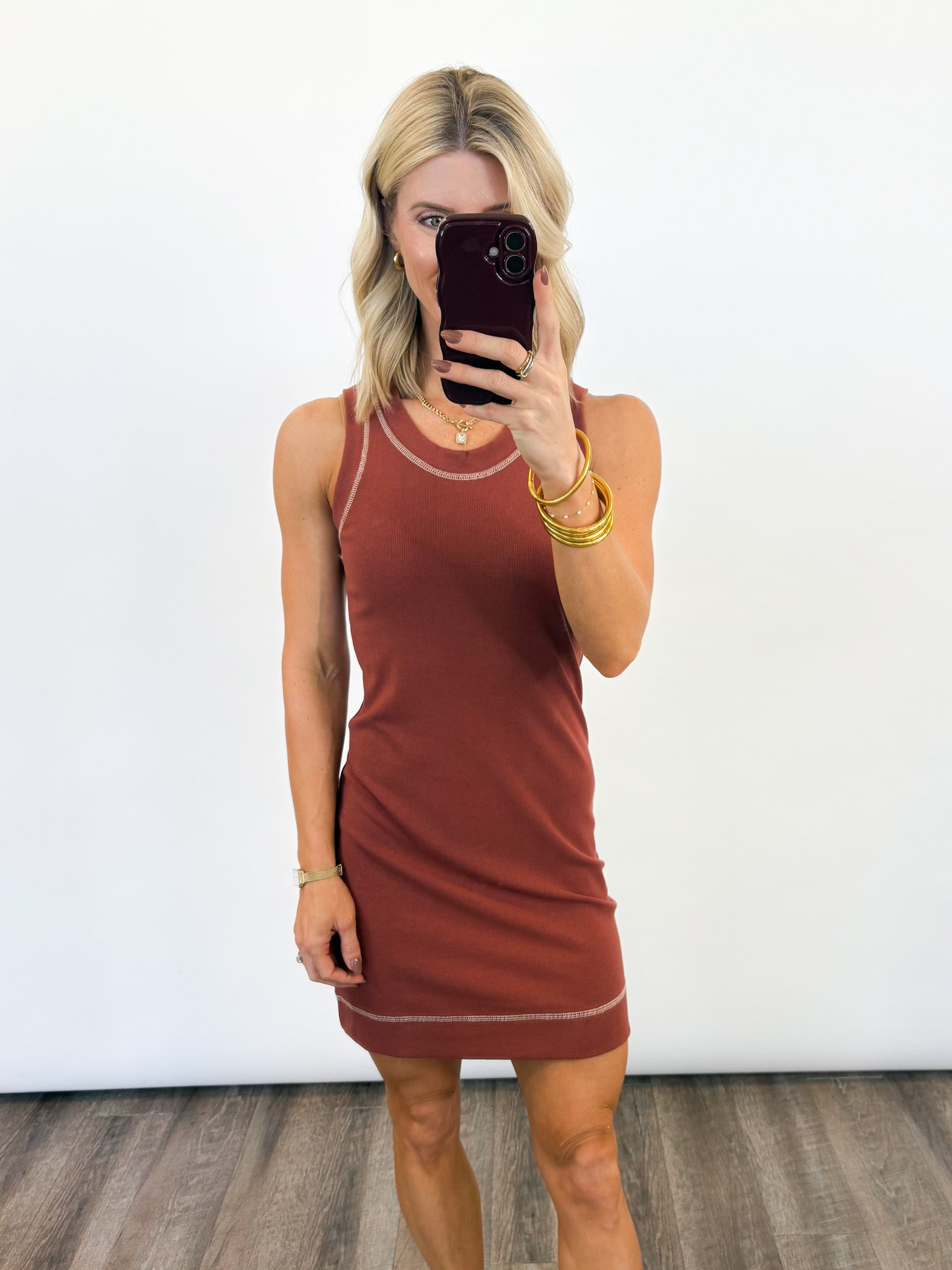 Simple, sleek, and effortlessly versatile—the Terra Tank Dress is a must-have staple for every season. Designed in a warm rust hue with contrast stitch detailing, this sleeveless dress combines casual ease with just the right touch of edge. The straight silhouette makes it easy to wear on its own or layered with jackets and cardigans for a styled-up look.