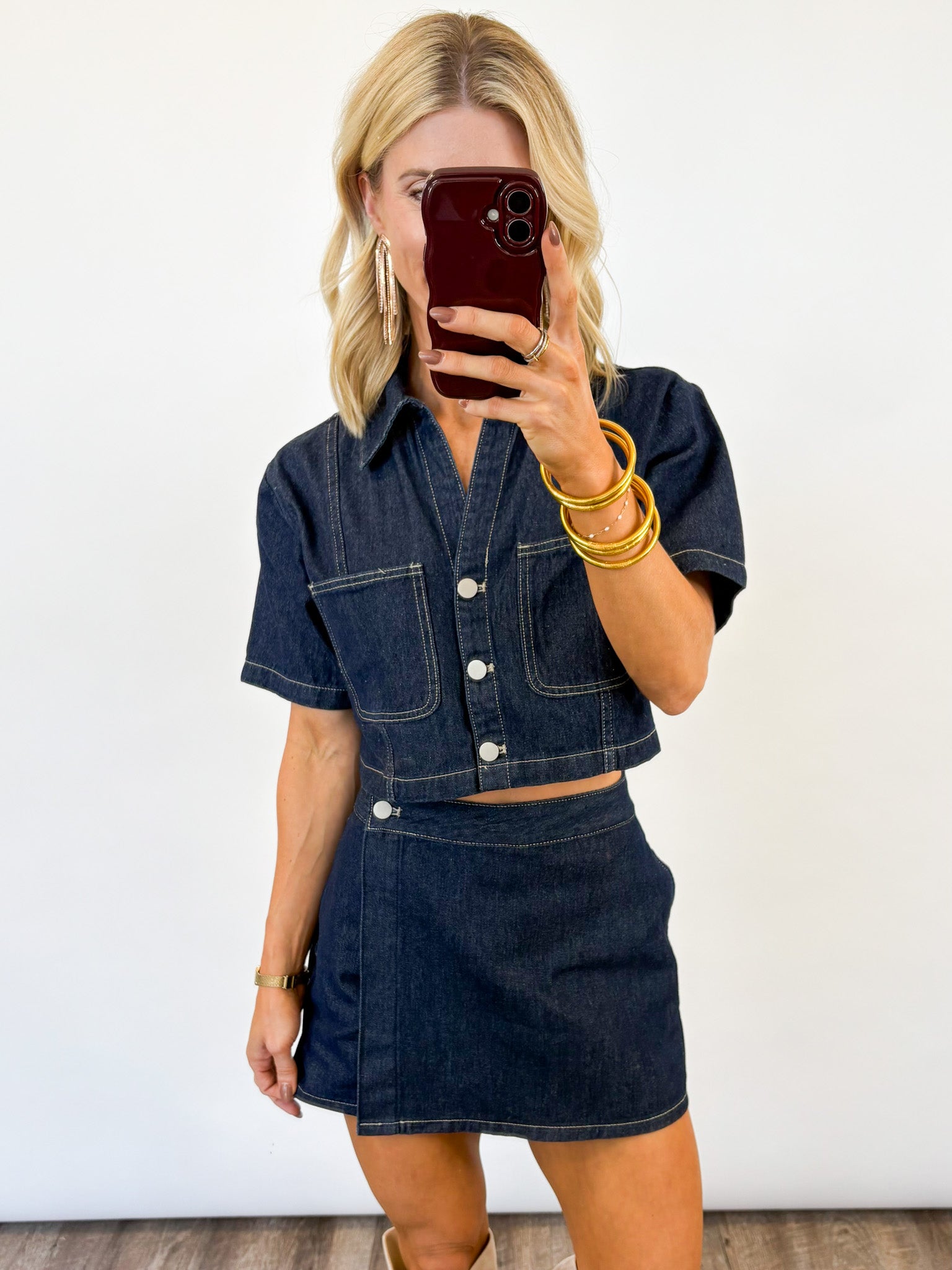 Effortlessly cool and undeniably chic, the Downtown Denim Set is your new favorite match made in denim heaven. This two-piece set features a cropped short-sleeve button-up top and a coordinating mini skirt with a flattering wrap-style silhouette. The dark wash gives it a sleek, elevated edge while still keeping that casual-cool vibe you love. Perfect for brunch, concerts, or a night out downtown—this set is all about making denim look fresh.