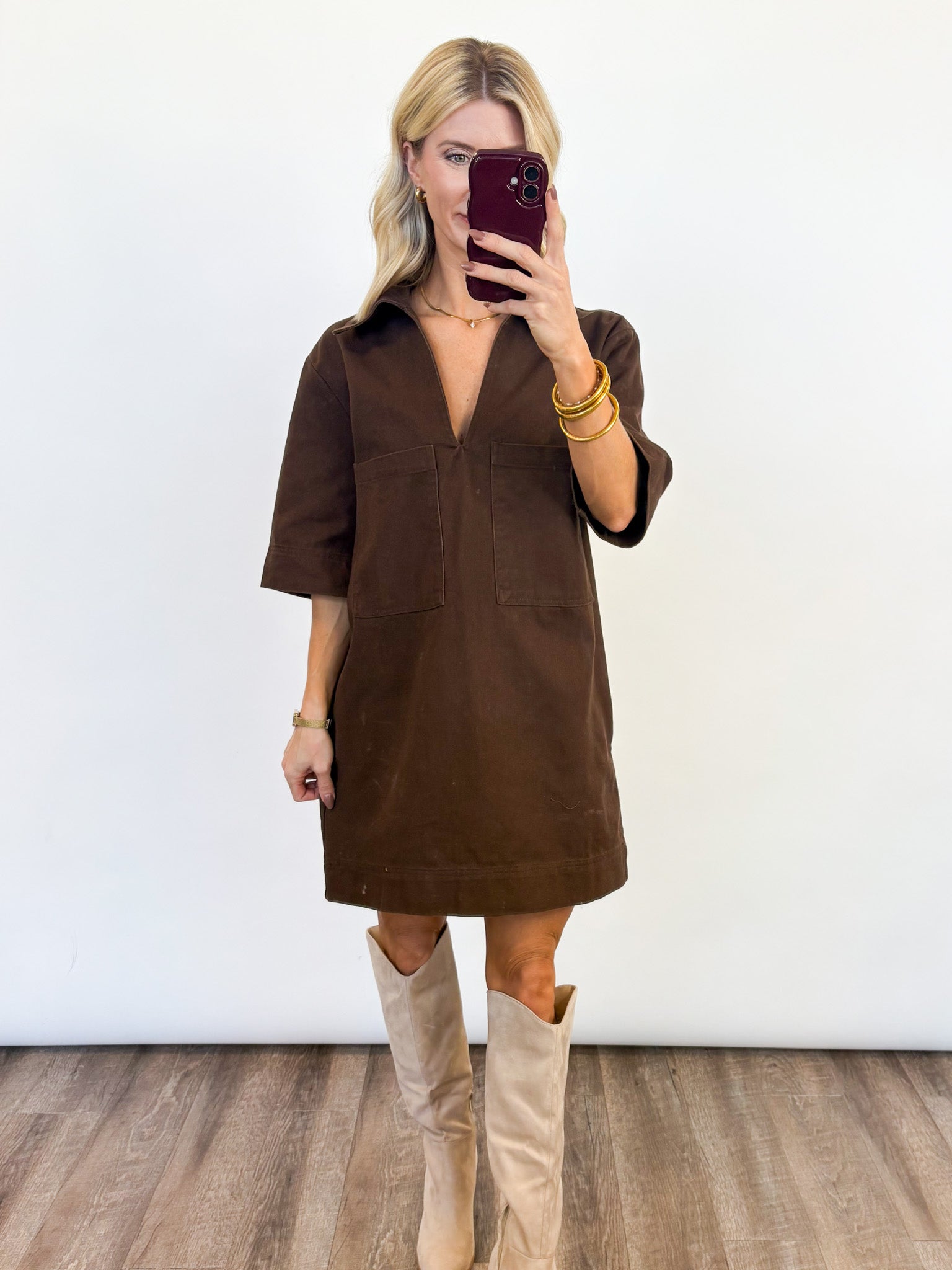 Effortlessly cool with a touch of utility charm, The Ruston Dress brings structure and ease together in one versatile piece. Crafted from a durable, soft cotton canvas, this short-sleeve mini dress channels a laid-back yet refined vibe—perfect for casual days or dressed-up moments with boots and gold jewelry. Designed with a relaxed silhouette, deep V-neckline, and oversized patch pockets, it delivers a modern take on classic workwear. Whether layered over a fitted turtleneck or worn solo with sneakers, this dress transitions seamlessly through seasons.