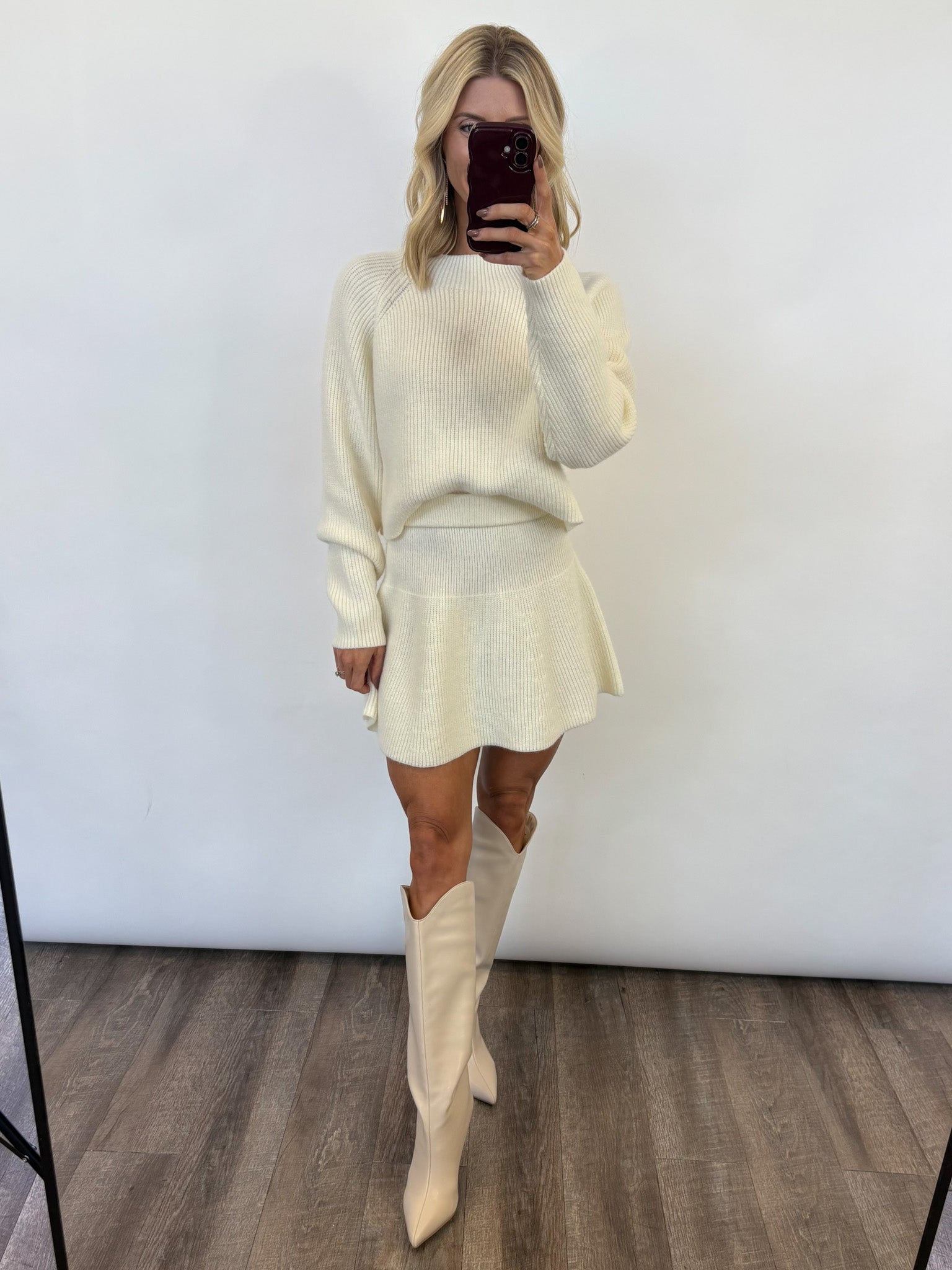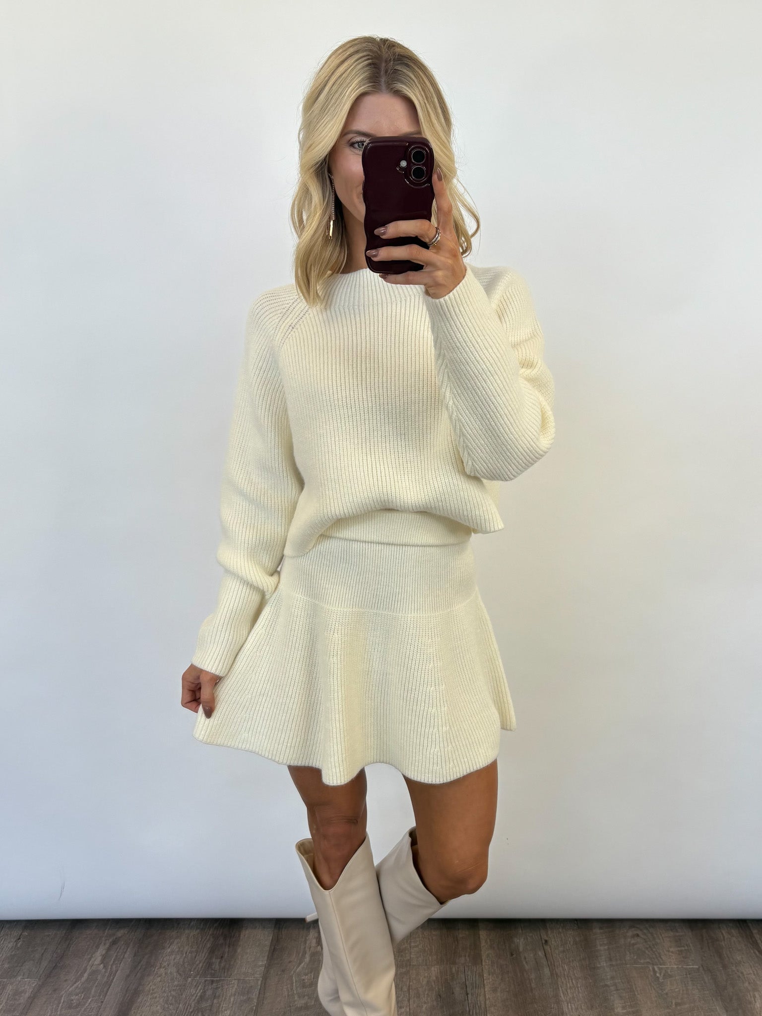 Cozy meets chic in the Snowfall Set, your new go-to for all things merry and bright. This soft knit matching set features a relaxed-fit sweater and a flared mini skirt that come together for a look that’s effortlessly elevated yet perfectly comfortable. The creamy ivory hue gives off that dreamy, winter-white vibe—ideal for holiday parties, fireside gatherings, or a snowy weekend getaway.