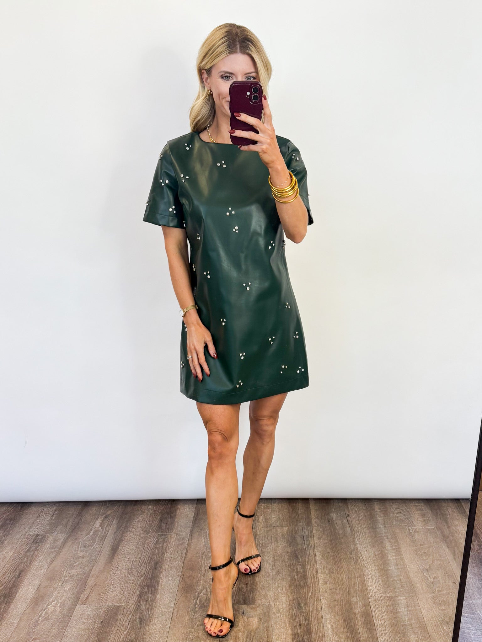 Step into the holiday season with sleek sophistication in the Under The Mistletoe Dress. This deep green faux leather mini brings festive charm with a modern edge, featuring scattered rhinestone embellishments that mimic twinkling holiday lights and mistletoe berries. Its structured shift silhouette gives a polished yet comfortable fit—perfect for merry nights out, holiday parties, or Christmas cocktails. With short sleeves, a high neckline, and a hidden back zipper, this dress is effortless to wear while making a statement that’s equal parts chic and cheerful.