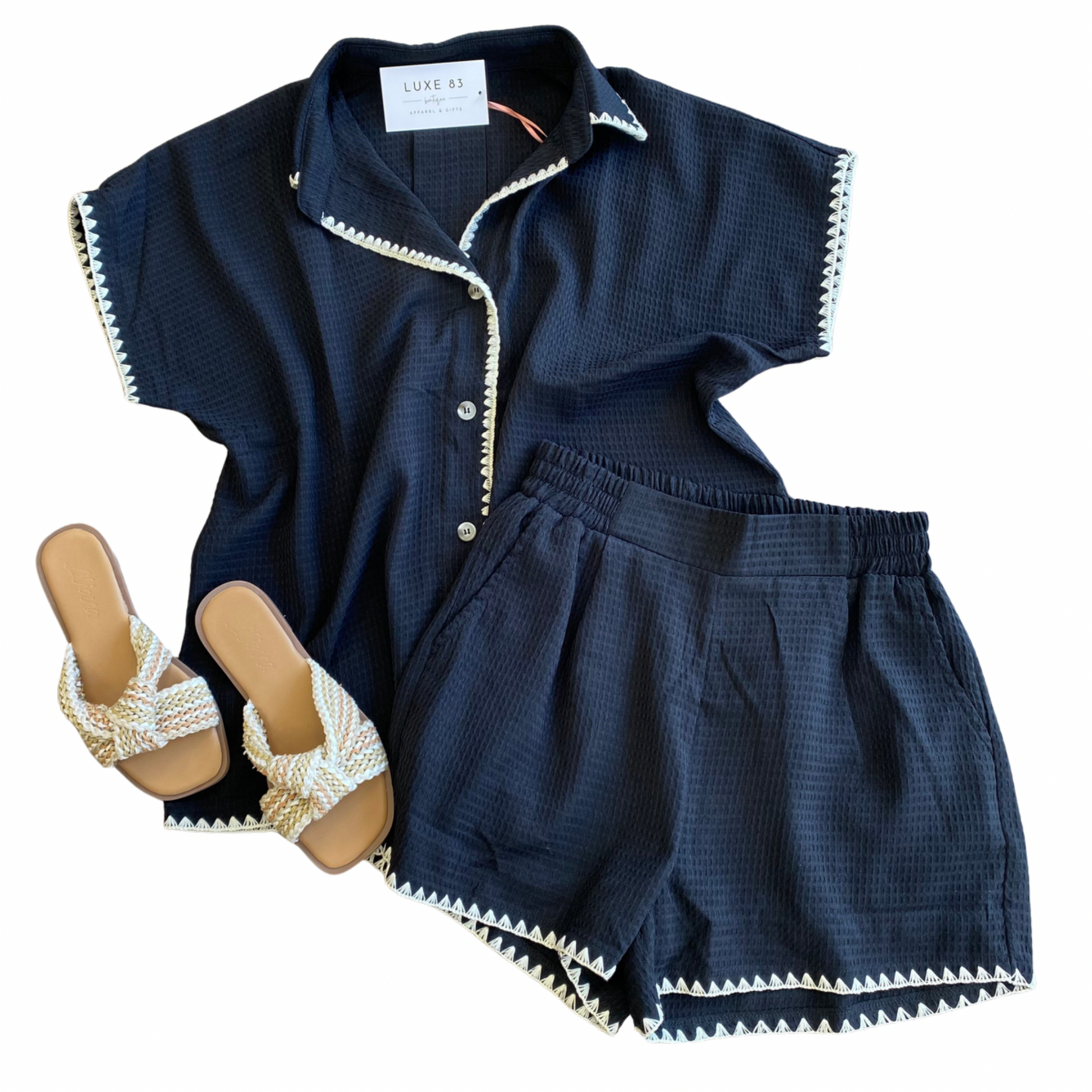 Another cute set for the win! Our Victoria Black set features a waffle, textured fabric throughout with white trim stitching. The top has a button front with collar and the shorts have an elastic back waist with pockets. We love this lightweight set for Summer paired with your favorite sandals or wedges. Fit is true to size.