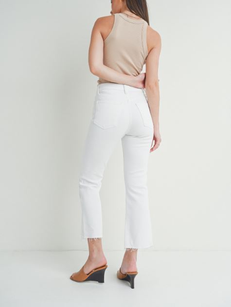 Don't wait on these ladies... they will FLY out! We are PICKY when it comes to white jeans, and these do not disappoint! Raw hem, 10" rise and 26" inseam. Fit true to size..